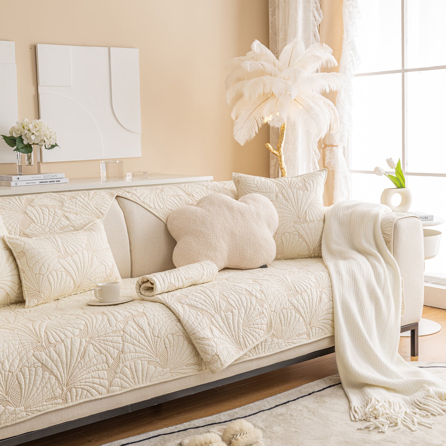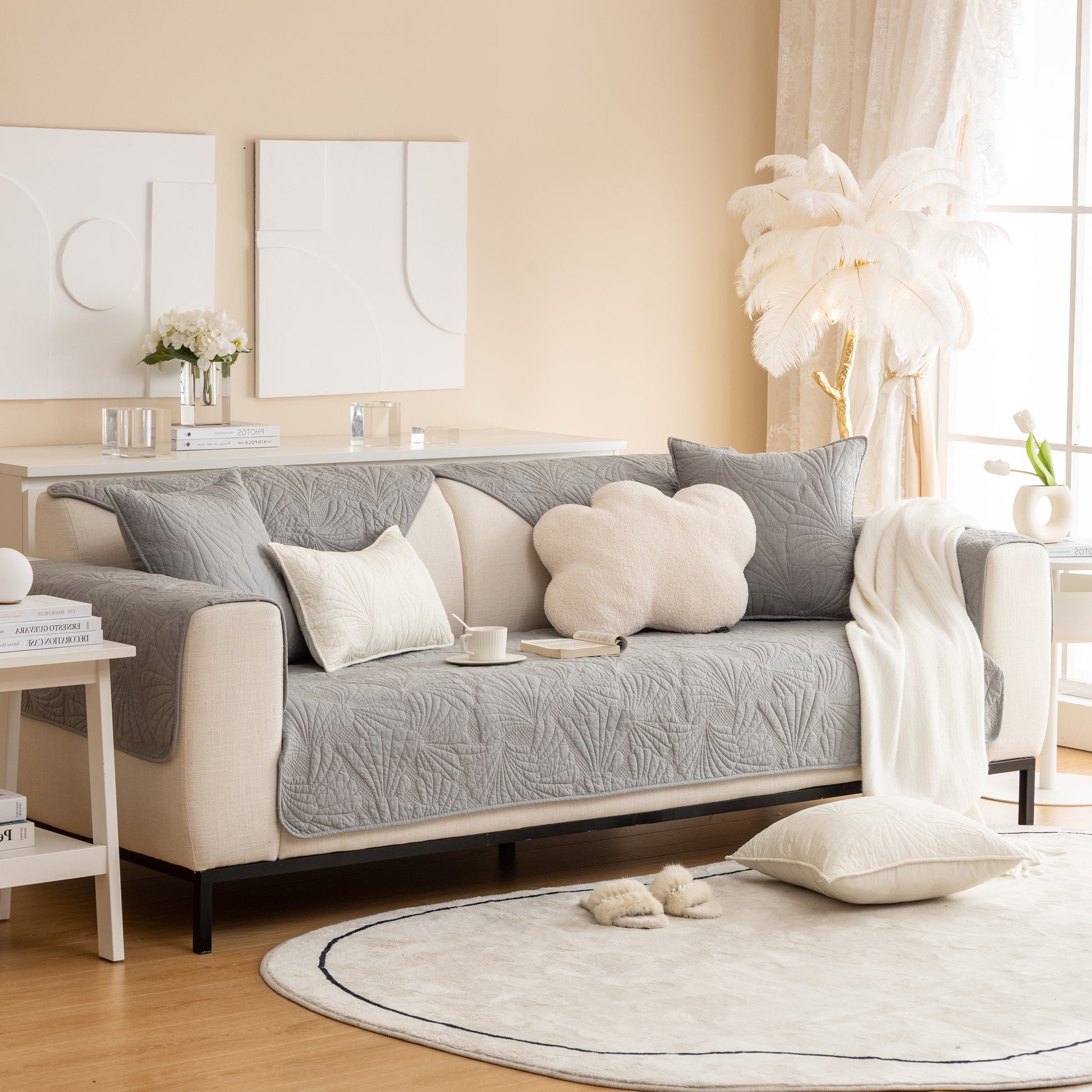 Dieser hochwertige gesteppte Sofabezug bringt ruhige Eleganz in Ihr Zuhause mit seiner skulpturalen Ginkgo-Blatt-Stickerei und der weichen, 100% natürlichen Baumwollkonstruktion. Das dicke, baumwollgepolsterte Innere bietet zusätzlichen Sitzkomfort, während die Rückseite mit dichten Silikonkugeln ausgekleidet ist, um den Bezug sicher an Ort und Stelle zu halten, ohne Ihr Sofa zu beschädigen.