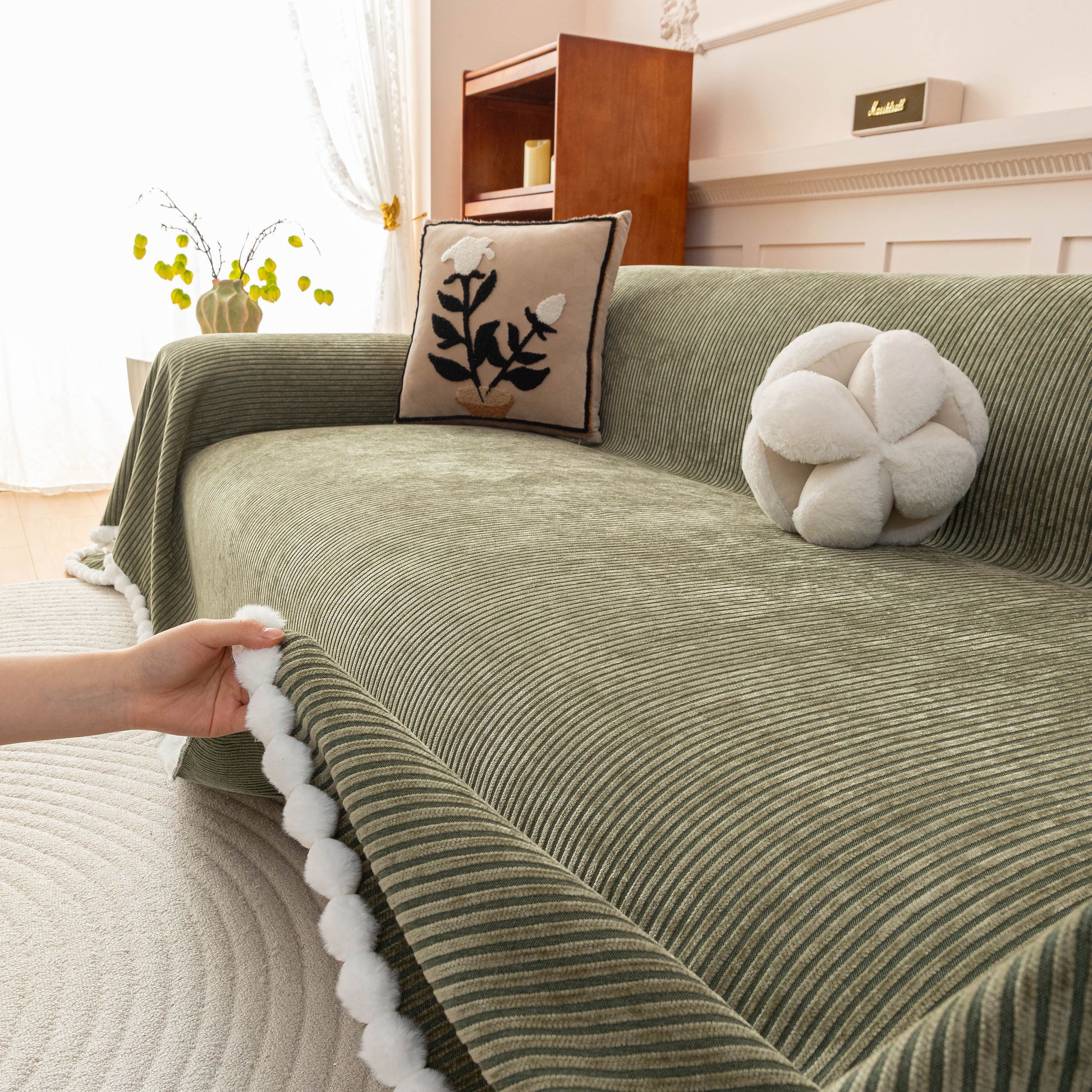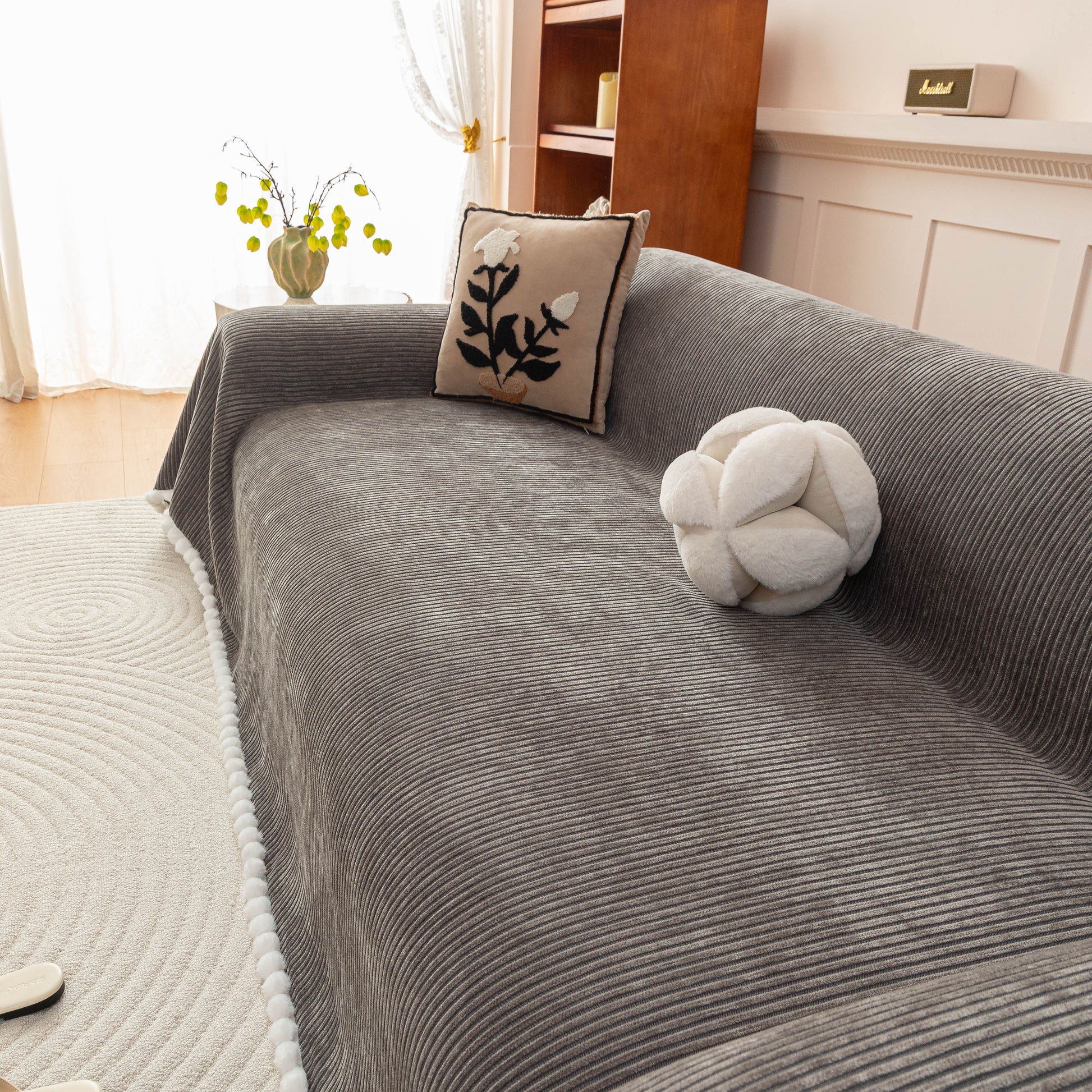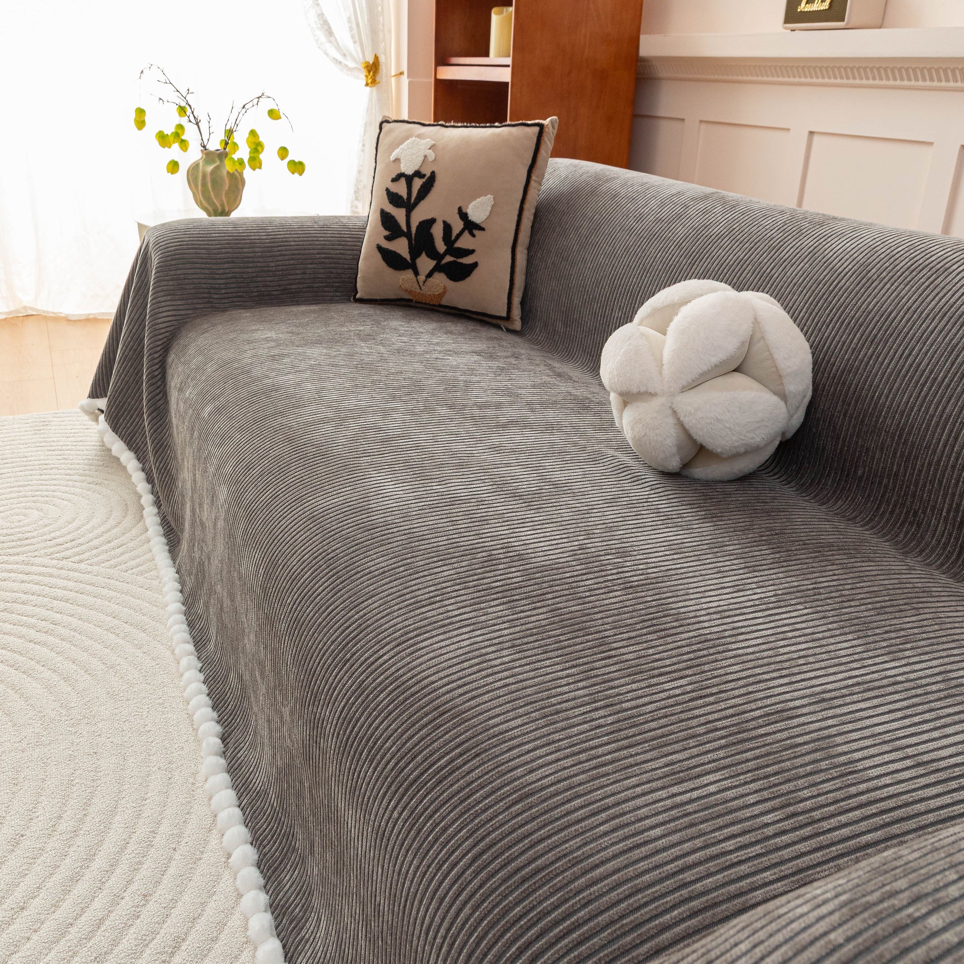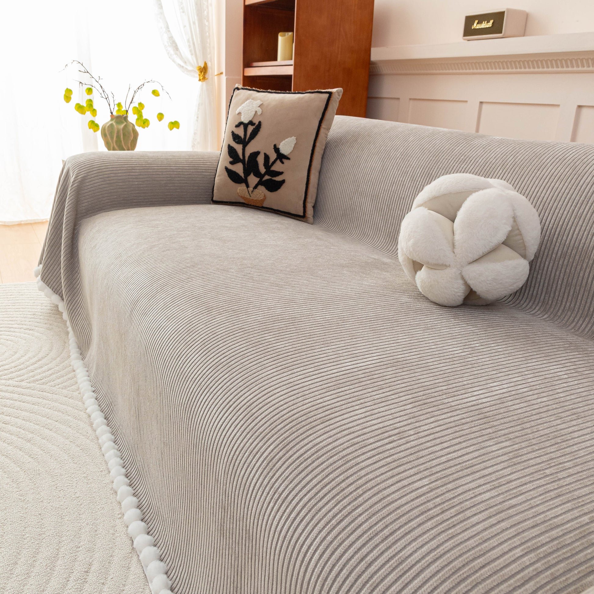 Upgrade your sofa with the Slipcover KAS™ chenille sofa cover throw. Featuring a textured striped design with pom-pom trim, it brings a cozy, stylish touch to your space while protecting against pets, spills, and daily wear. Soft, breathable, and washable—perfect for effortless comfort and home decor.