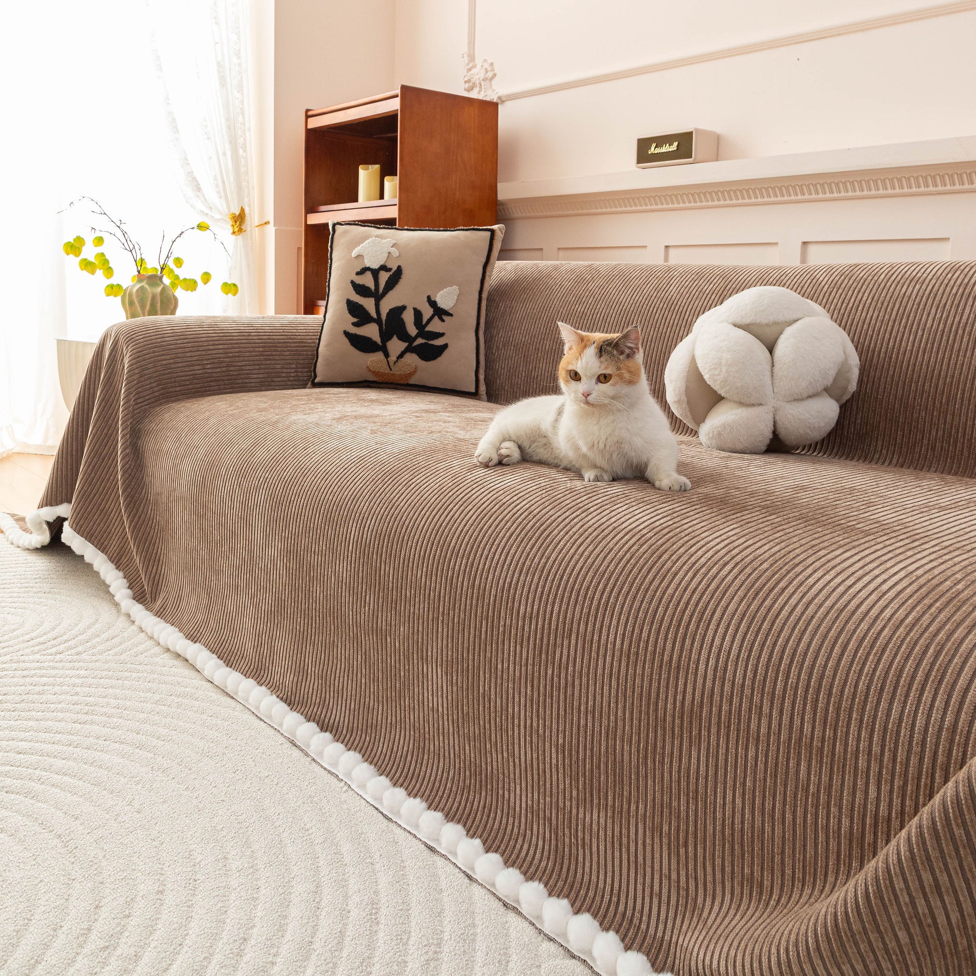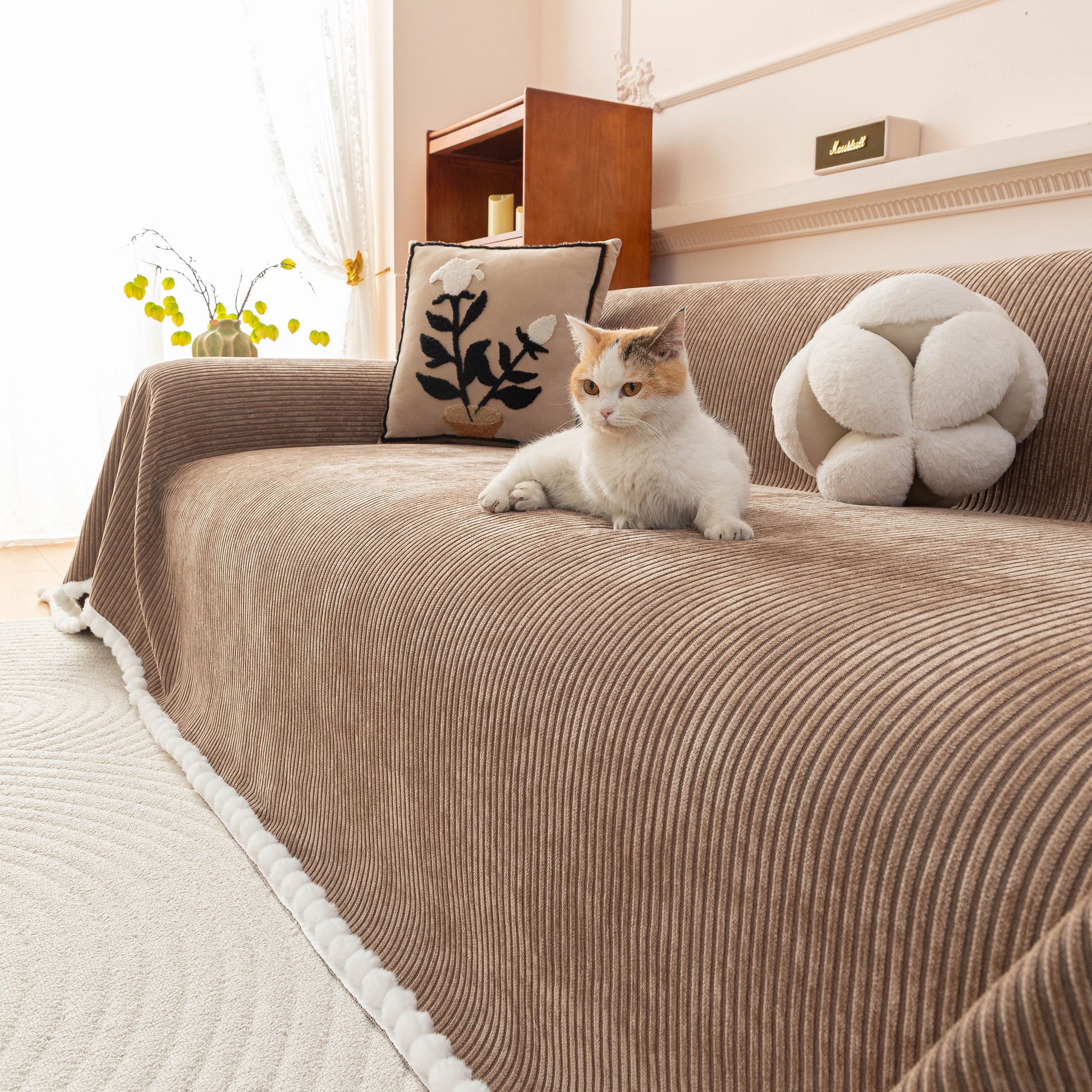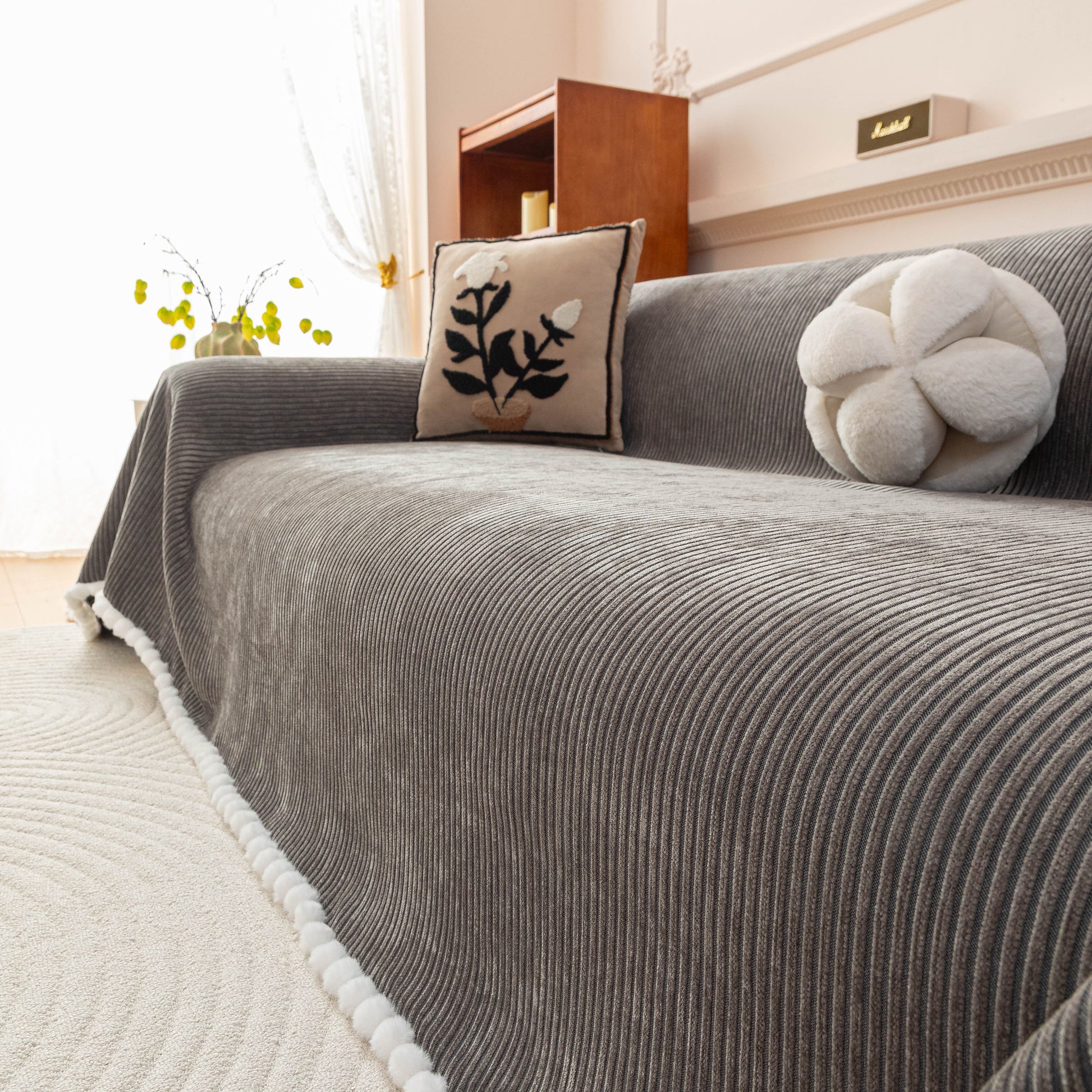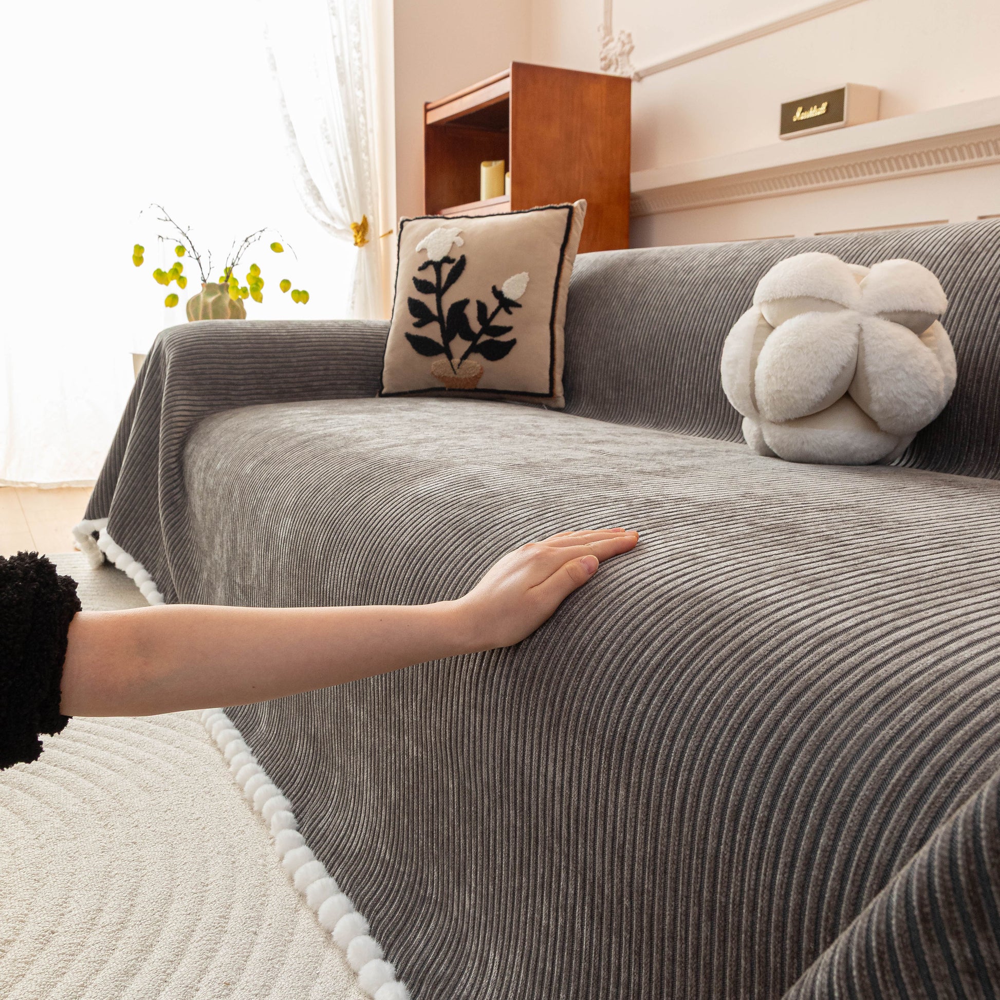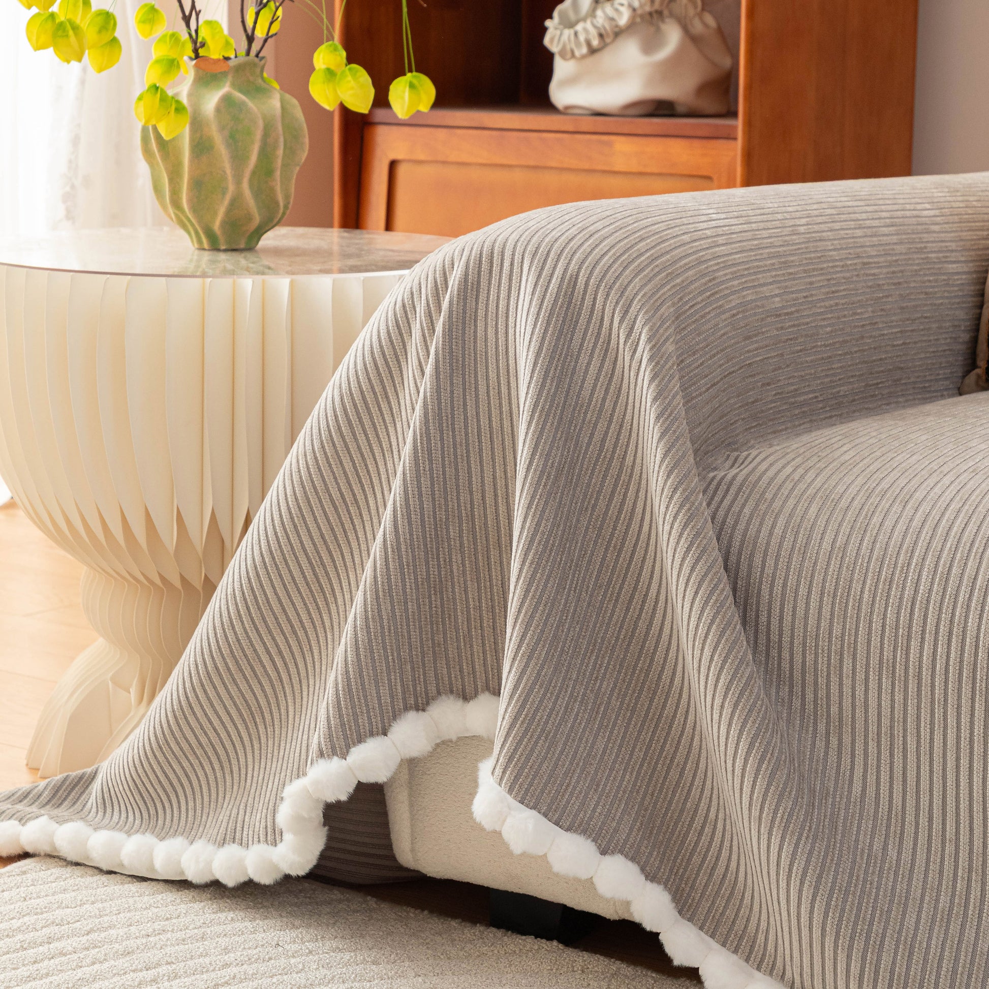 Upgrade your sofa with the Slipcover KAS™ chenille sofa cover throw. Featuring a textured striped design with pom-pom trim, it brings a cozy, stylish touch to your space while protecting against pets, spills, and daily wear. Soft, breathable, and washable—perfect for effortless comfort and home decor.