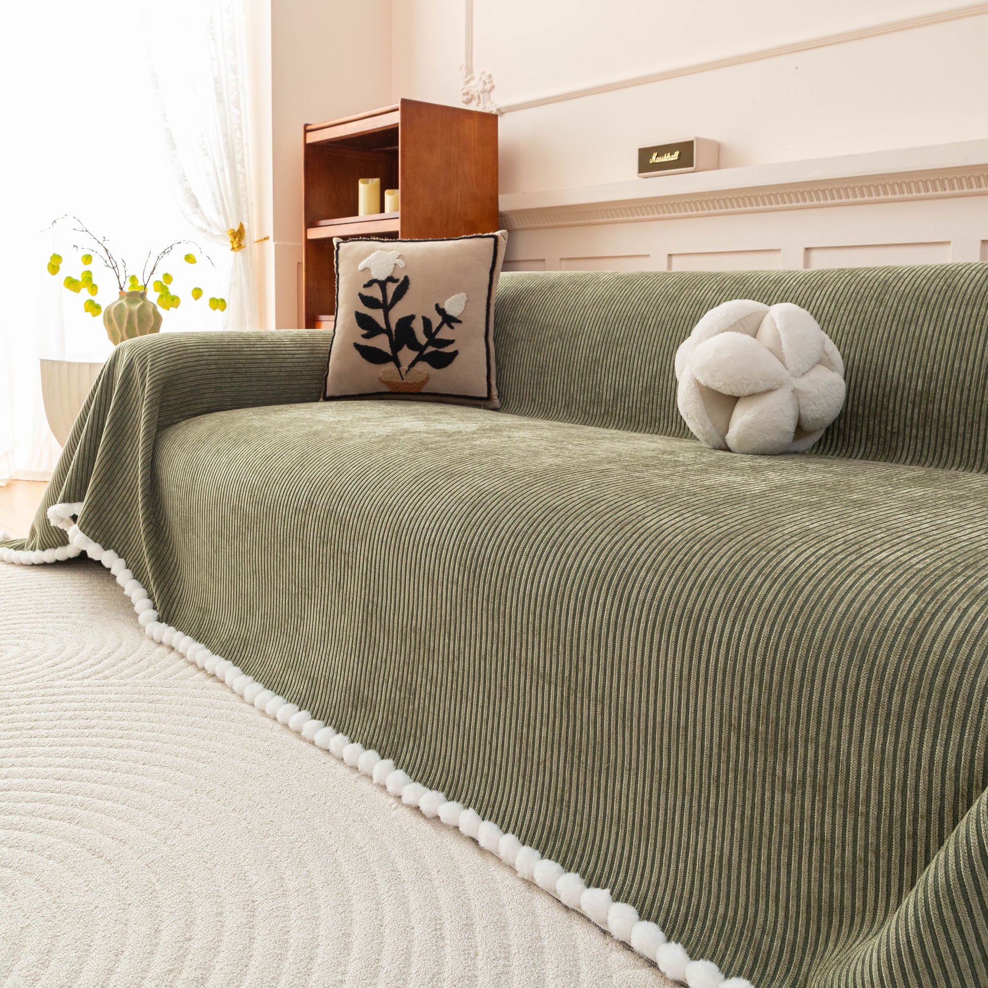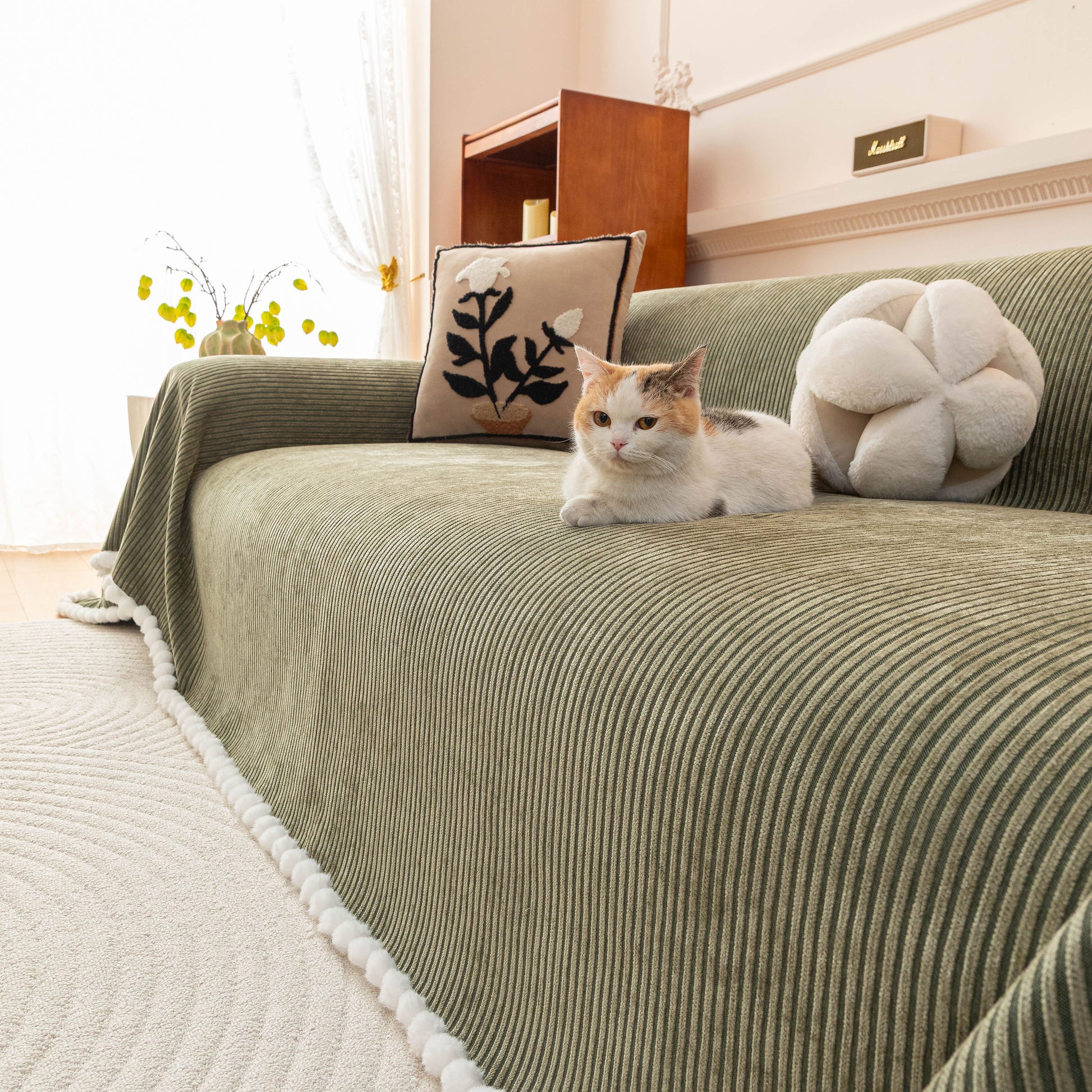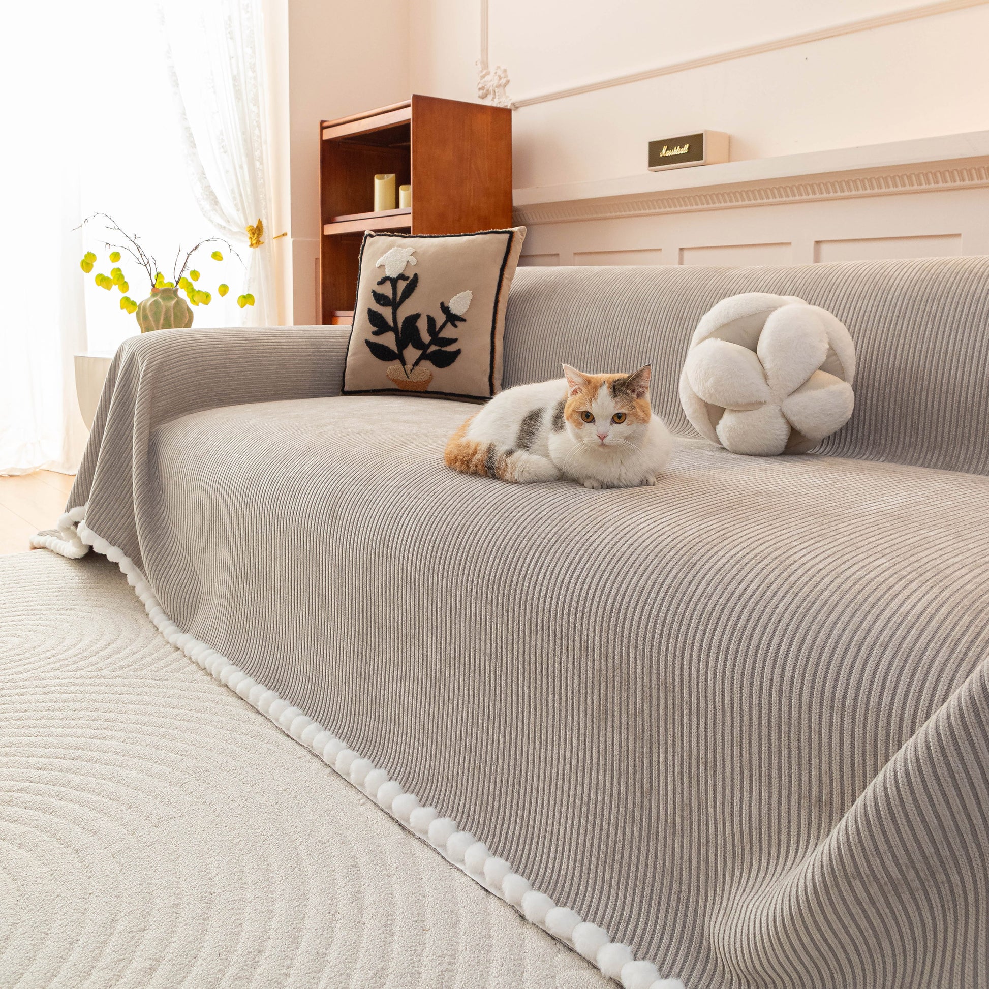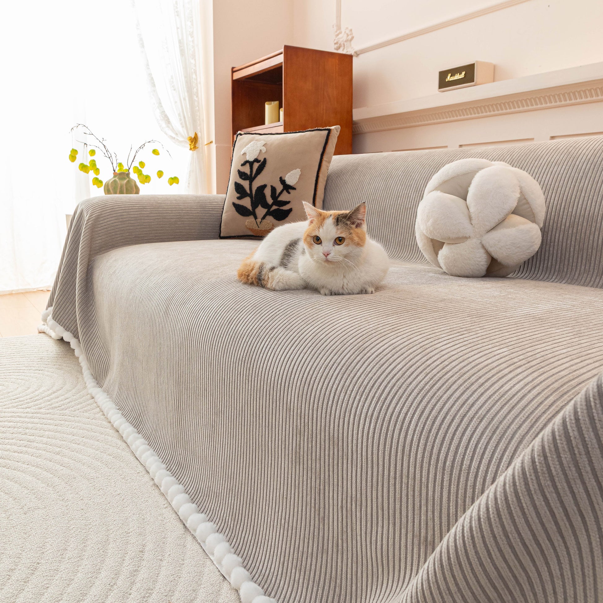 Upgrade your sofa with the Slipcover KAS™ chenille sofa cover throw. Featuring a textured striped design with pom-pom trim, it brings a cozy, stylish touch to your space while protecting against pets, spills, and daily wear. Soft, breathable, and washable—perfect for effortless comfort and home decor.