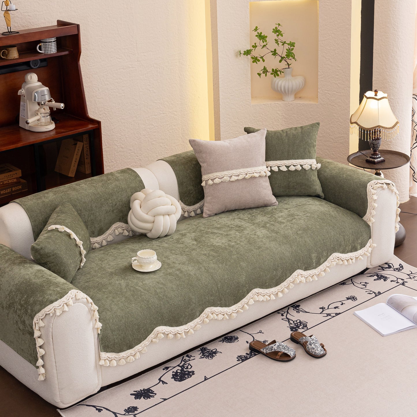 This sofa cover is crafted from soft chenille fabric with a fine diagonal weave, offering a warm, breathable surface ideal for year-round use. The edges feature an ivory braided trim with long tassels, adding a cozy, elegant touch. Available in separate sizes to freely cover the seat, backrest, or armrests as needed. The anti-slip backing keeps each piece securely in place—combining comfort, style, and flexibility.