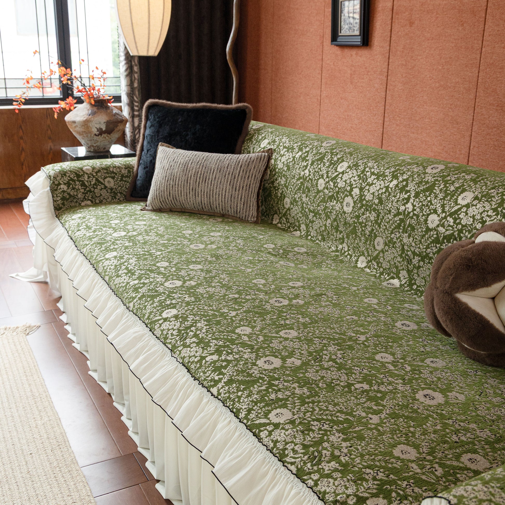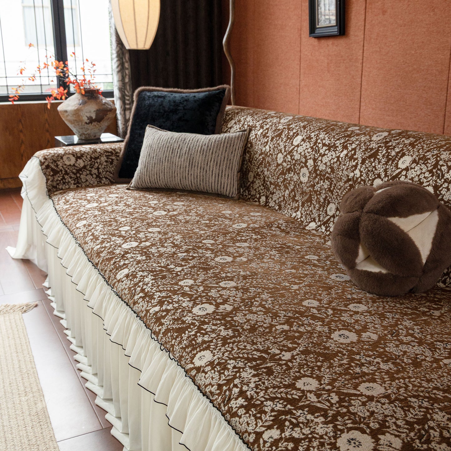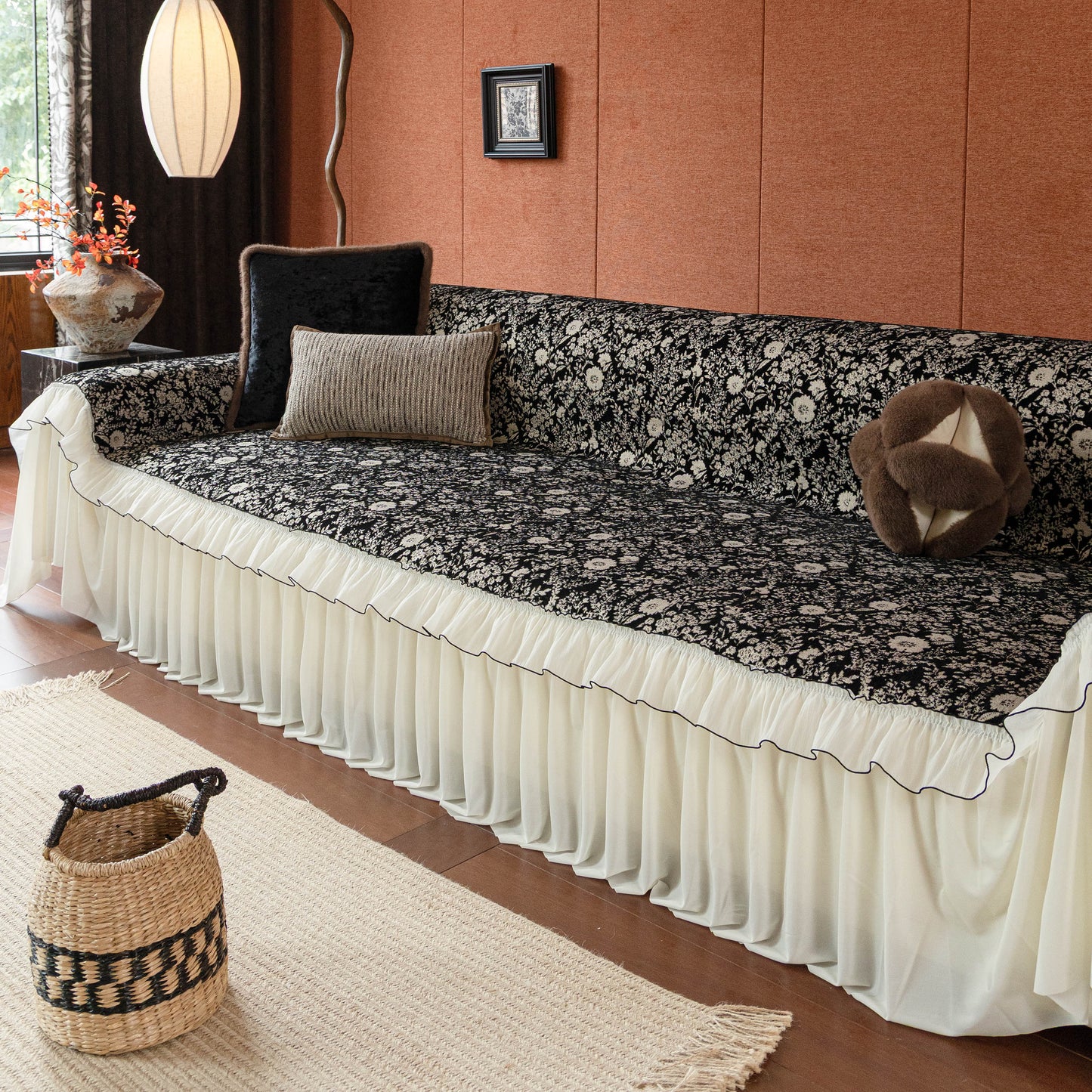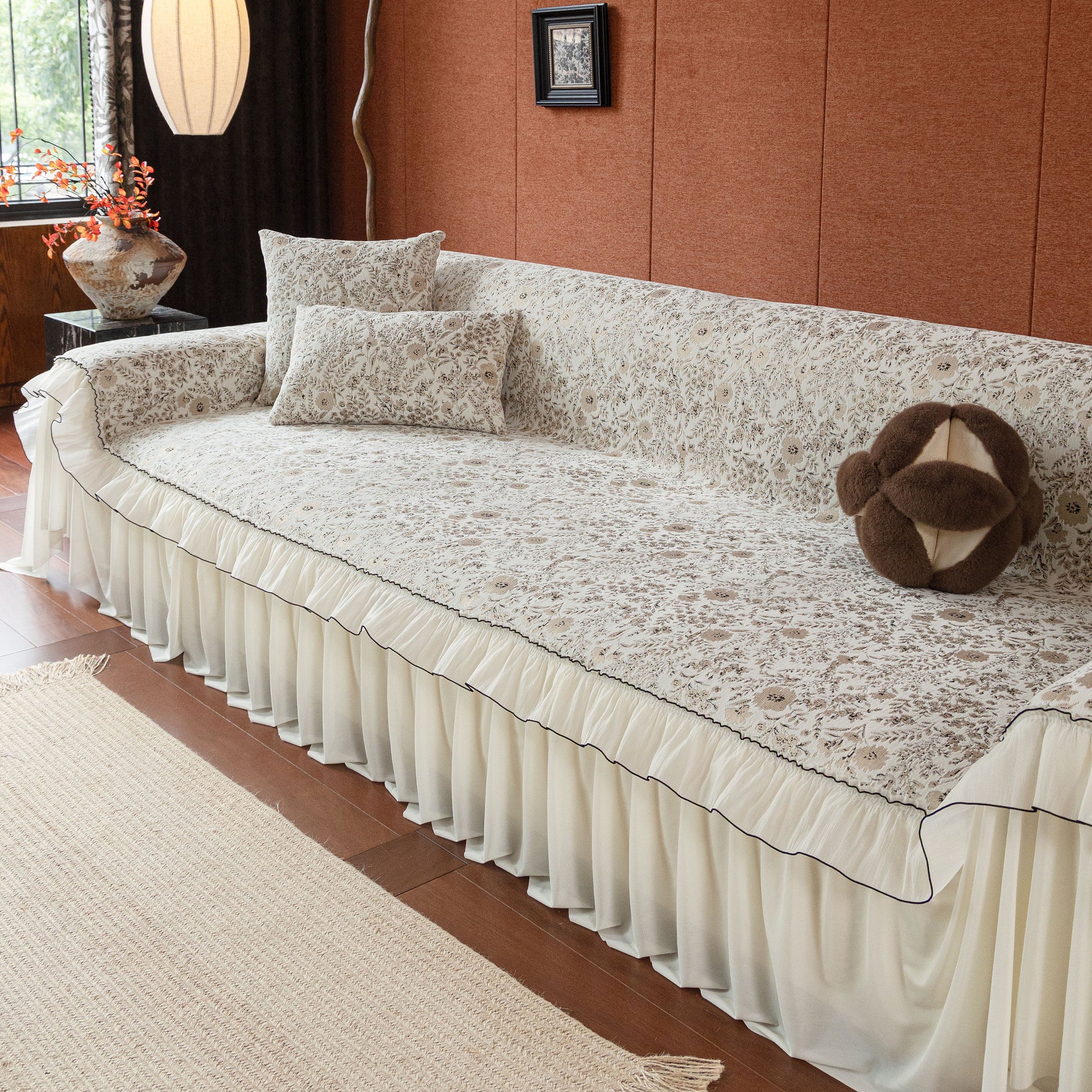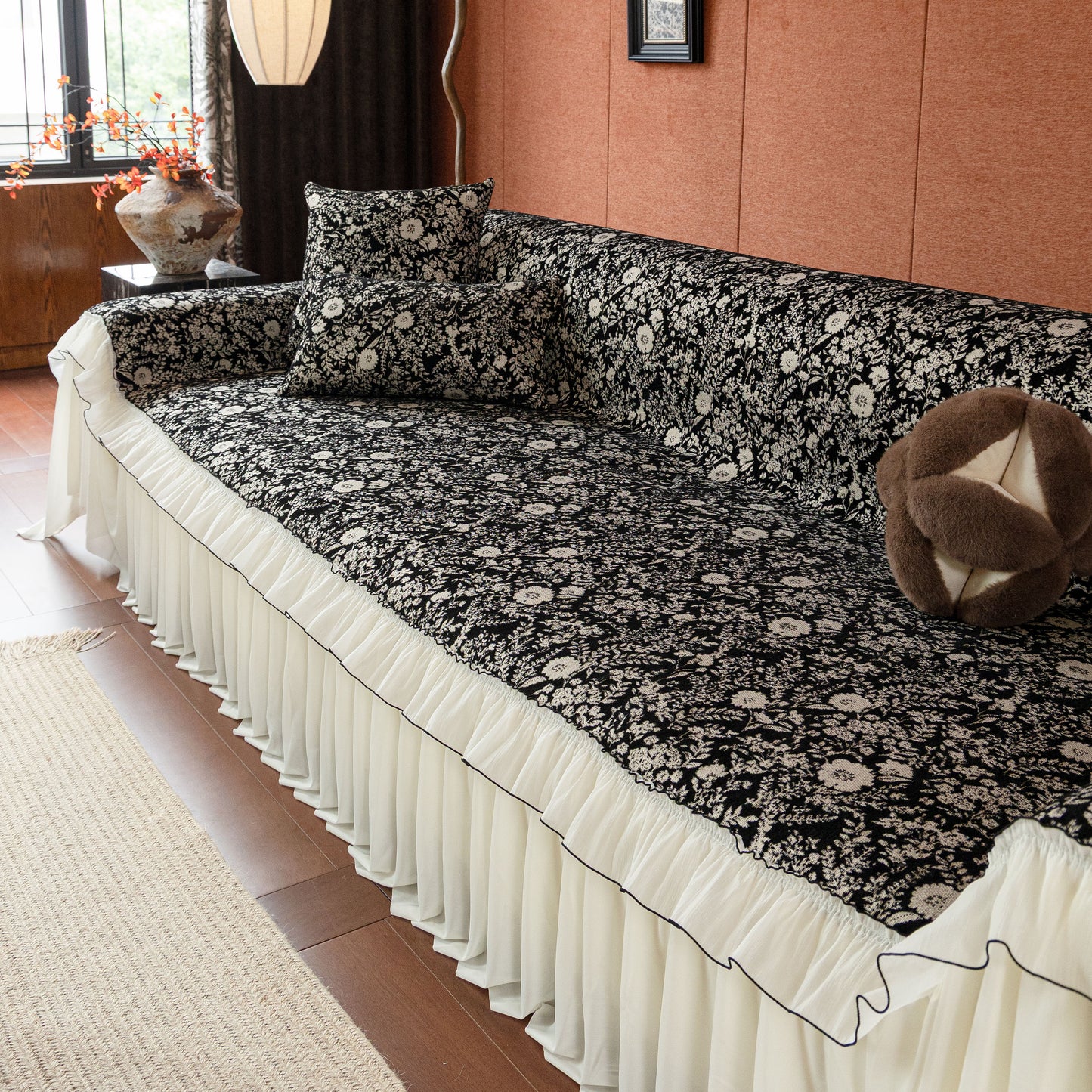 Il copridivano floreale in stile country francese con gonna in chiffon arricciata è un getto decorativo e funzionale progettato per migliorare l'aspetto del tuo soggiorno mentre fornisce una protezione pratica per il divano. La superficie superiore presenta un denso motivo floreale tessuto a jacquard che evoca estetiche europee vintage. Il bordo inferiore è rifinito con una gonna in chiffon arricciata a lunghezza intera, delicatamente cucita con bordi a contrasto, aggiungendo texture e morbidezza visiva al pezzo.