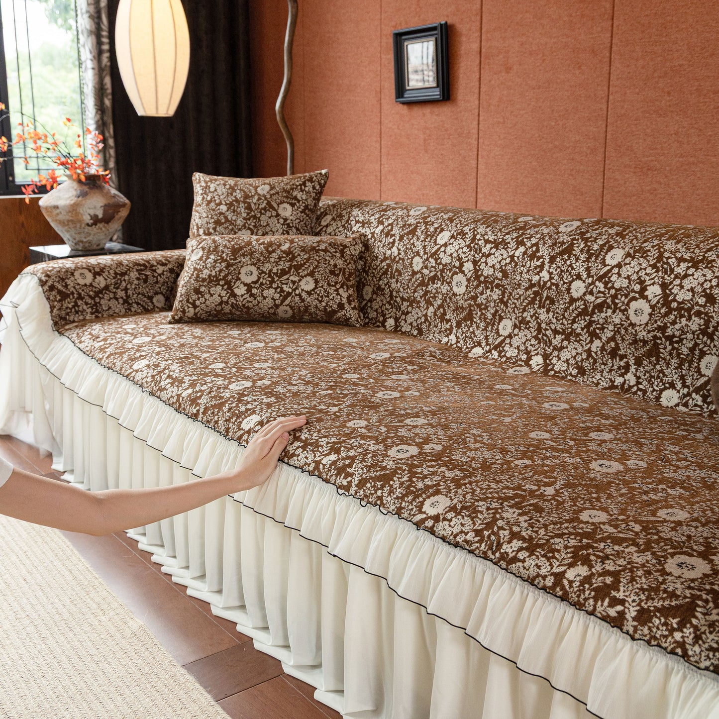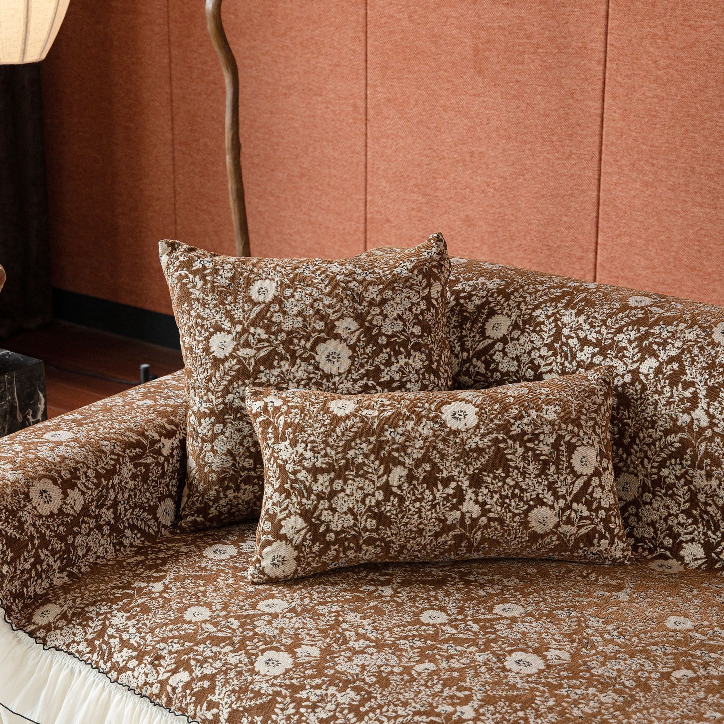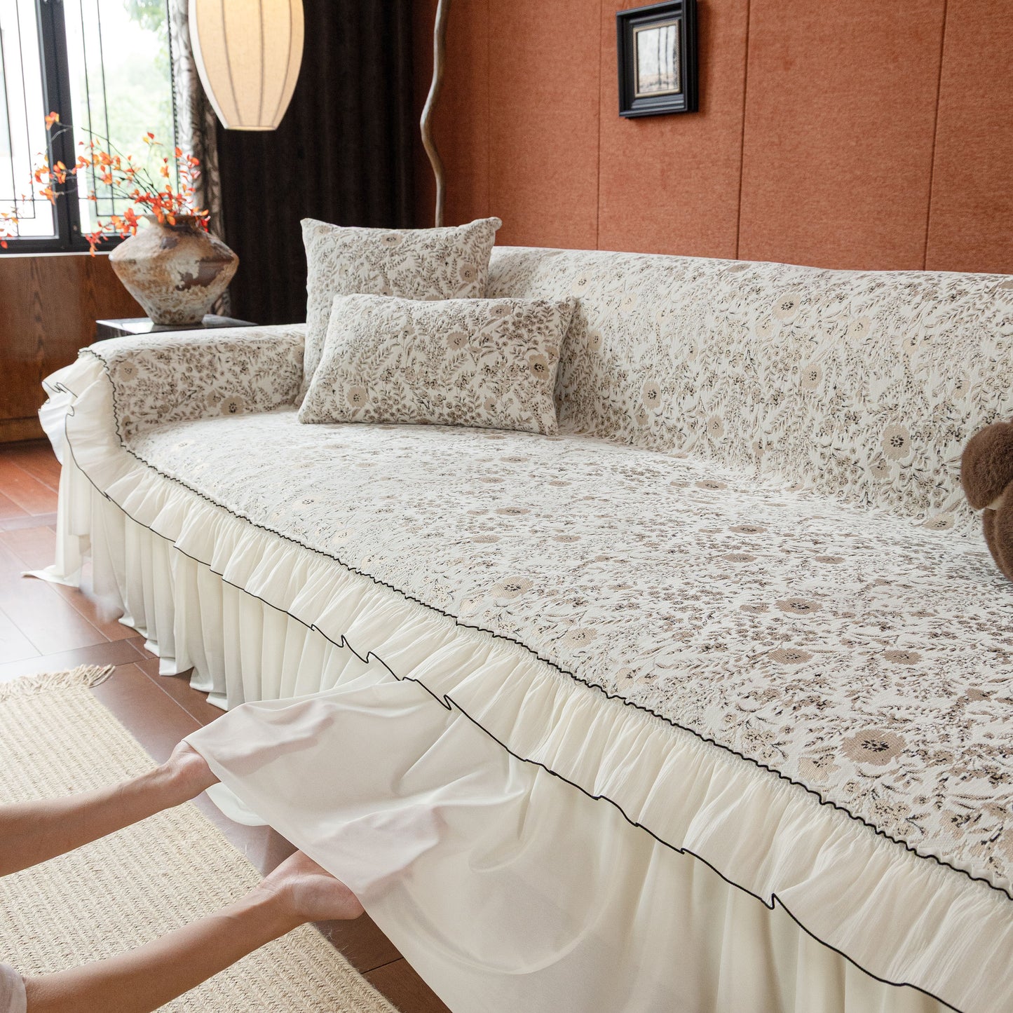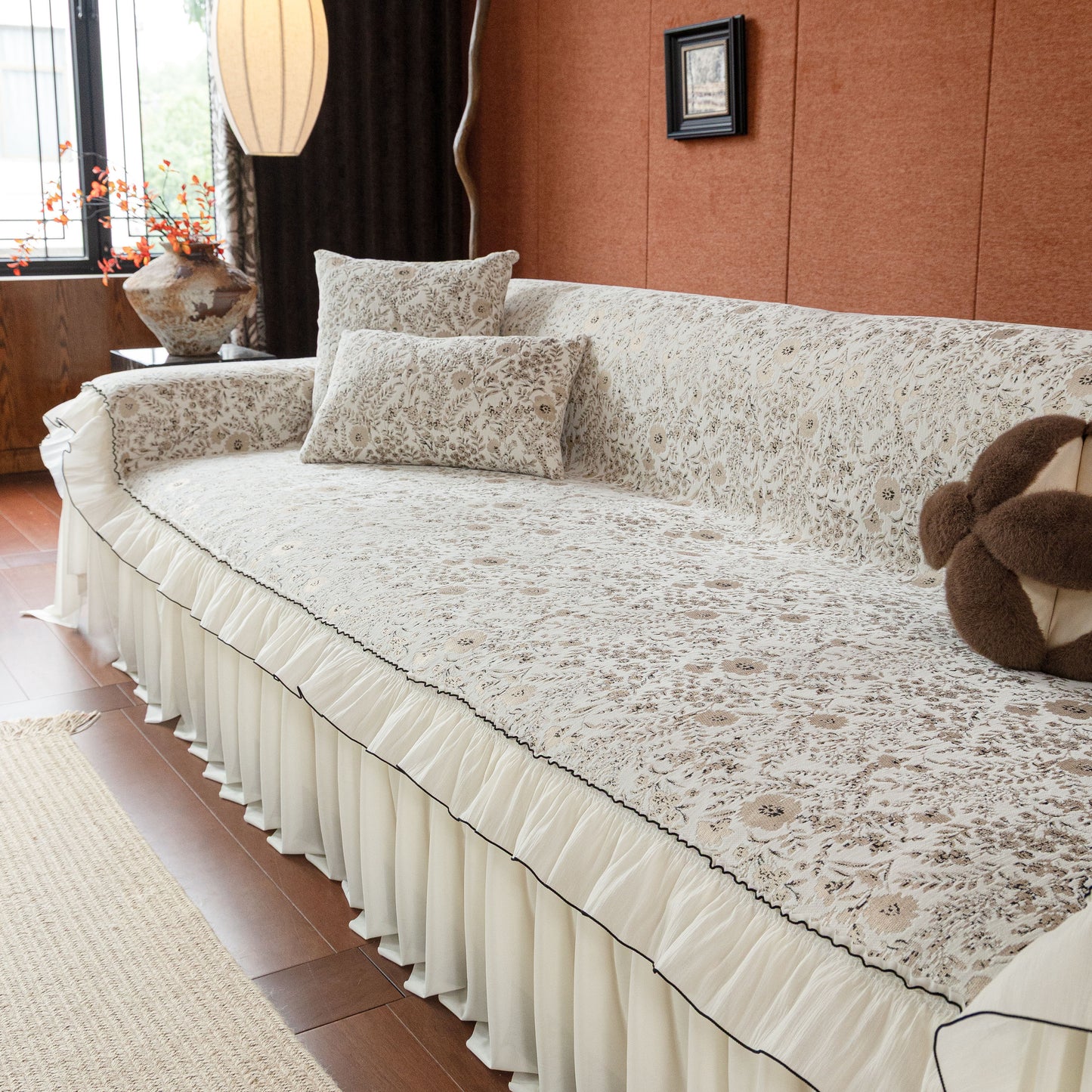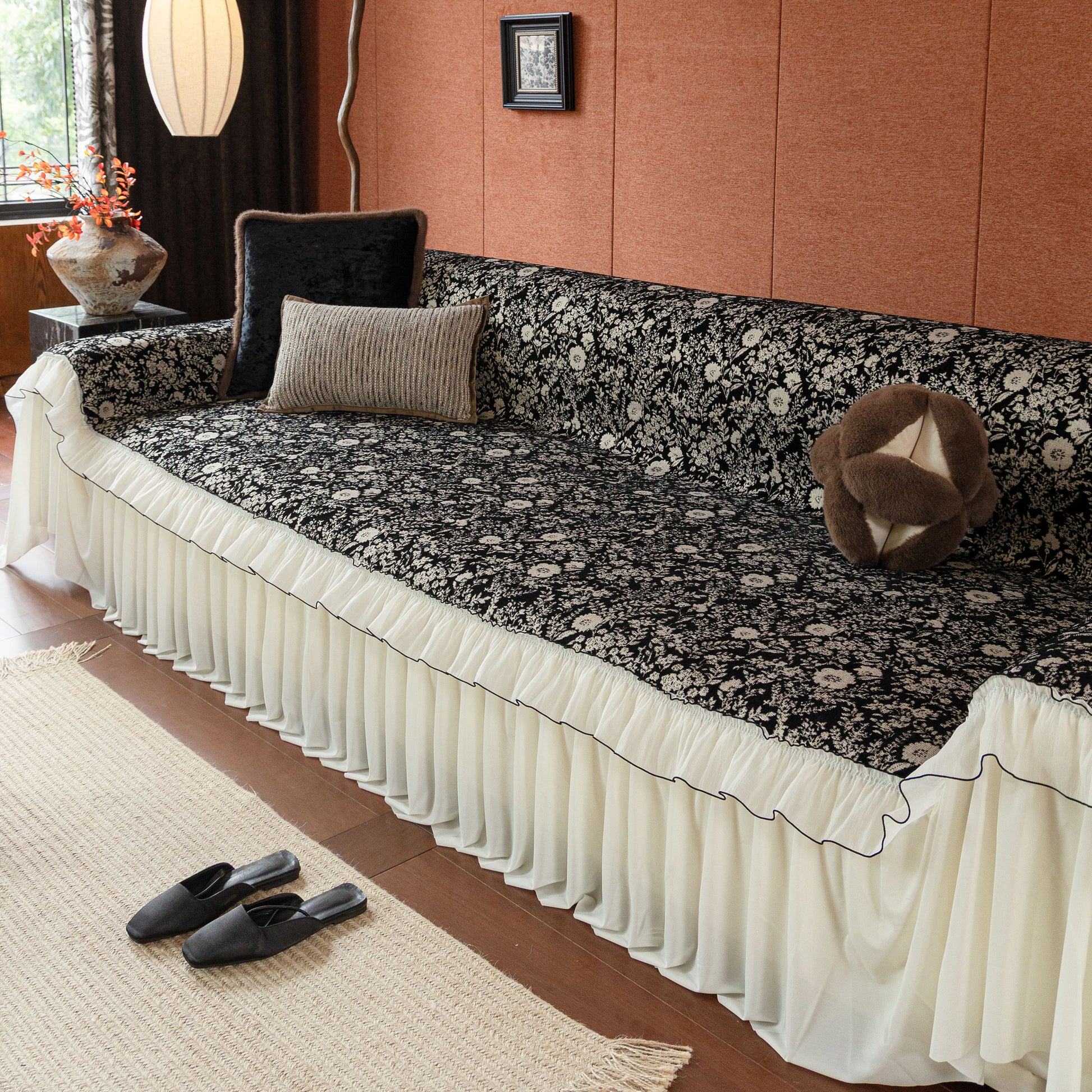 Il copridivano floreale in stile country francese con gonna in chiffon arricciata è un getto decorativo e funzionale progettato per migliorare l'aspetto del tuo soggiorno mentre fornisce una protezione pratica per il divano. La superficie superiore presenta un denso motivo floreale tessuto a jacquard che evoca estetiche europee vintage. Il bordo inferiore è rifinito con una gonna in chiffon arricciata a lunghezza intera, delicatamente cucita con bordi a contrasto, aggiungendo texture e morbidezza visiva al pezzo.