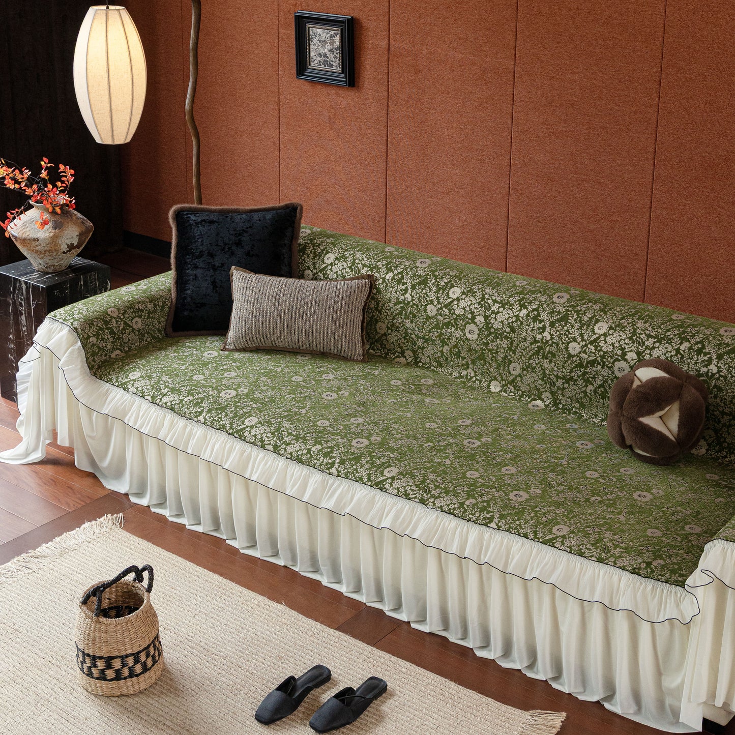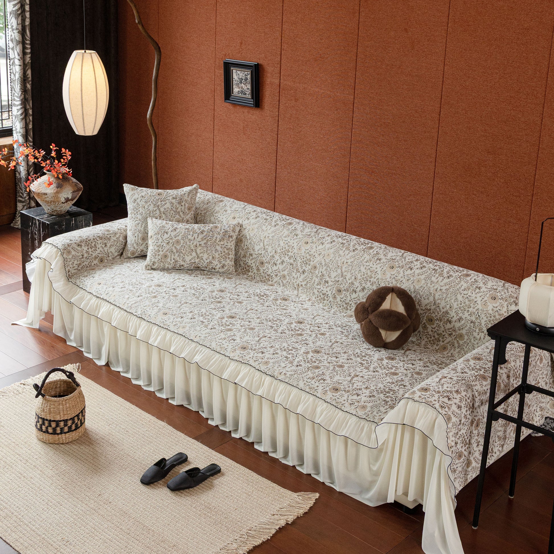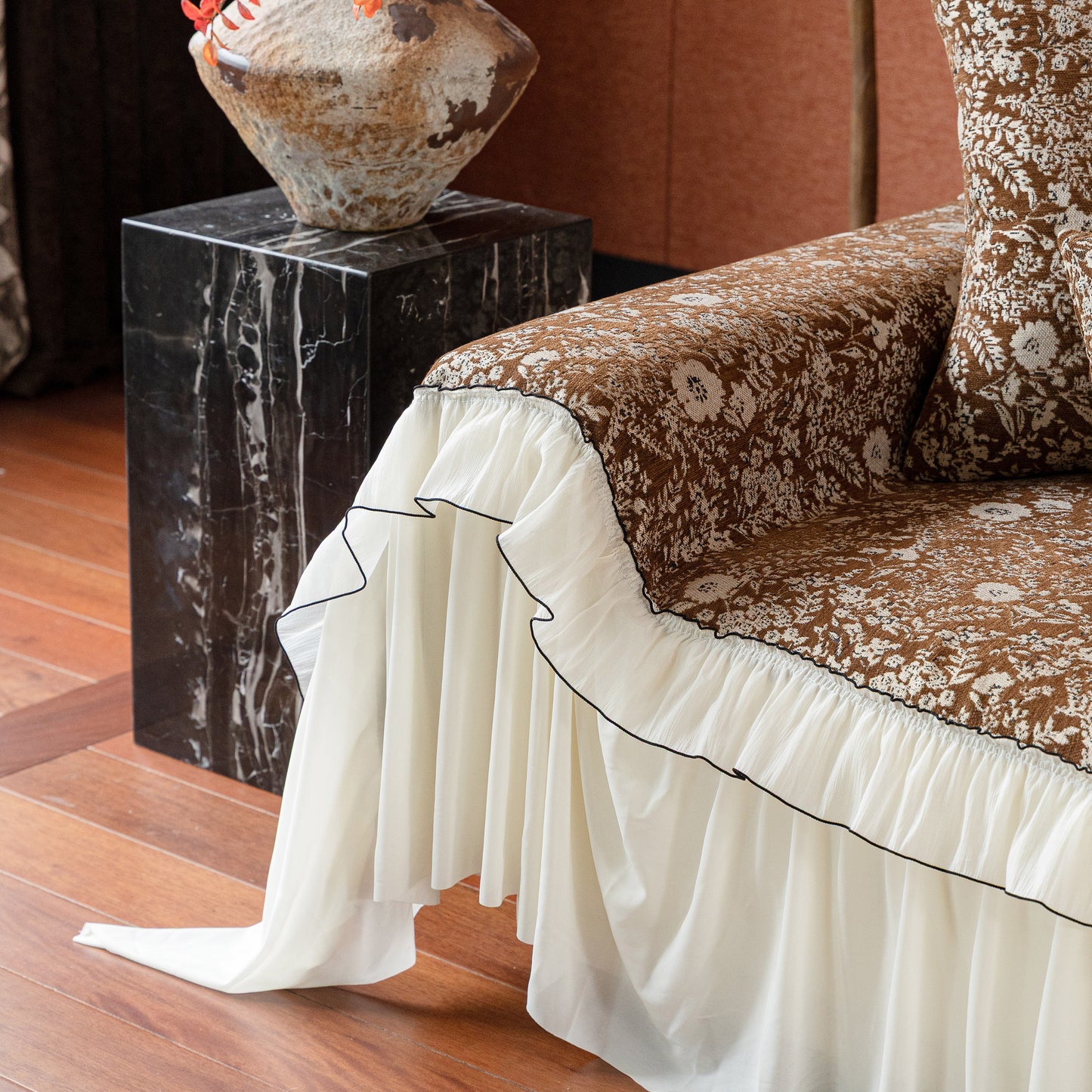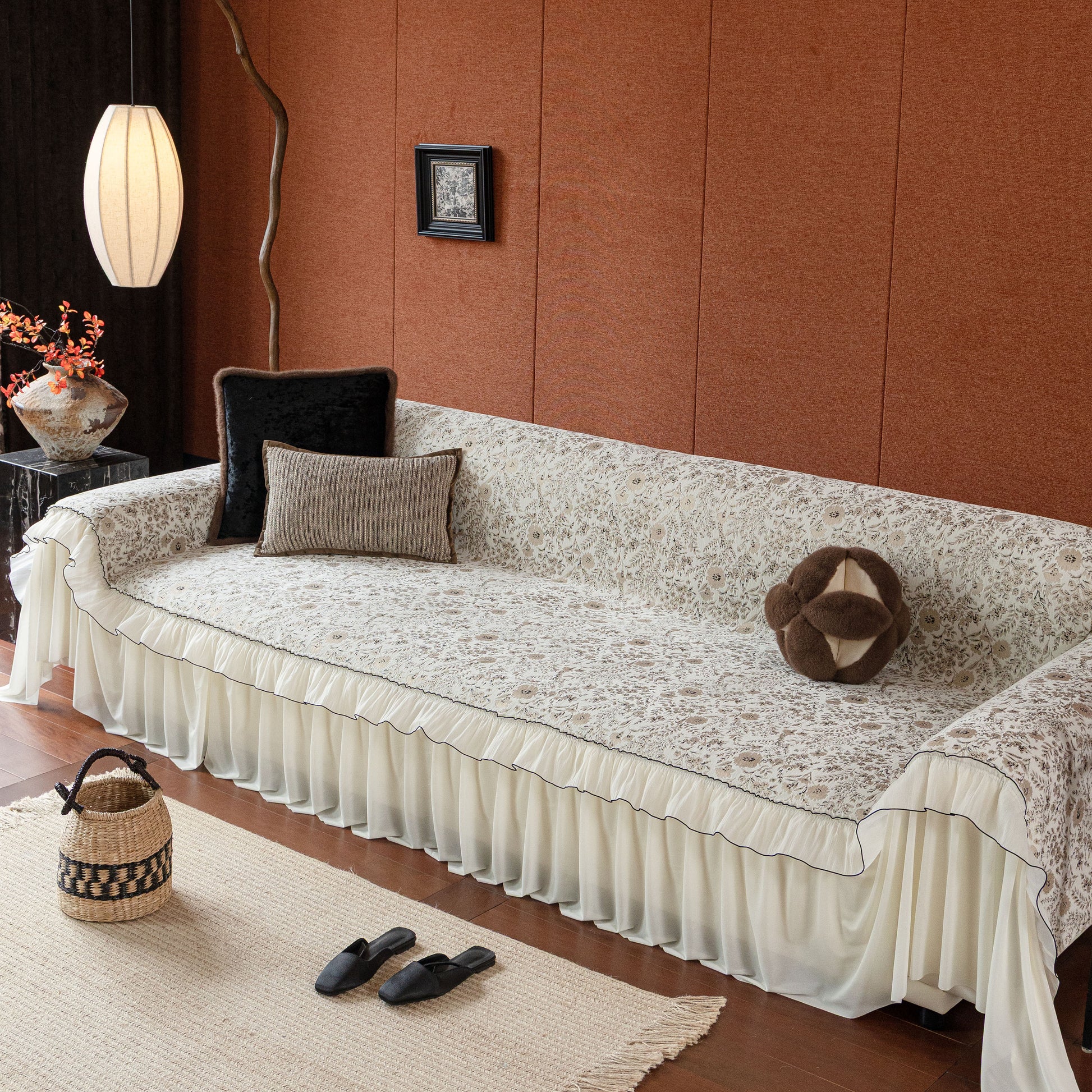 Il copridivano floreale in stile country francese con gonna in chiffon arricciata è un getto decorativo e funzionale progettato per migliorare l'aspetto del tuo soggiorno mentre fornisce una protezione pratica per il divano. La superficie superiore presenta un denso motivo floreale tessuto a jacquard che evoca estetiche europee vintage. Il bordo inferiore è rifinito con una gonna in chiffon arricciata a lunghezza intera, delicatamente cucita con bordi a contrasto, aggiungendo texture e morbidezza visiva al pezzo.