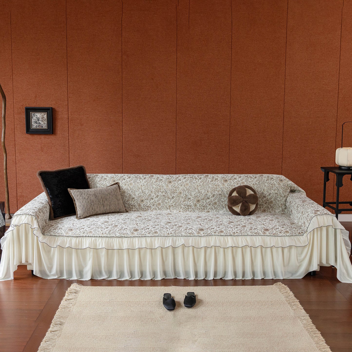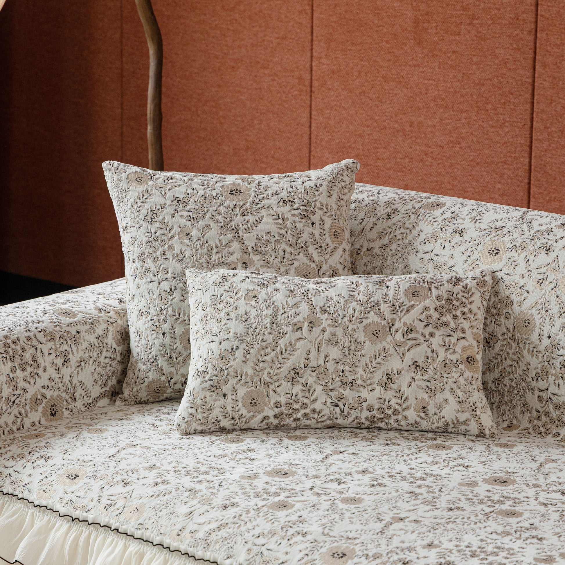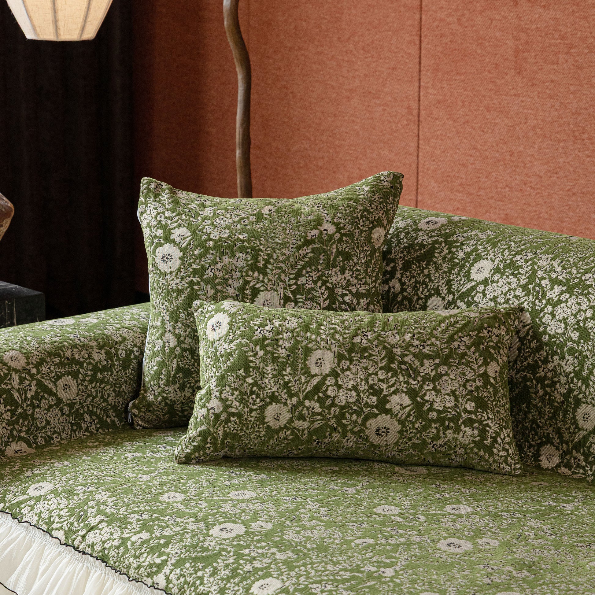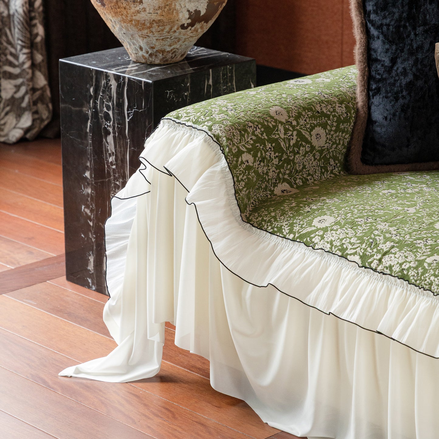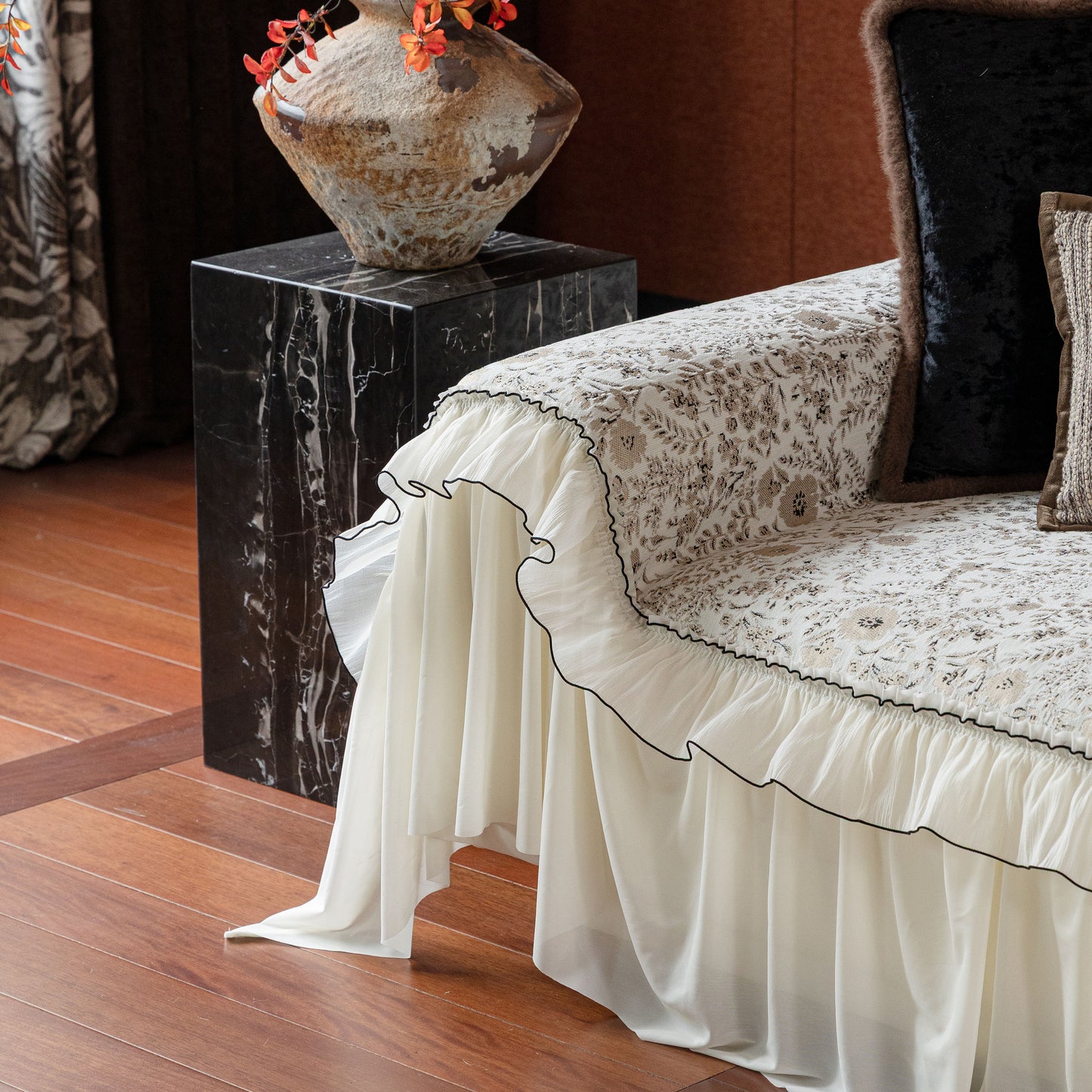 Il copridivano floreale in stile country francese con gonna in chiffon arricciata è un getto decorativo e funzionale progettato per migliorare l'aspetto del tuo soggiorno mentre fornisce una protezione pratica per il divano. La superficie superiore presenta un denso motivo floreale tessuto a jacquard che evoca estetiche europee vintage. Il bordo inferiore è rifinito con una gonna in chiffon arricciata a lunghezza intera, delicatamente cucita con bordi a contrasto, aggiungendo texture e morbidezza visiva al pezzo.