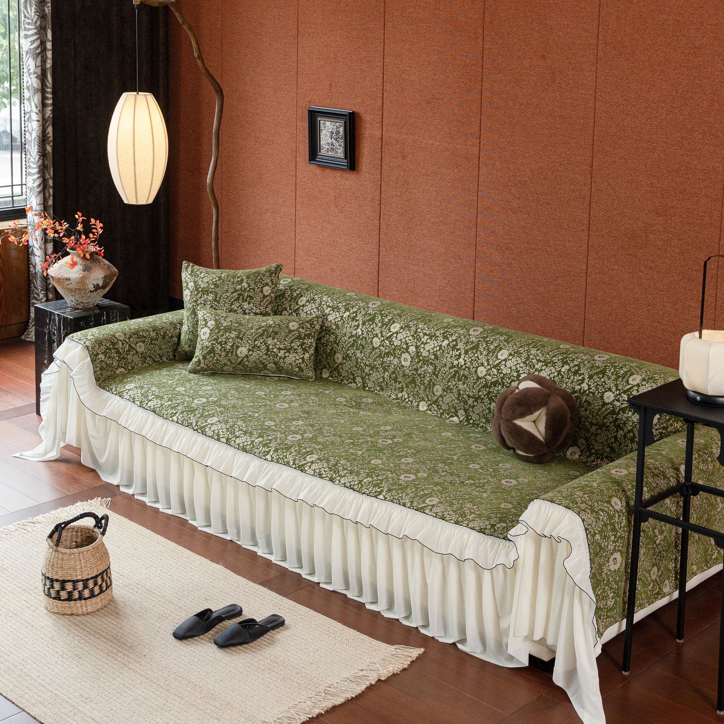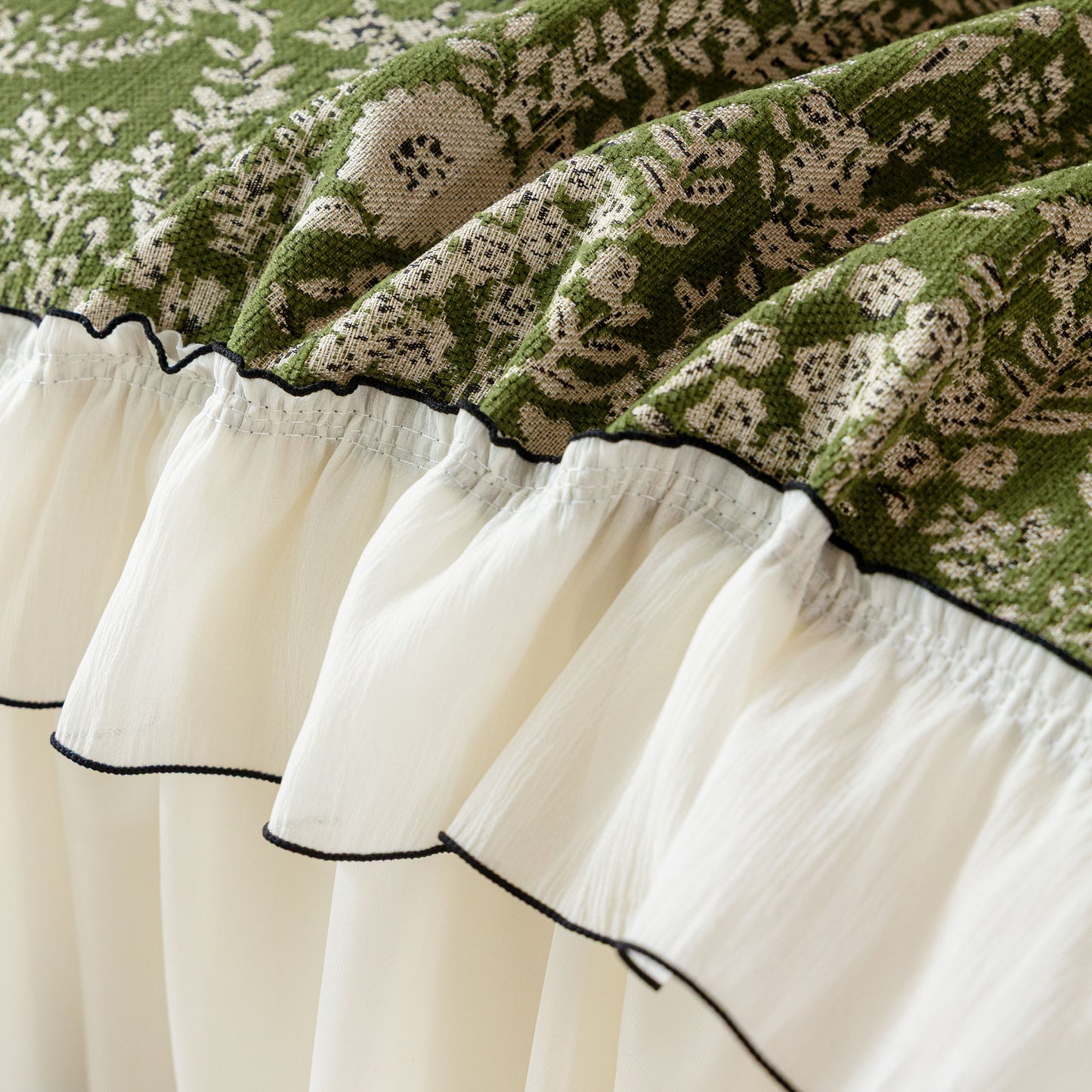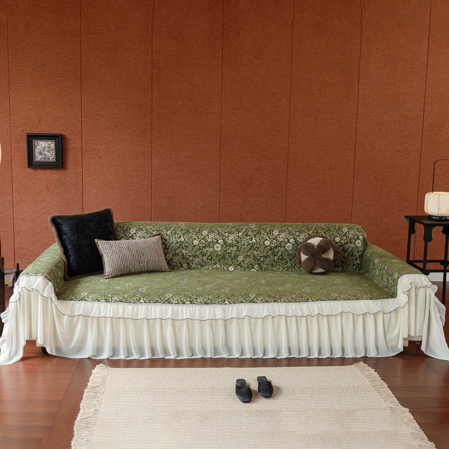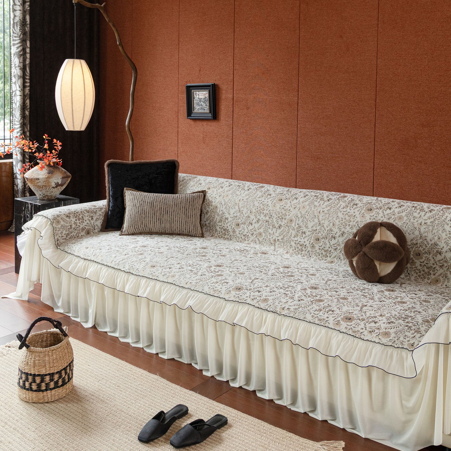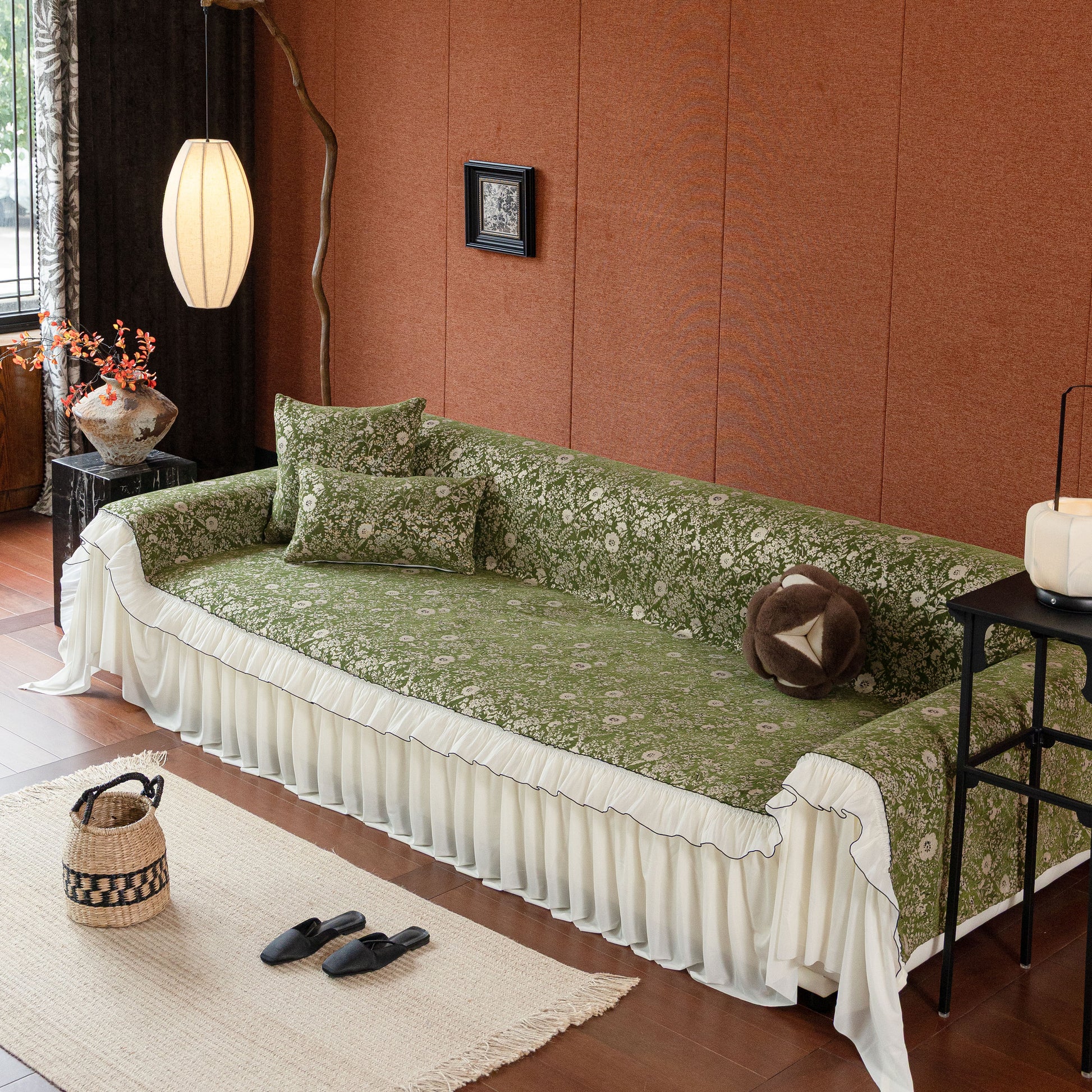 Il copridivano floreale in stile country francese con gonna in chiffon arricciata è un getto decorativo e funzionale progettato per migliorare l'aspetto del tuo soggiorno mentre fornisce una protezione pratica per il divano. La superficie superiore presenta un denso motivo floreale tessuto a jacquard che evoca estetiche europee vintage. Il bordo inferiore è rifinito con una gonna in chiffon arricciata a lunghezza intera, delicatamente cucita con bordi a contrasto, aggiungendo texture e morbidezza visiva al pezzo.