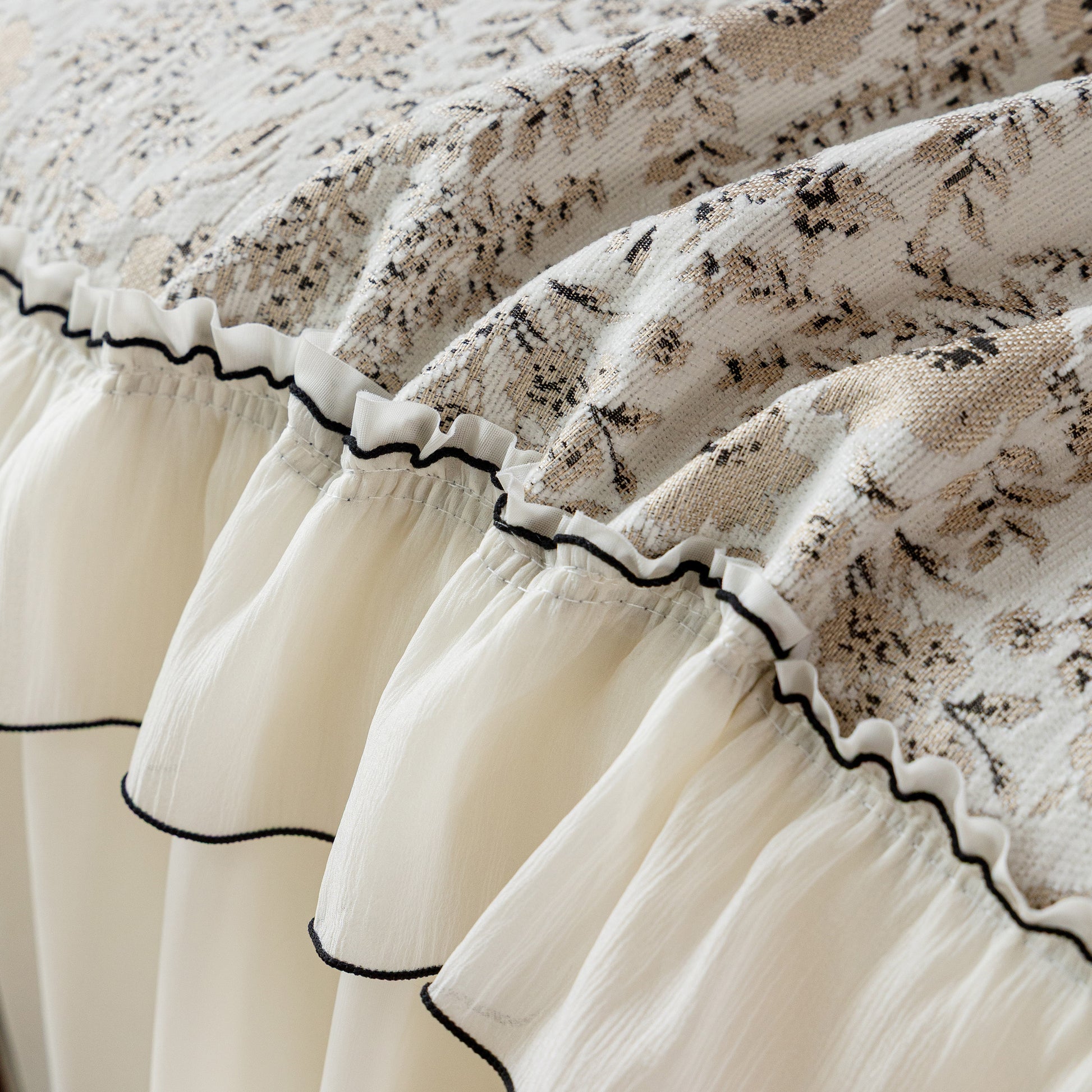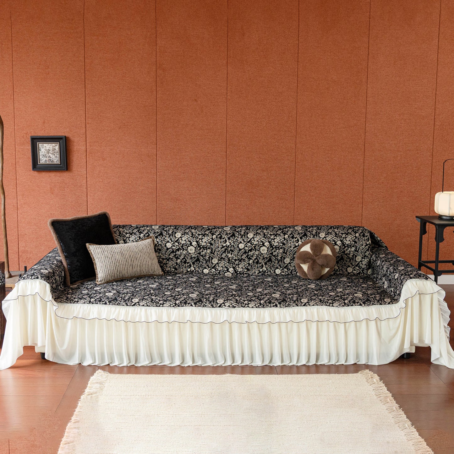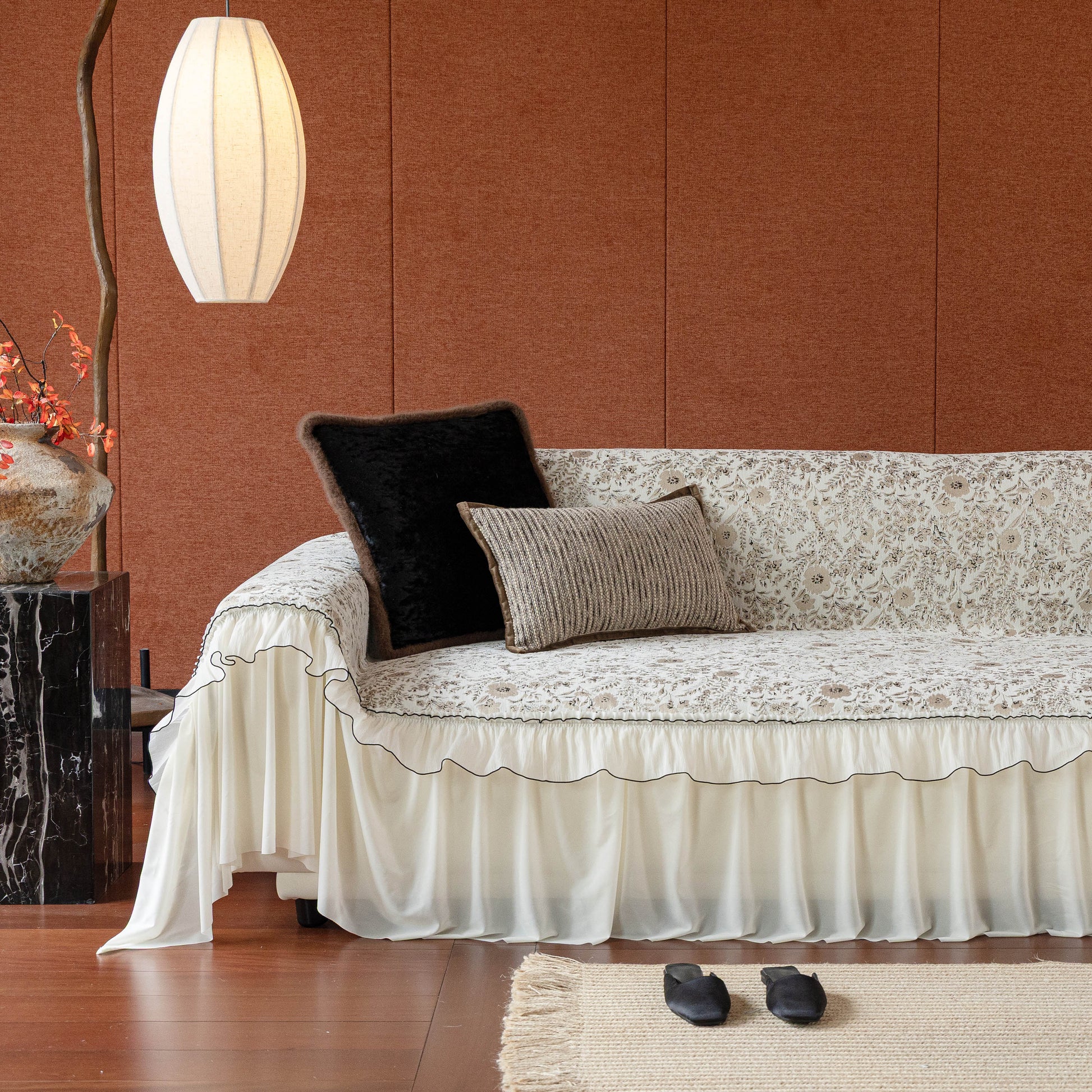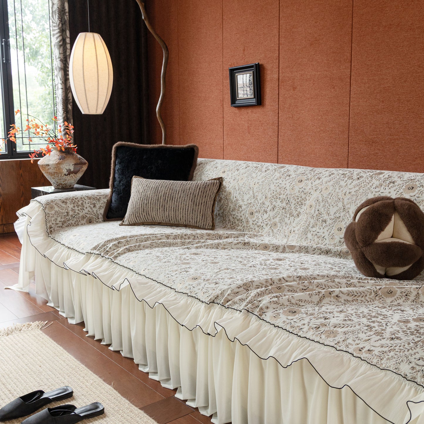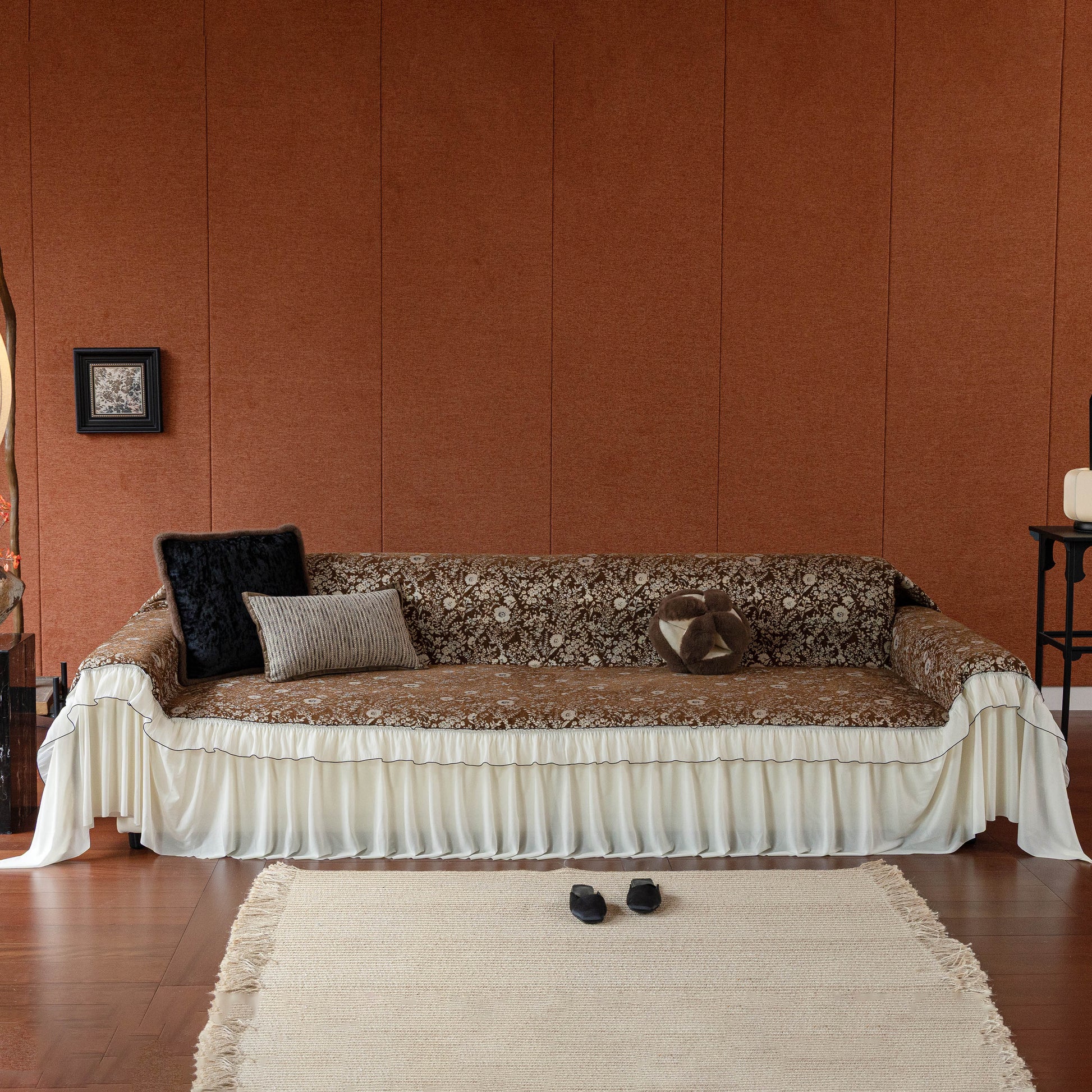 Il copridivano floreale in stile country francese con gonna in chiffon arricciata è un getto decorativo e funzionale progettato per migliorare l'aspetto del tuo soggiorno mentre fornisce una protezione pratica per il divano. La superficie superiore presenta un denso motivo floreale tessuto a jacquard che evoca estetiche europee vintage. Il bordo inferiore è rifinito con una gonna in chiffon arricciata a lunghezza intera, delicatamente cucita con bordi a contrasto, aggiungendo texture e morbidezza visiva al pezzo.