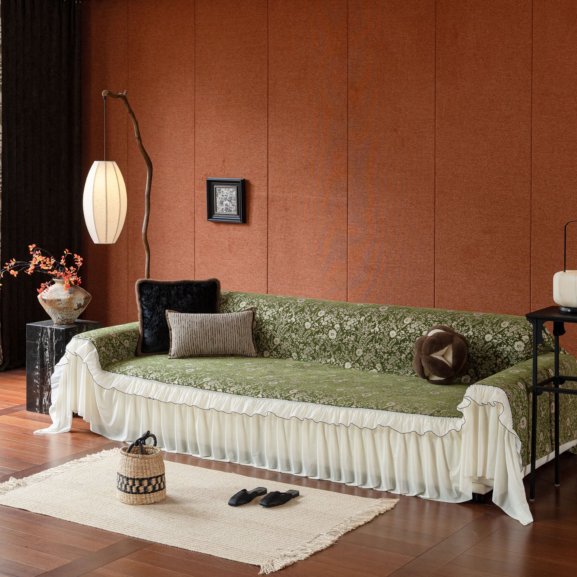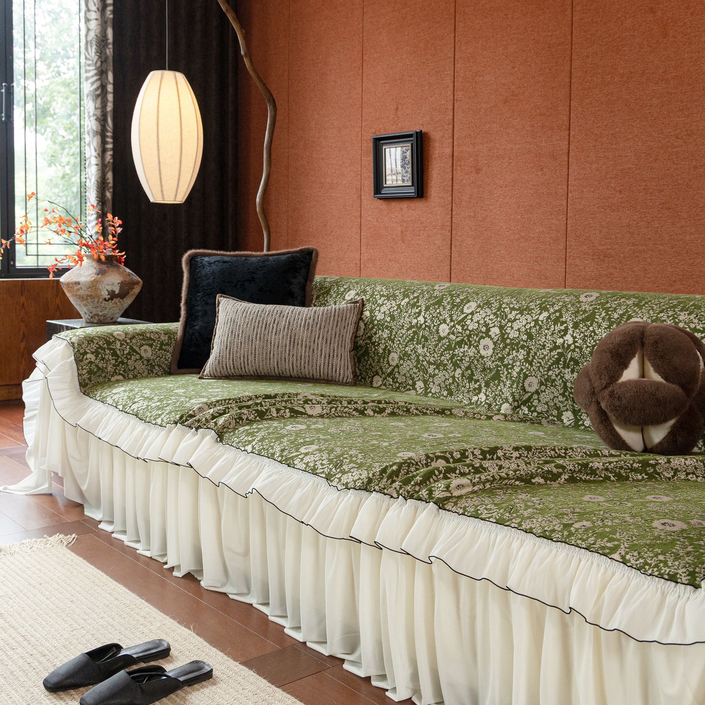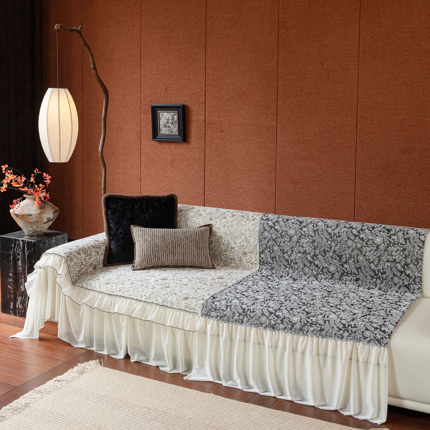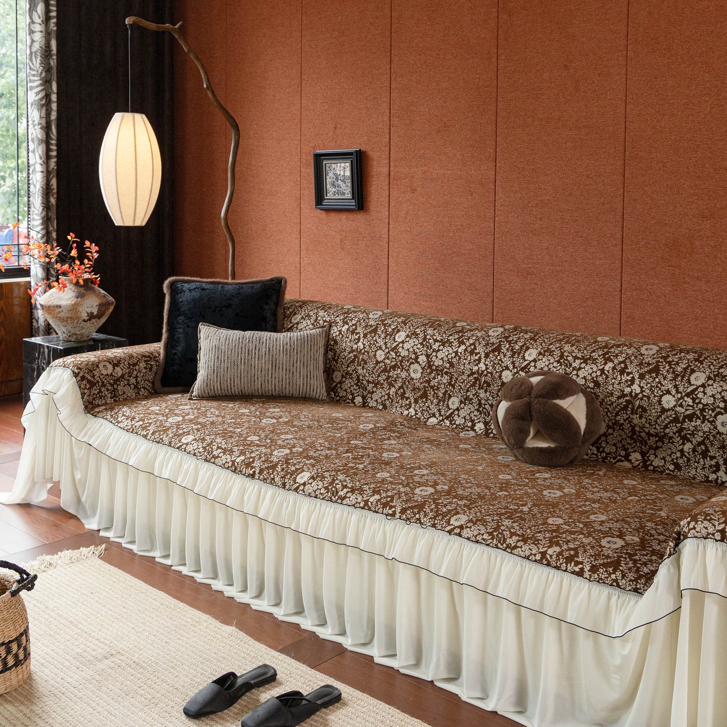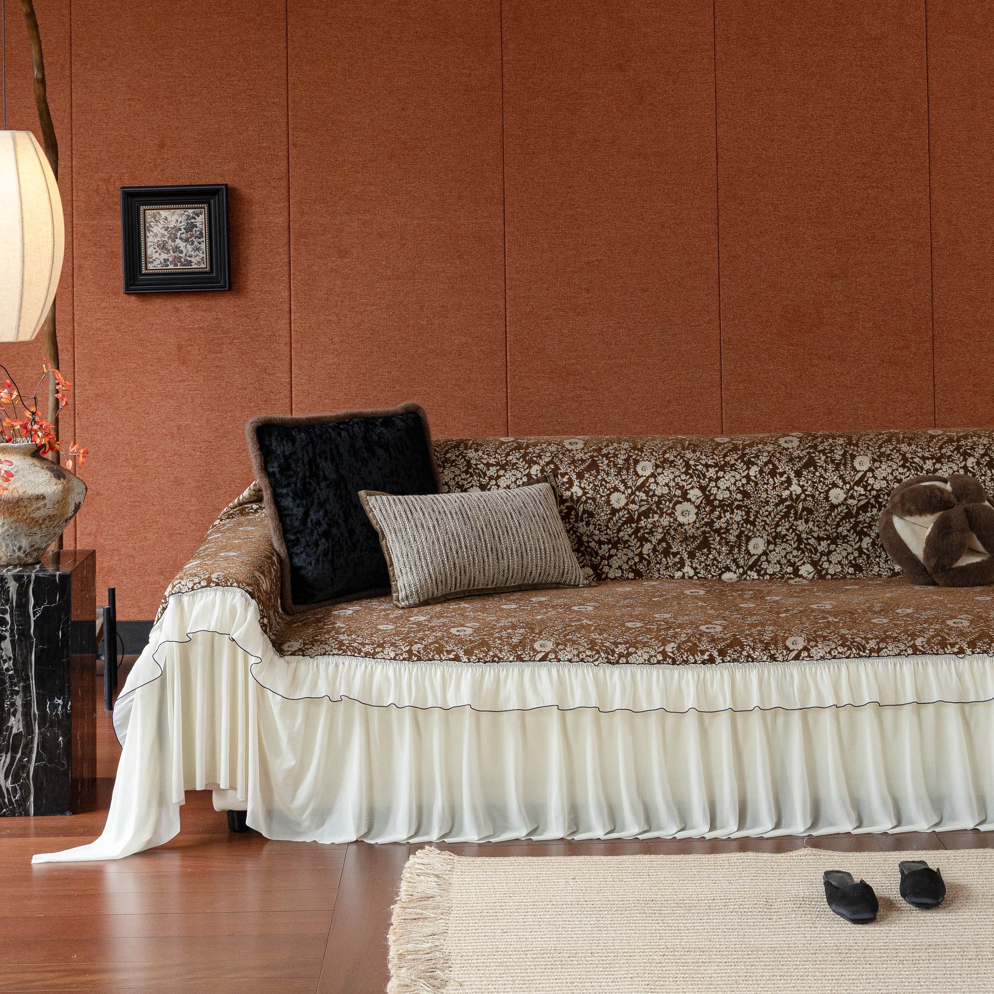 Il copridivano floreale in stile country francese con gonna in chiffon arricciata è un getto decorativo e funzionale progettato per migliorare l'aspetto del tuo soggiorno mentre fornisce una protezione pratica per il divano. La superficie superiore presenta un denso motivo floreale tessuto a jacquard che evoca estetiche europee vintage. Il bordo inferiore è rifinito con una gonna in chiffon arricciata a lunghezza intera, delicatamente cucita con bordi a contrasto, aggiungendo texture e morbidezza visiva al pezzo.