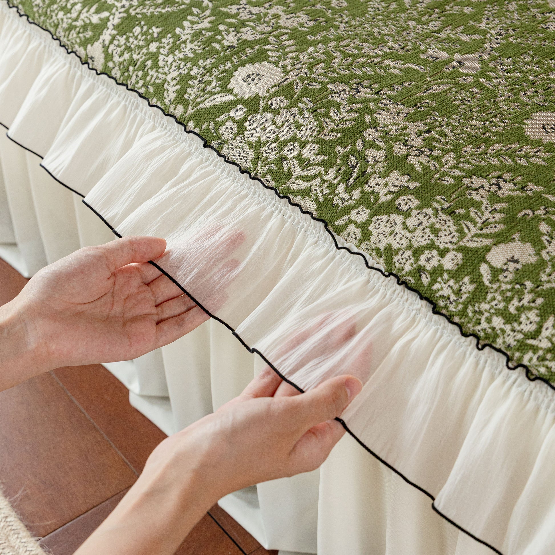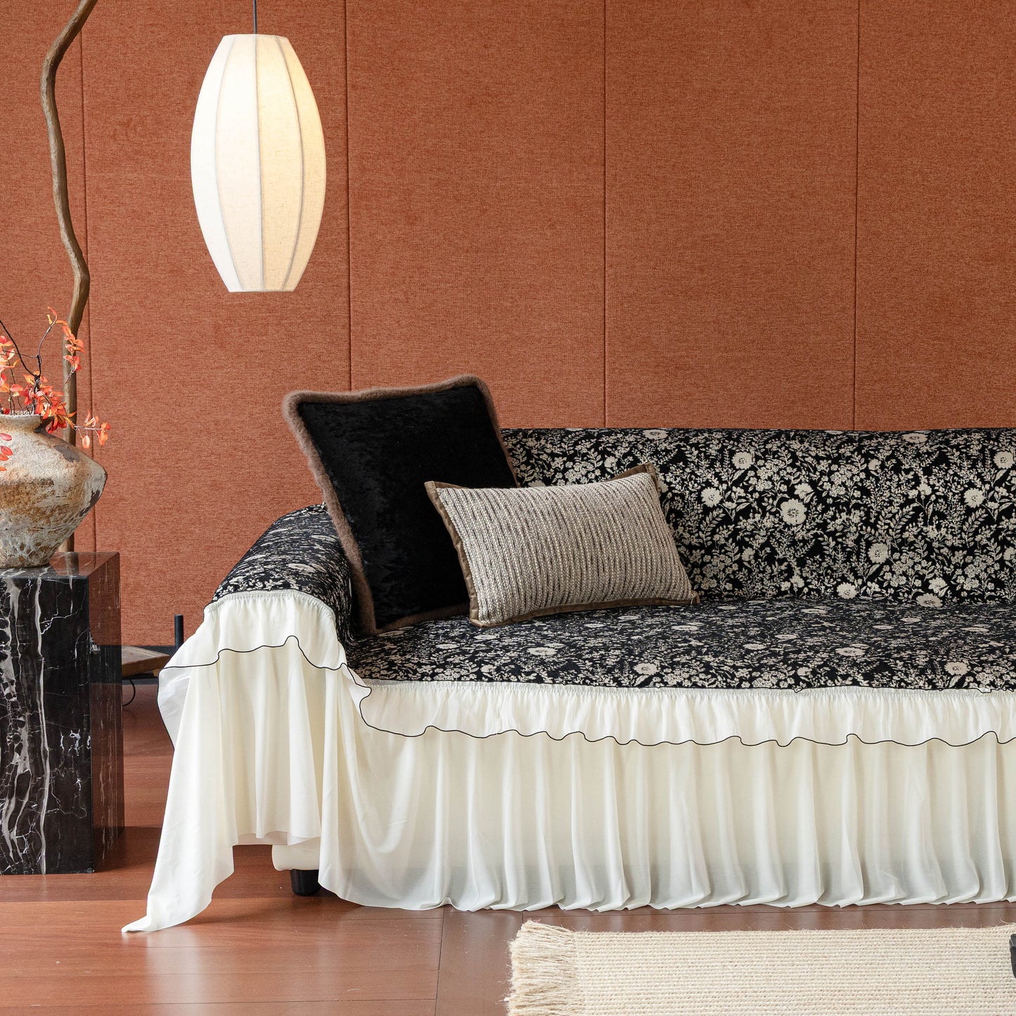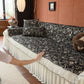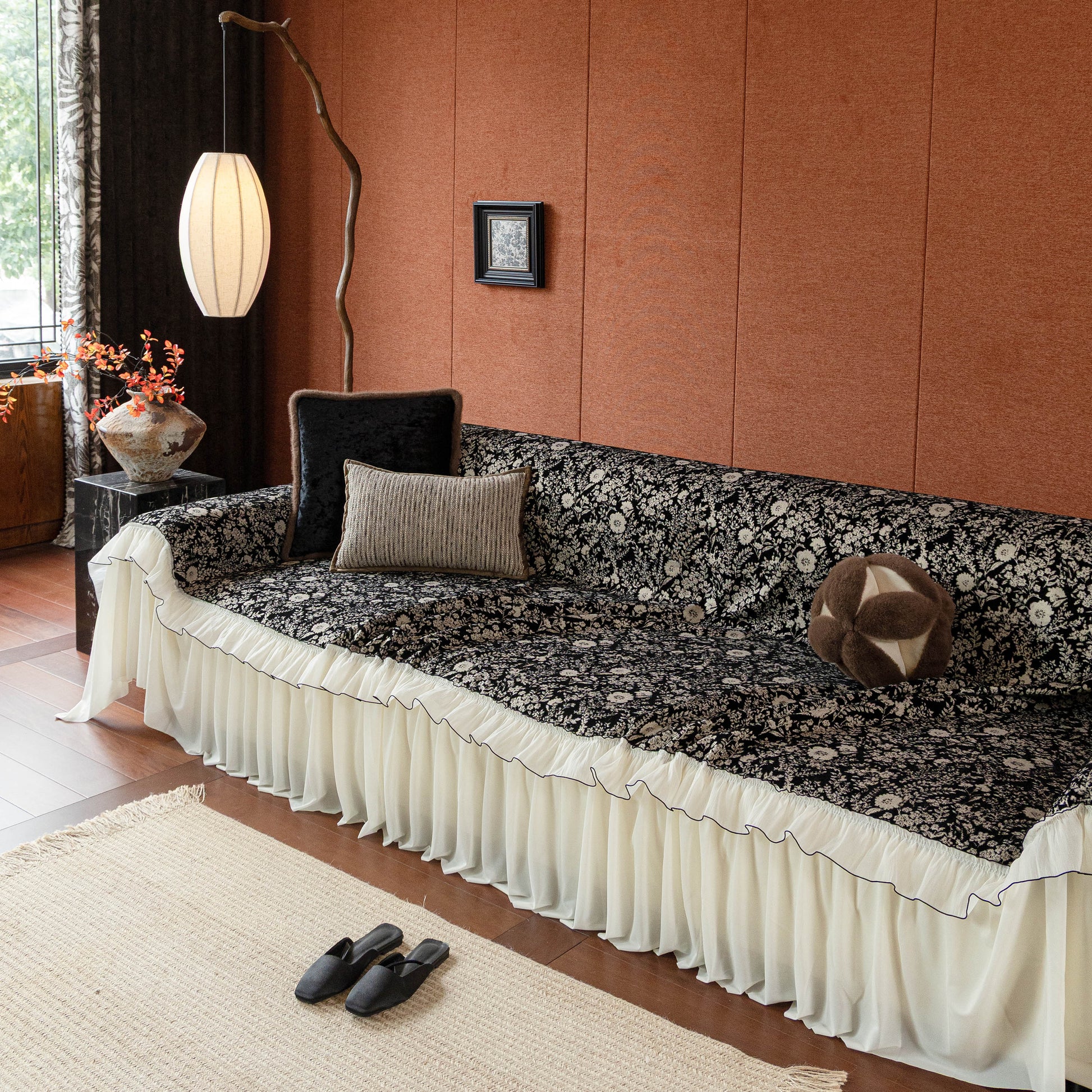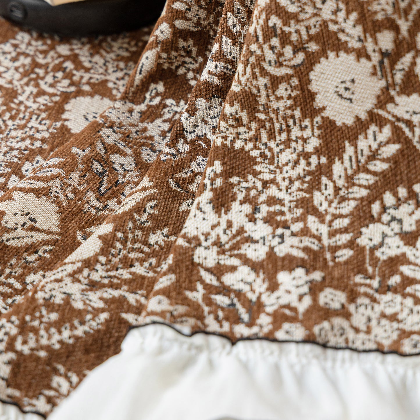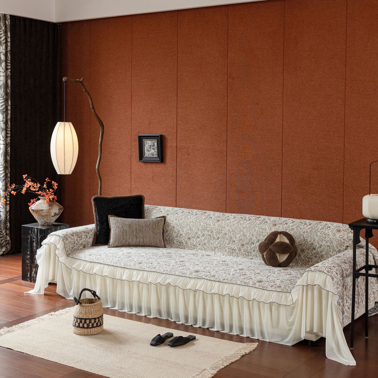 Il copridivano floreale in stile country francese con gonna in chiffon arricciata è un getto decorativo e funzionale progettato per migliorare l'aspetto del tuo soggiorno mentre fornisce una protezione pratica per il divano. La superficie superiore presenta un denso motivo floreale tessuto a jacquard che evoca estetiche europee vintage. Il bordo inferiore è rifinito con una gonna in chiffon arricciata a lunghezza intera, delicatamente cucita con bordi a contrasto, aggiungendo texture e morbidezza visiva al pezzo.