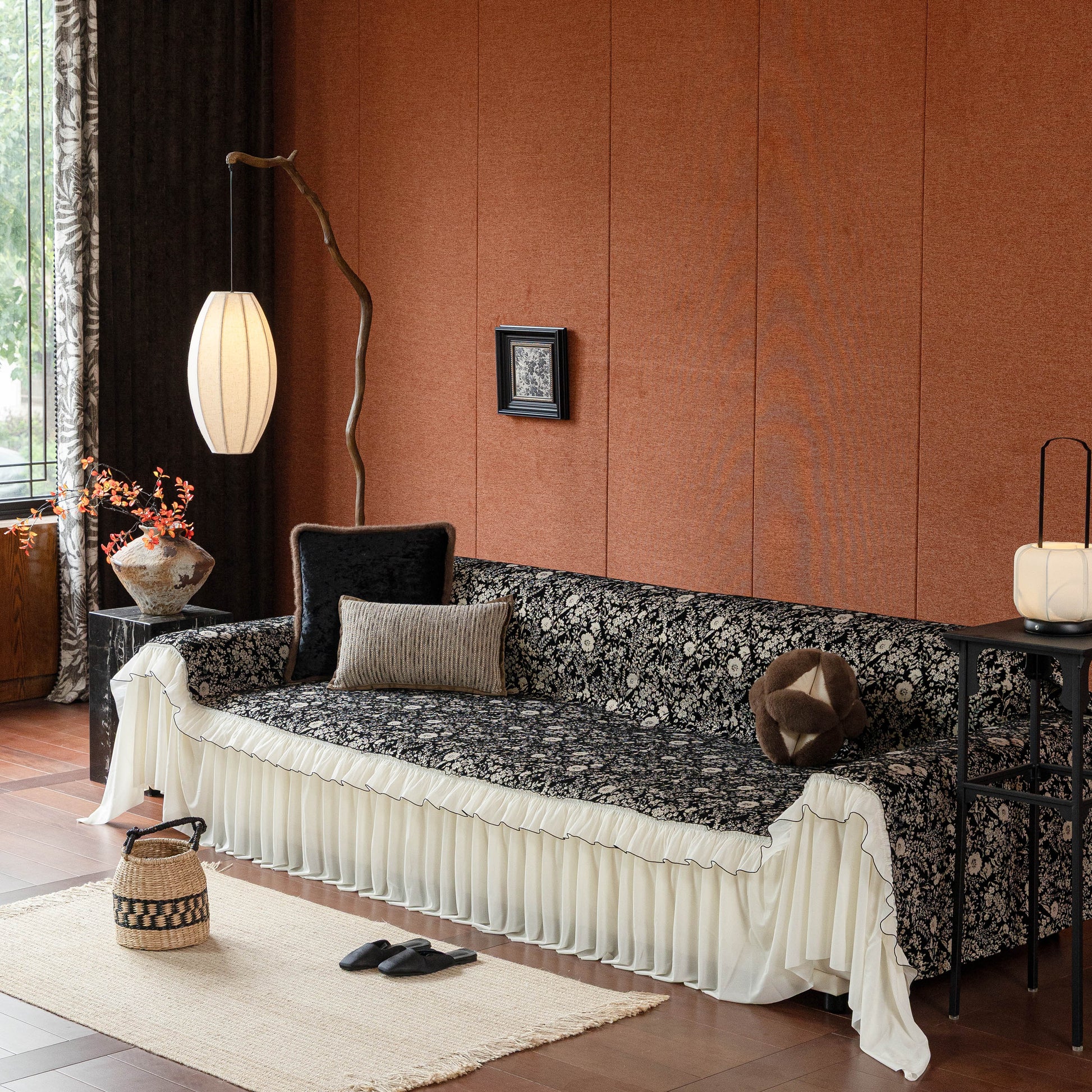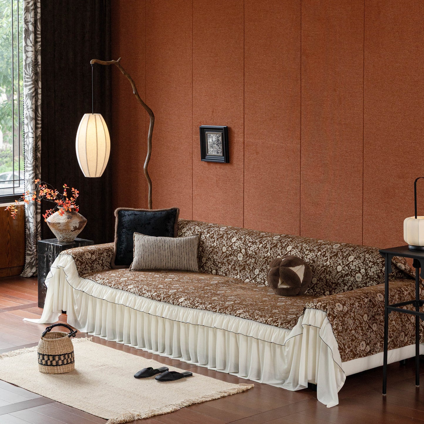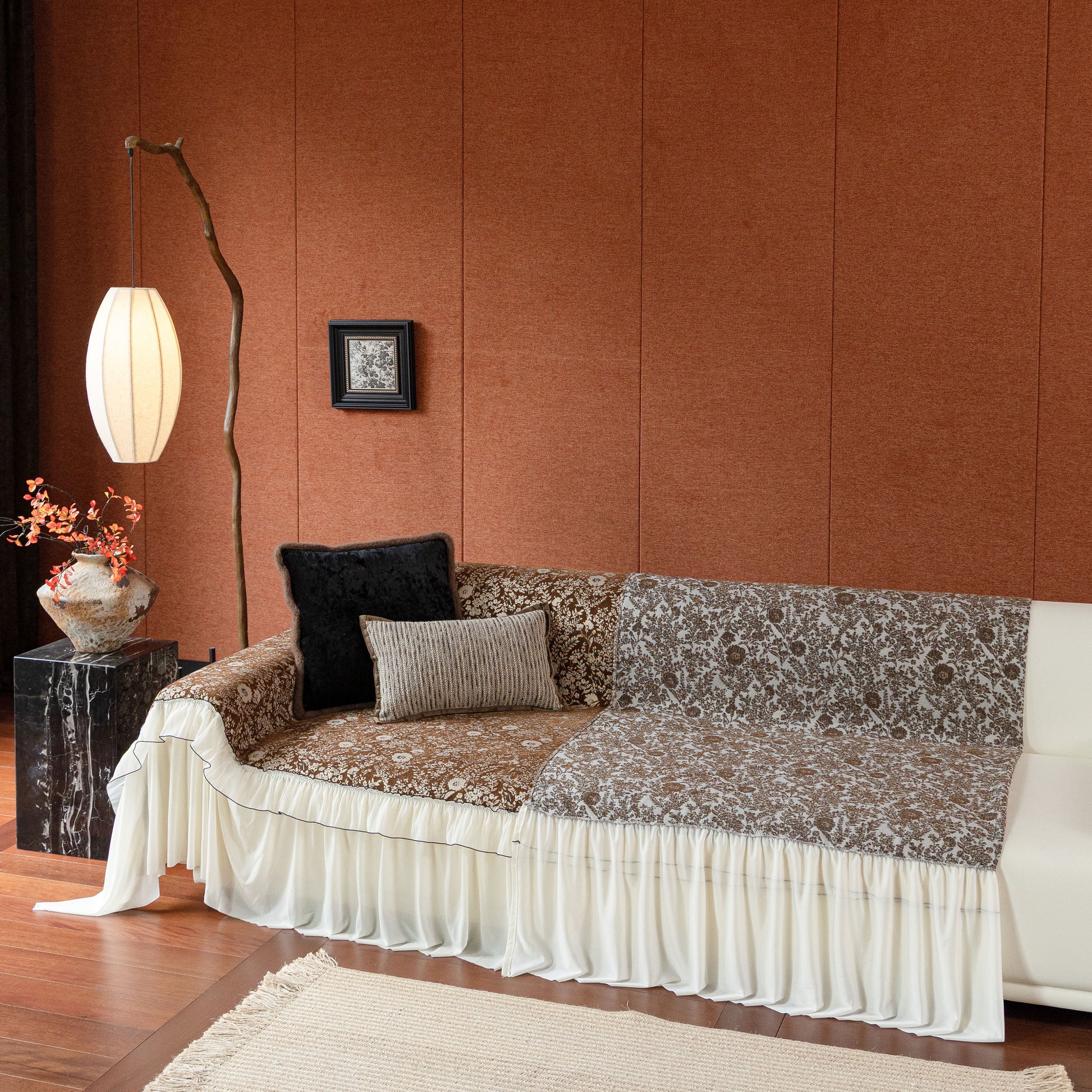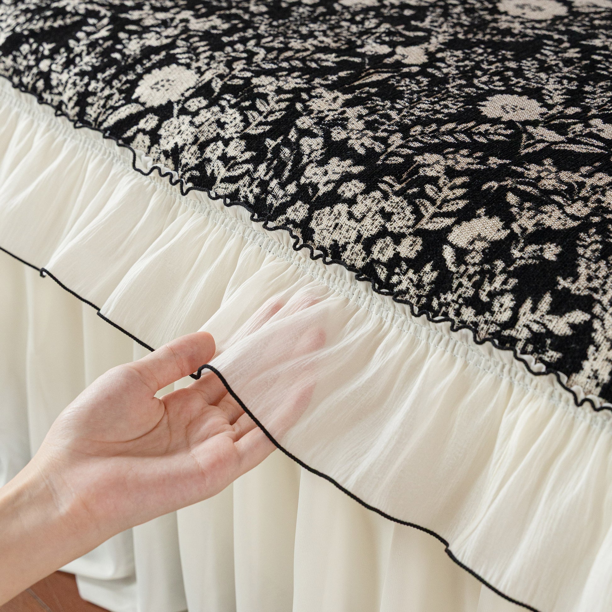 Il copridivano floreale in stile country francese con gonna in chiffon arricciata è un getto decorativo e funzionale progettato per migliorare l'aspetto del tuo soggiorno mentre fornisce una protezione pratica per il divano. La superficie superiore presenta un denso motivo floreale tessuto a jacquard che evoca estetiche europee vintage. Il bordo inferiore è rifinito con una gonna in chiffon arricciata a lunghezza intera, delicatamente cucita con bordi a contrasto, aggiungendo texture e morbidezza visiva al pezzo.