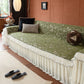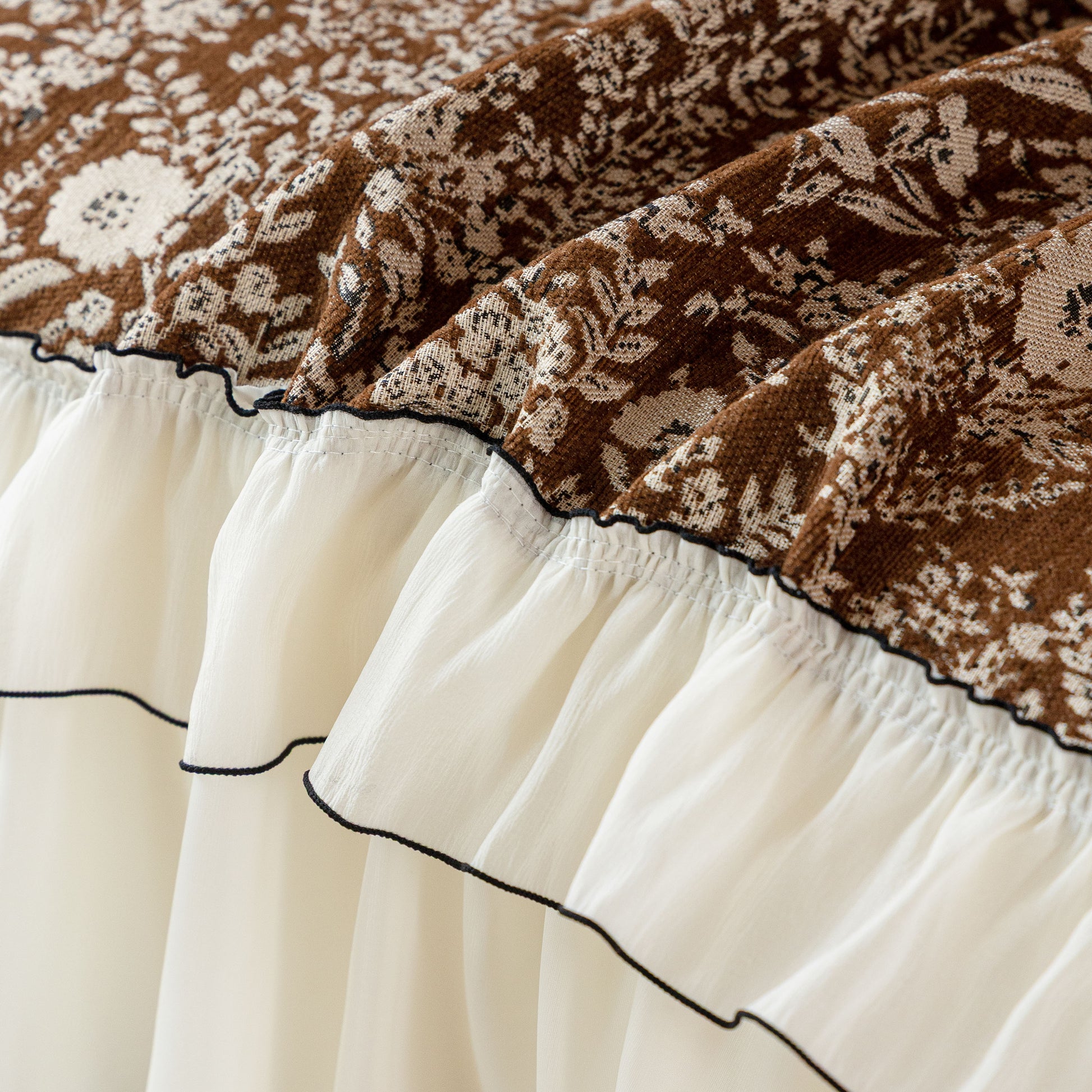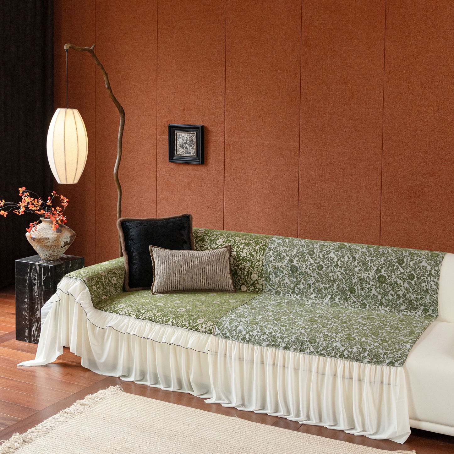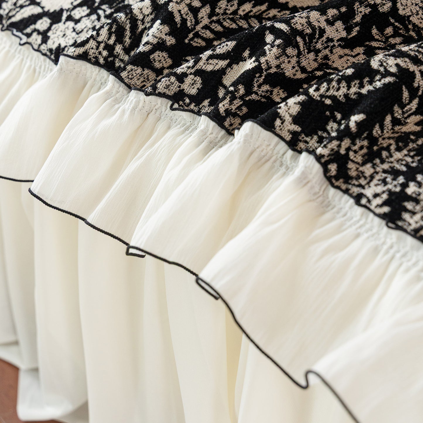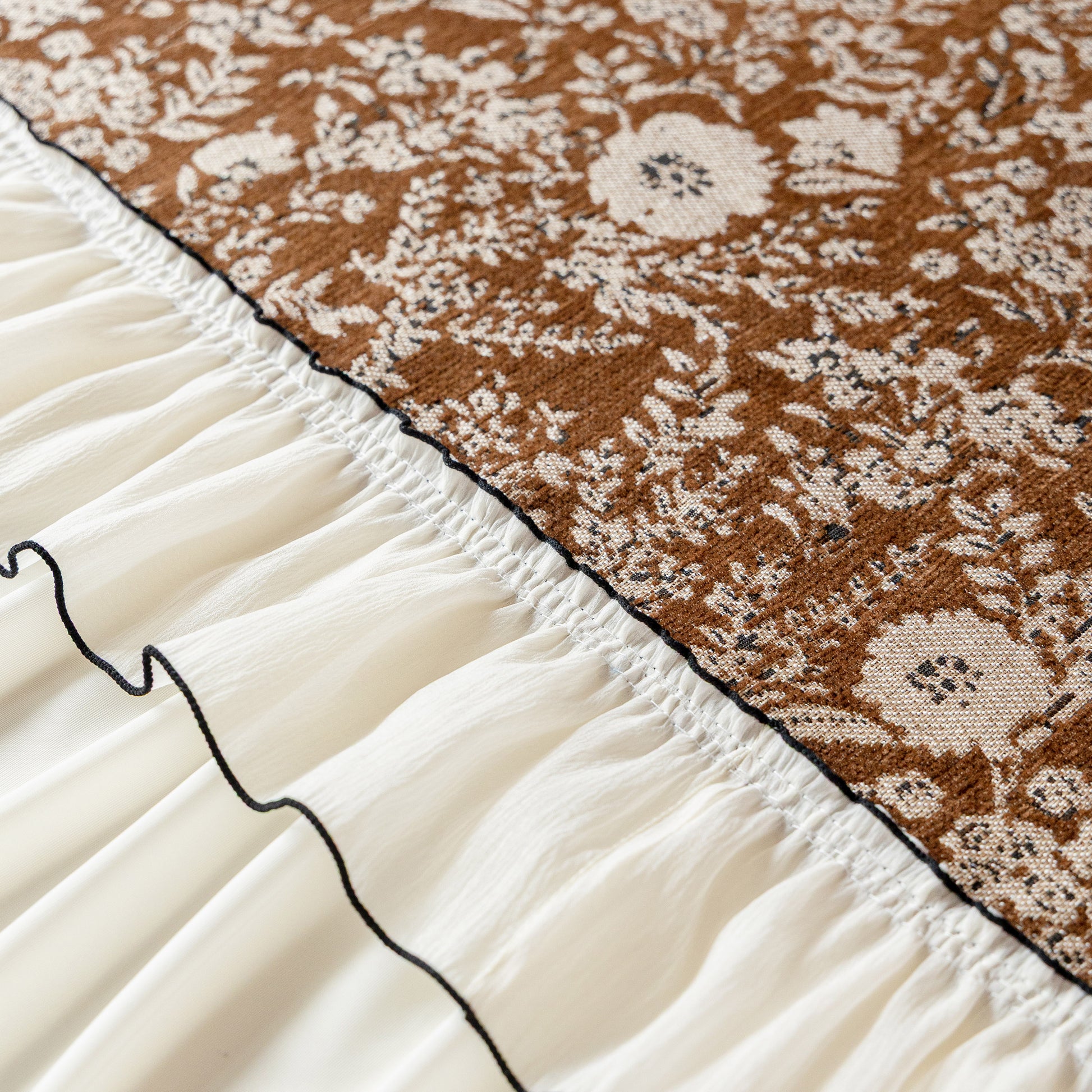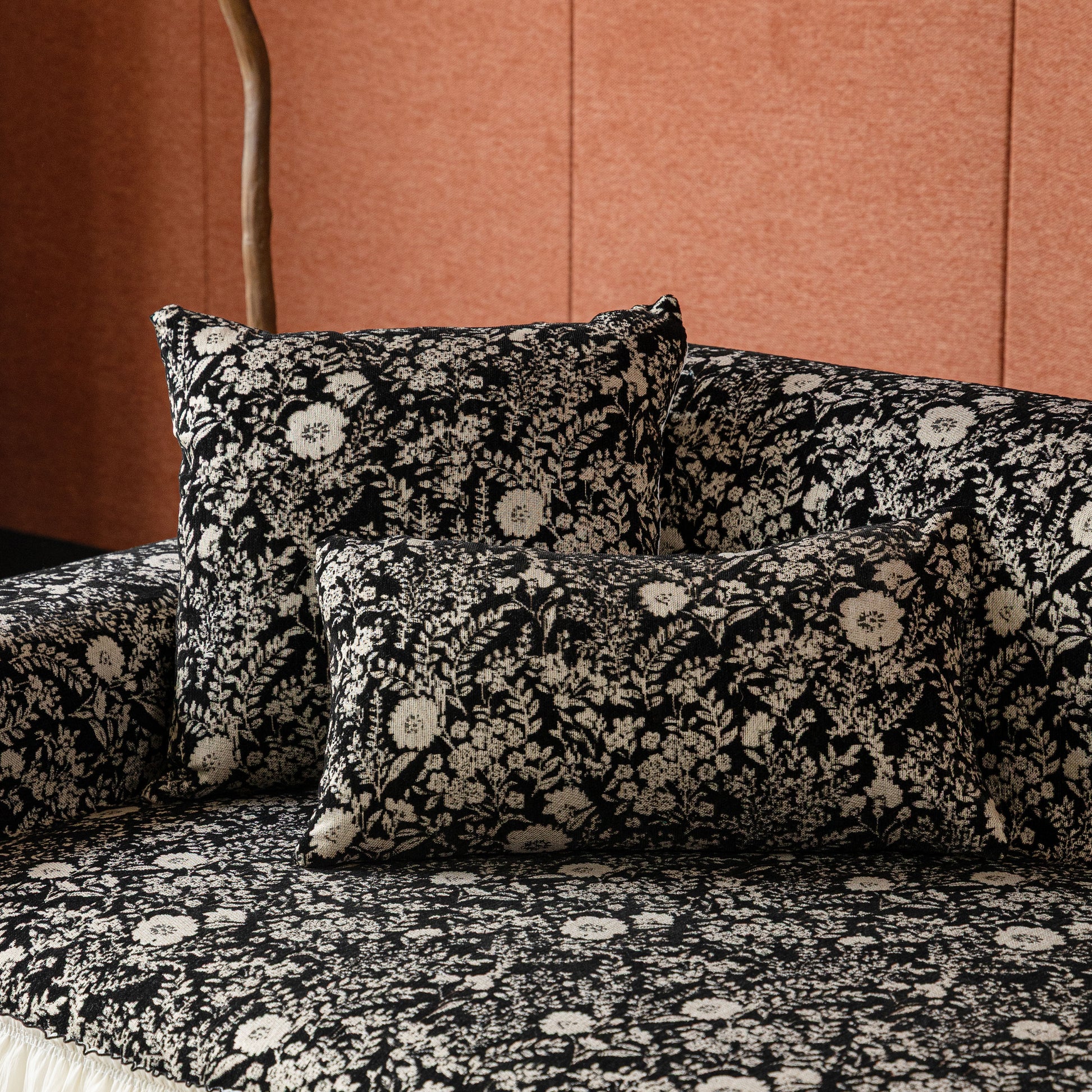 Il copridivano floreale in stile country francese con gonna in chiffon arricciata è un getto decorativo e funzionale progettato per migliorare l'aspetto del tuo soggiorno mentre fornisce una protezione pratica per il divano. La superficie superiore presenta un denso motivo floreale tessuto a jacquard che evoca estetiche europee vintage. Il bordo inferiore è rifinito con una gonna in chiffon arricciata a lunghezza intera, delicatamente cucita con bordi a contrasto, aggiungendo texture e morbidezza visiva al pezzo.