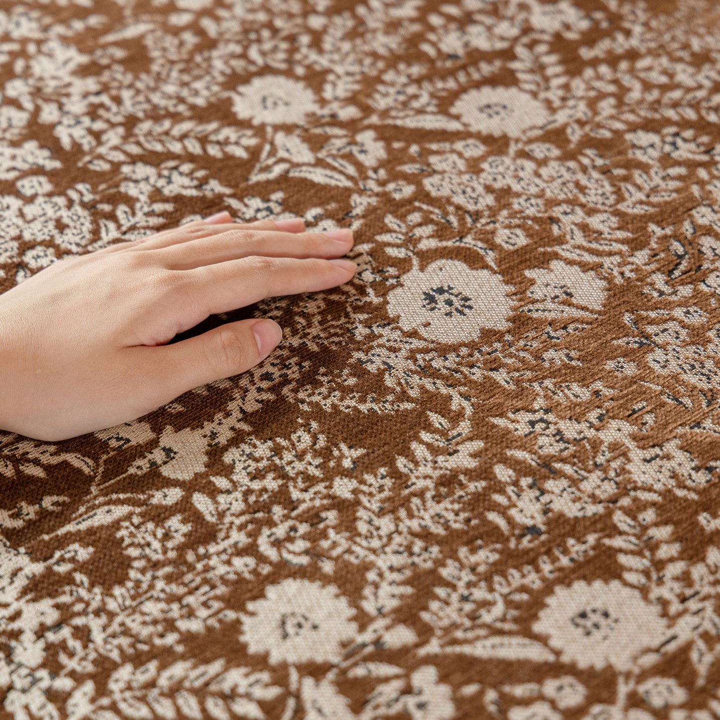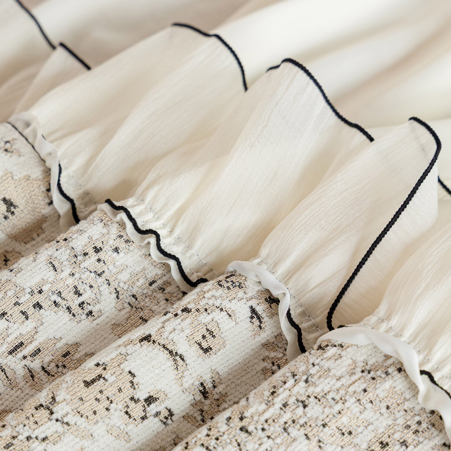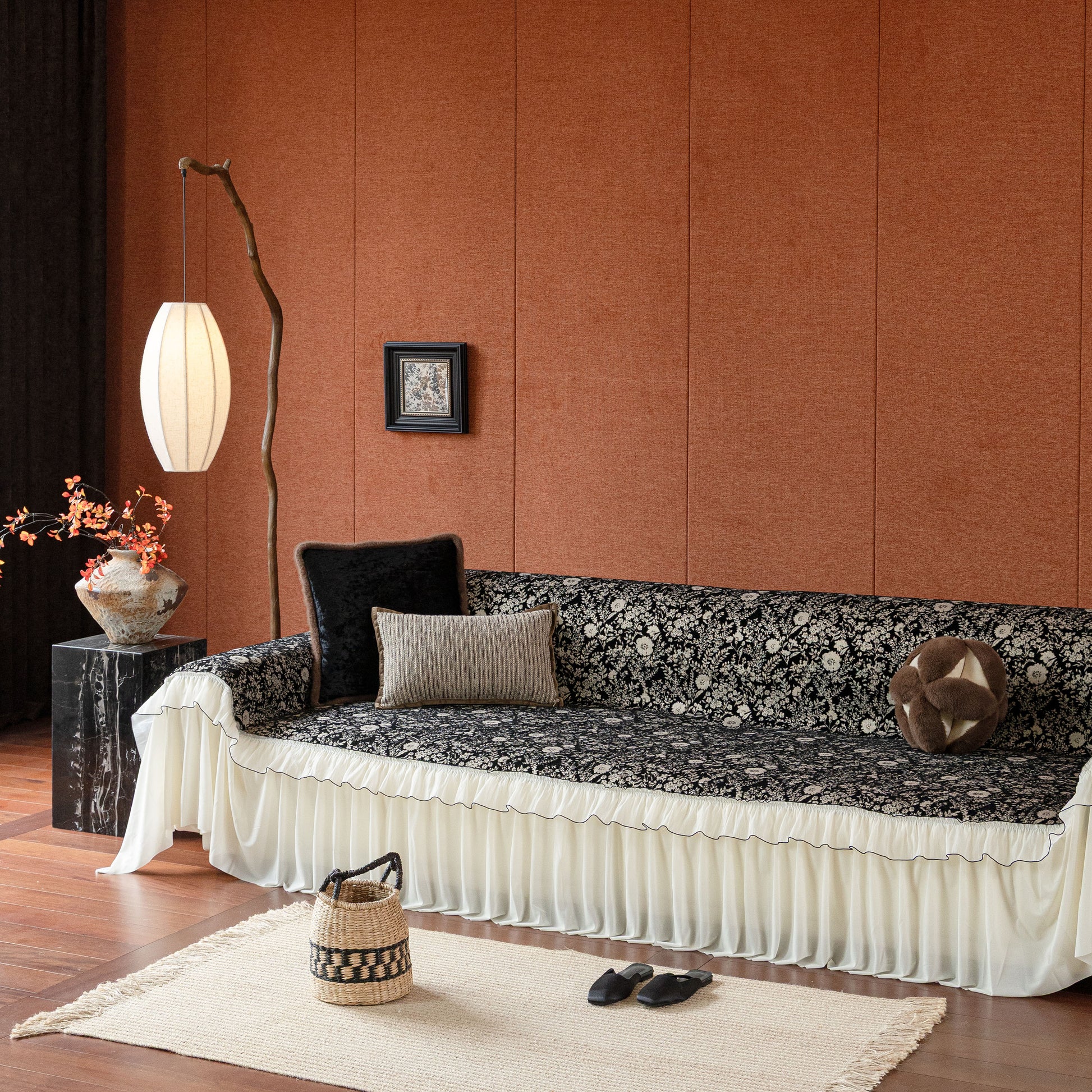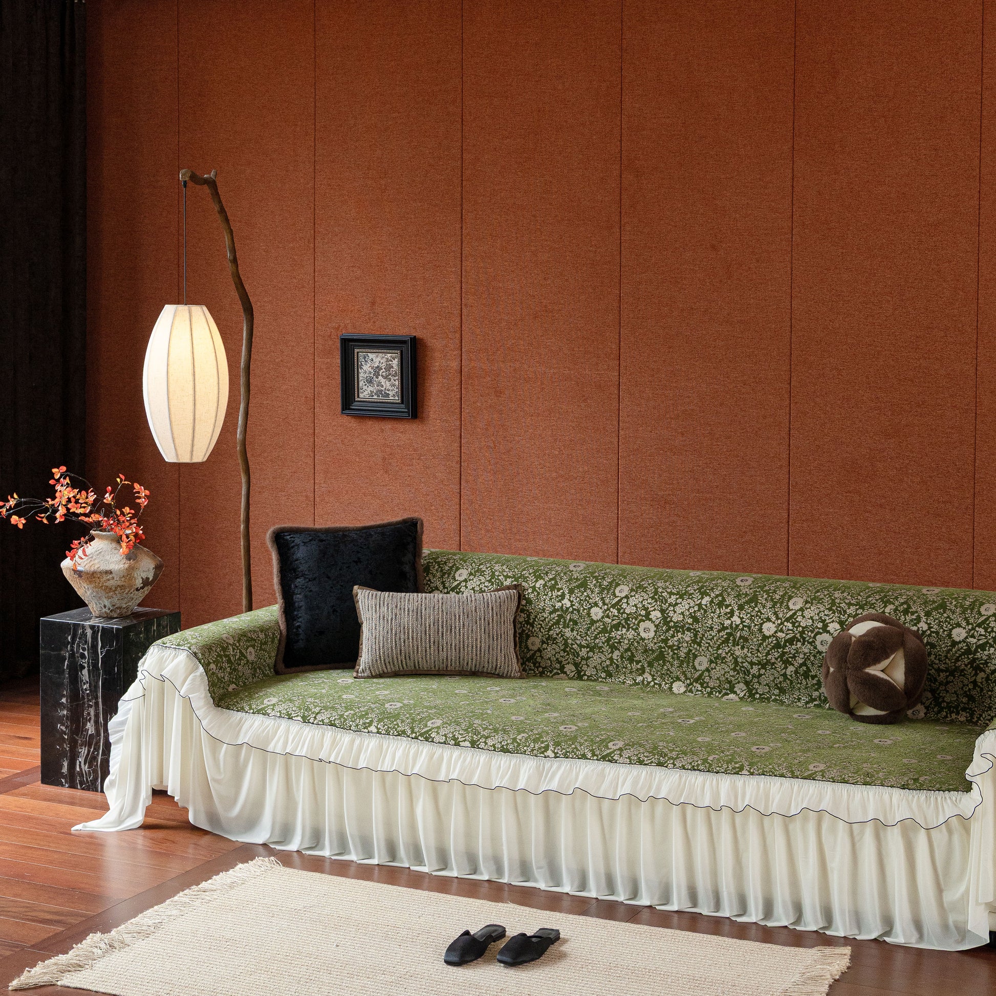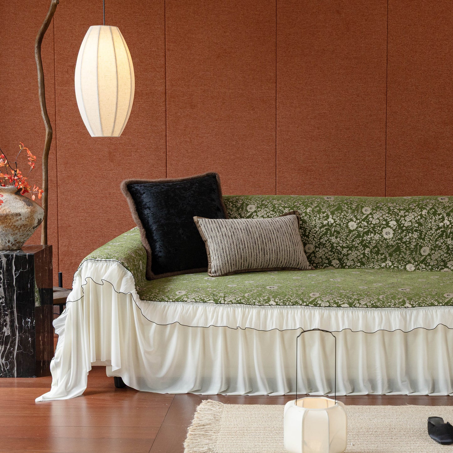 Il copridivano floreale in stile country francese con gonna in chiffon arricciata è un getto decorativo e funzionale progettato per migliorare l'aspetto del tuo soggiorno mentre fornisce una protezione pratica per il divano. La superficie superiore presenta un denso motivo floreale tessuto a jacquard che evoca estetiche europee vintage. Il bordo inferiore è rifinito con una gonna in chiffon arricciata a lunghezza intera, delicatamente cucita con bordi a contrasto, aggiungendo texture e morbidezza visiva al pezzo.