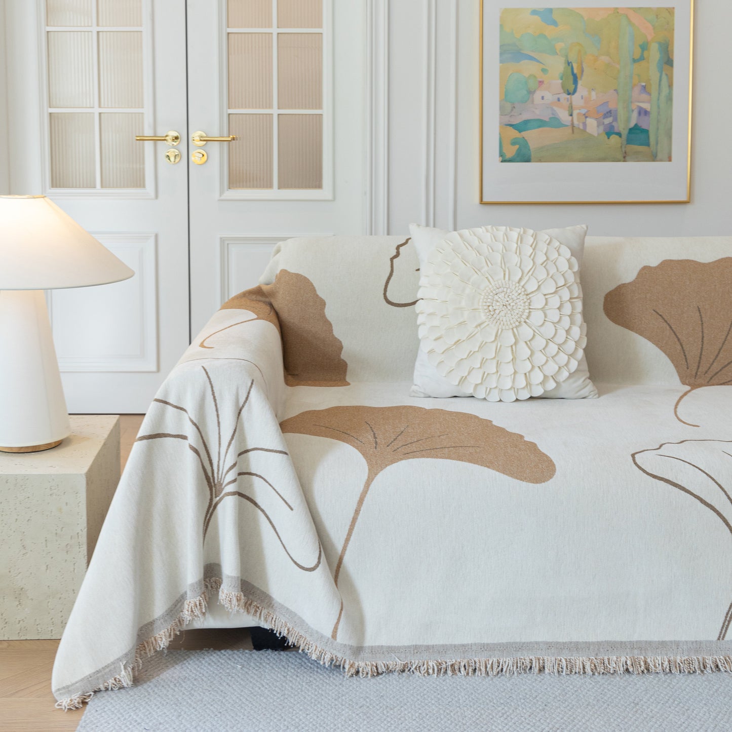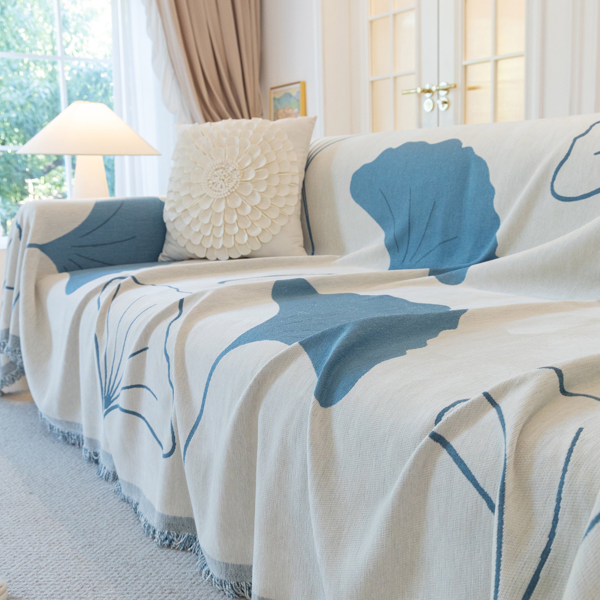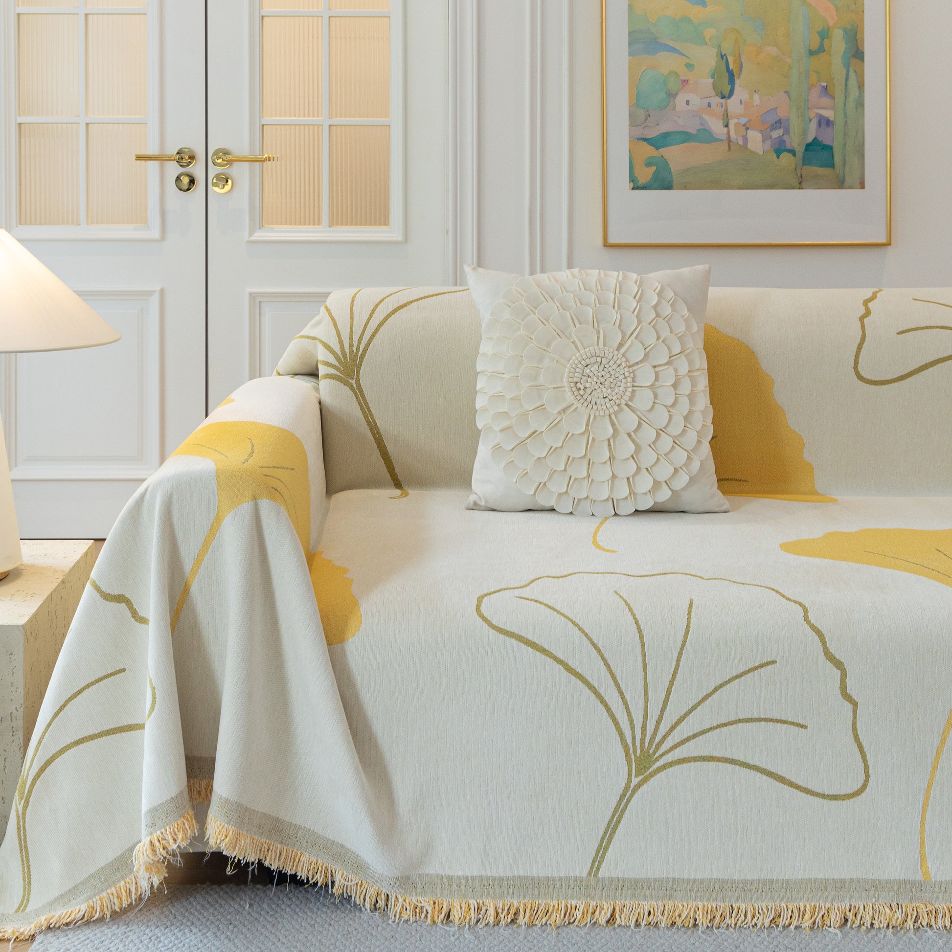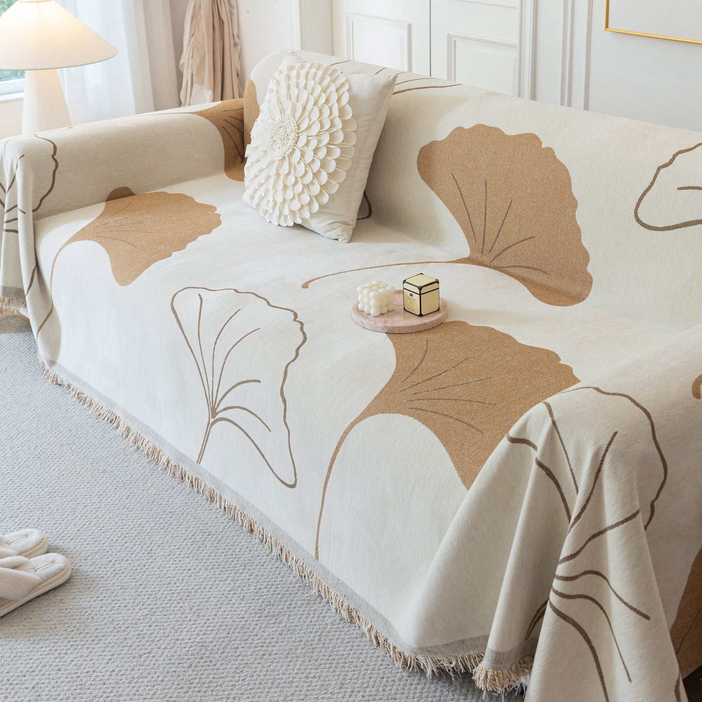 Cozy Couch Throw Blanket with Tassels, Jacquard Leaf Pattern Furniture Protector