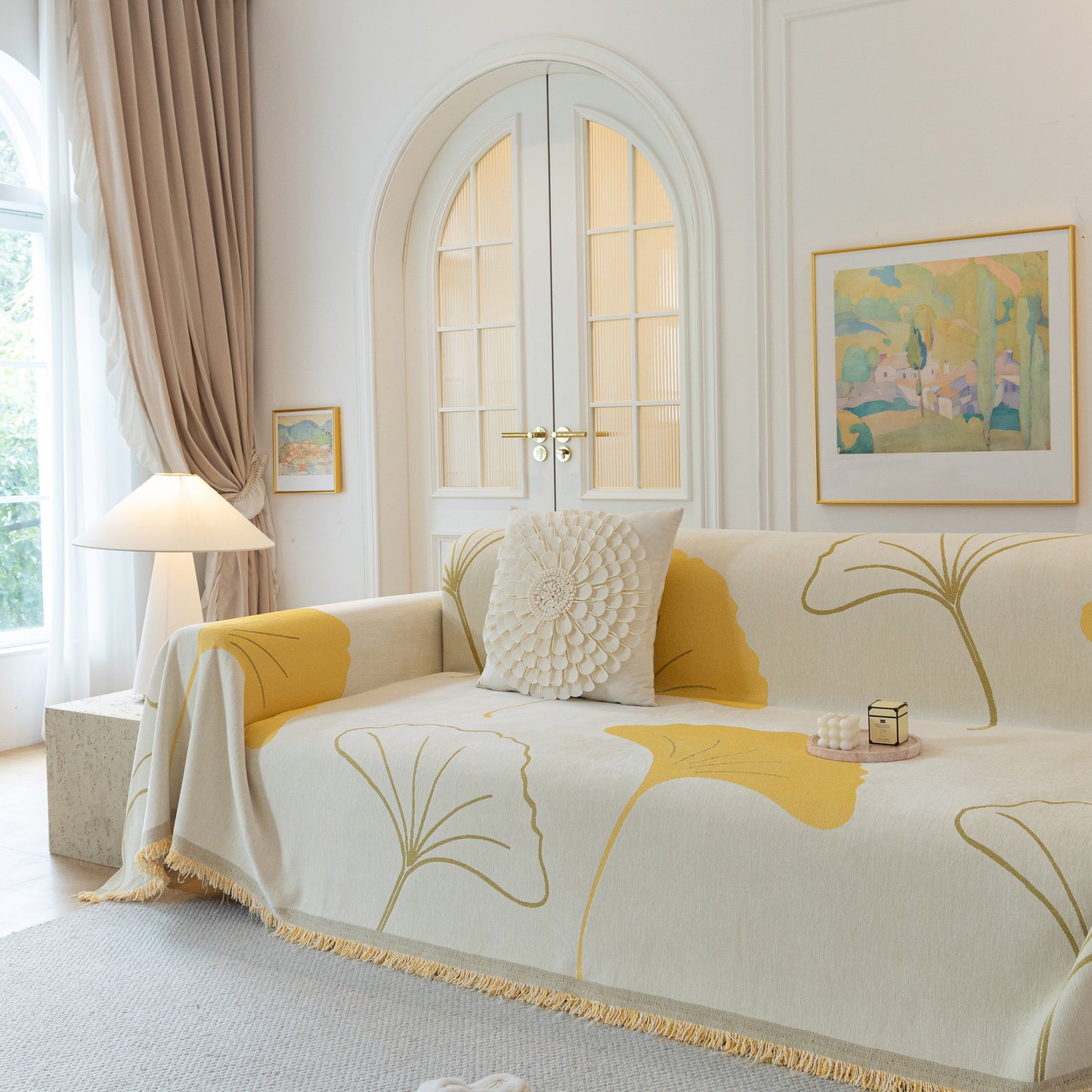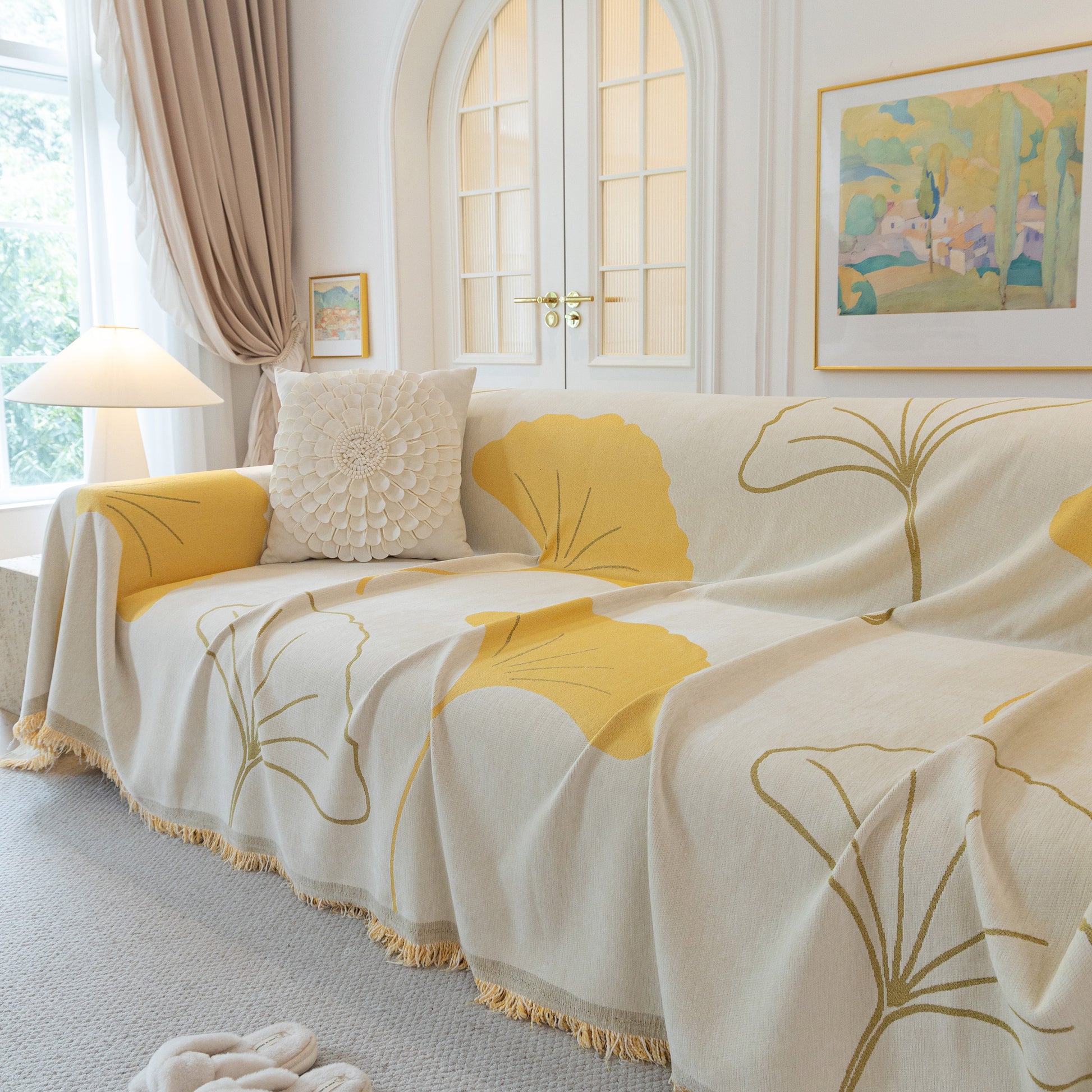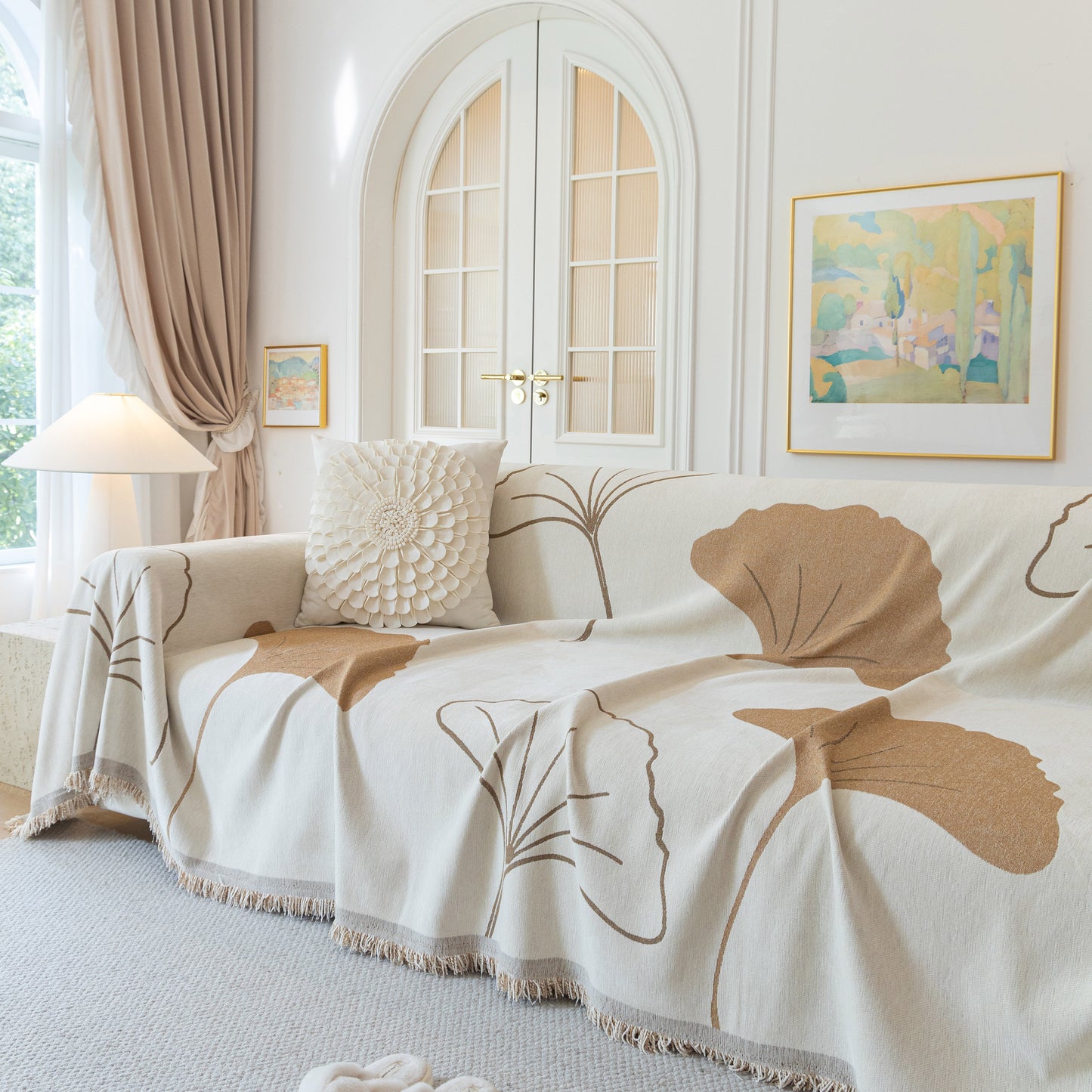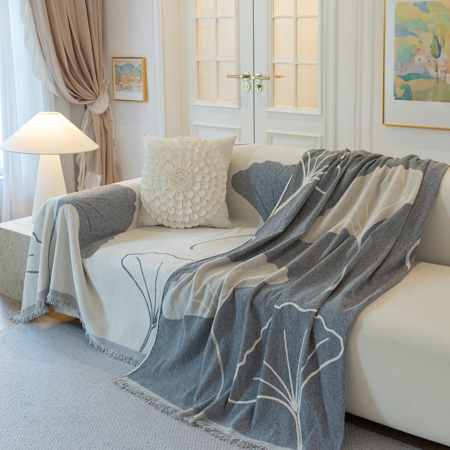 Cozy Couch Throw Blanket with Tassels, Jacquard Leaf Pattern Furniture Protector
