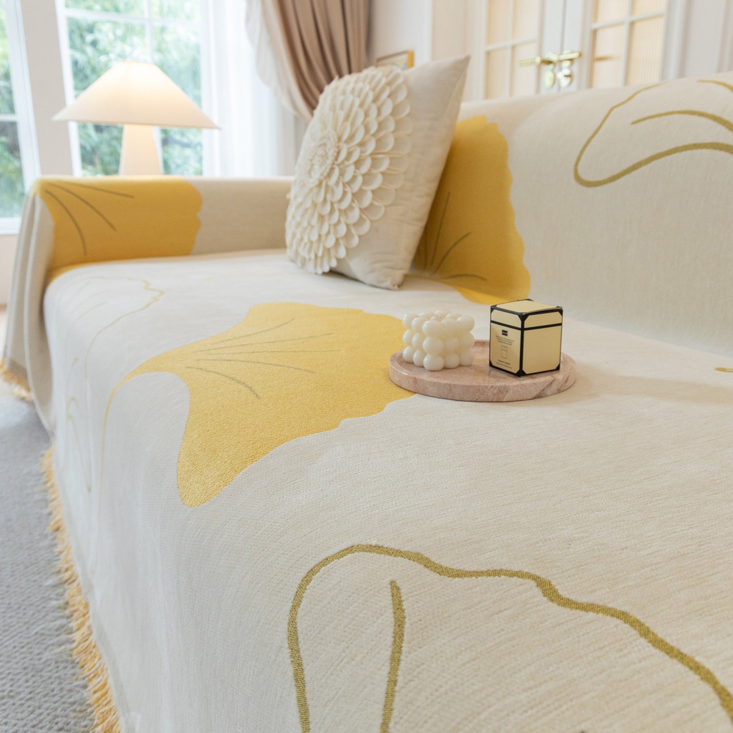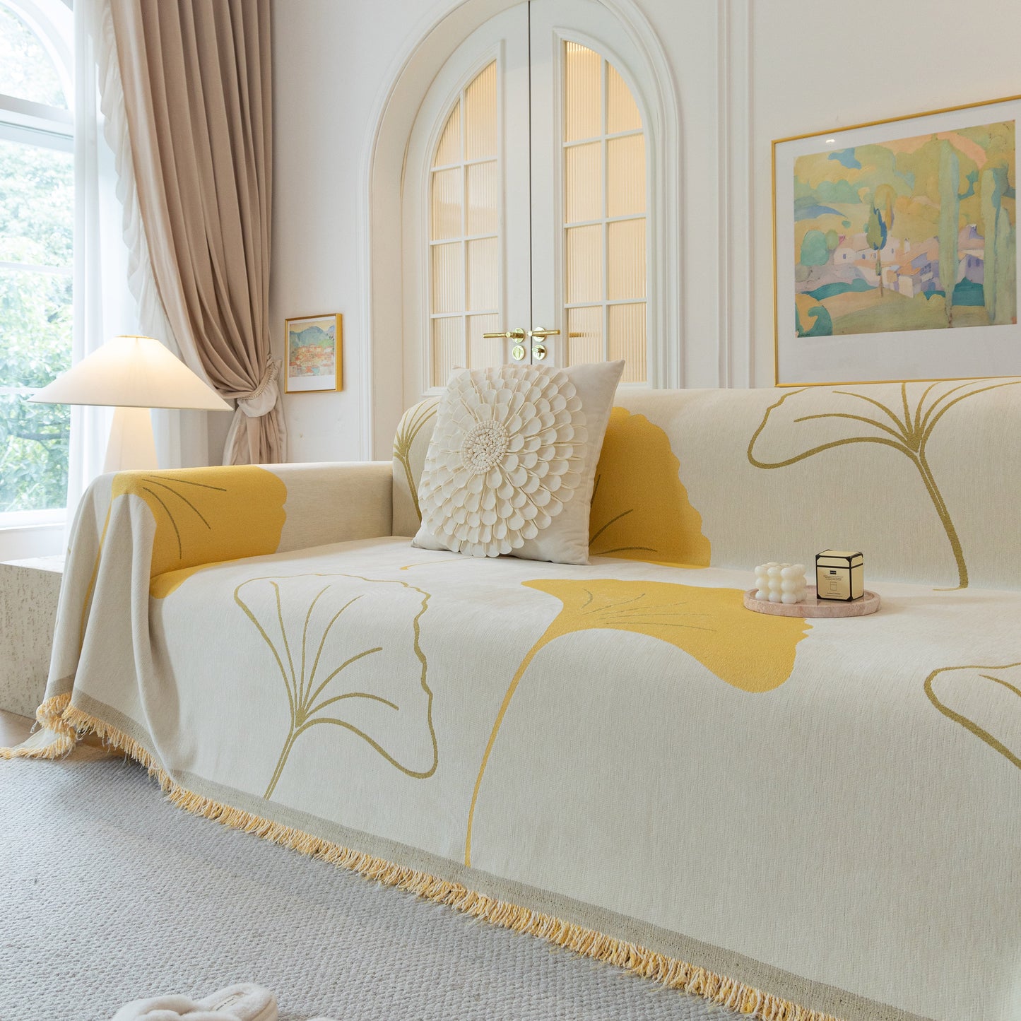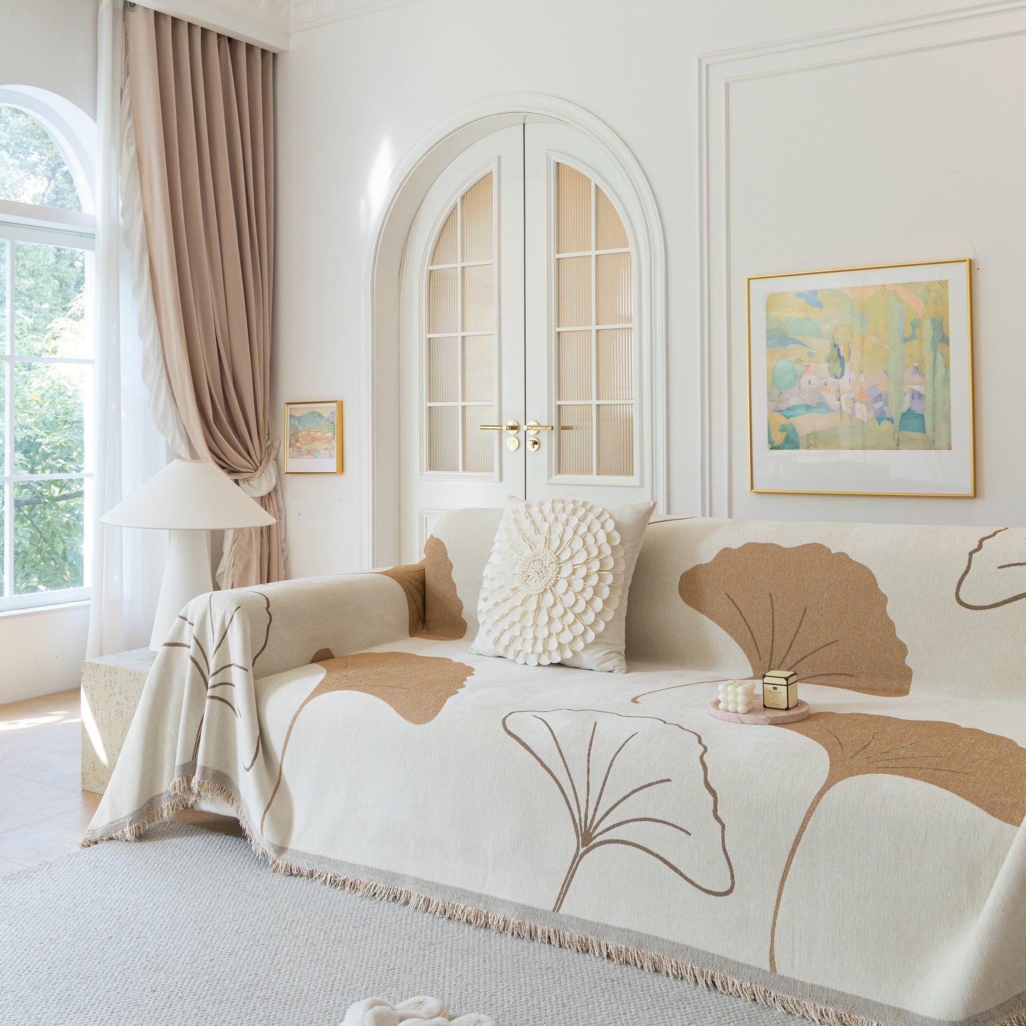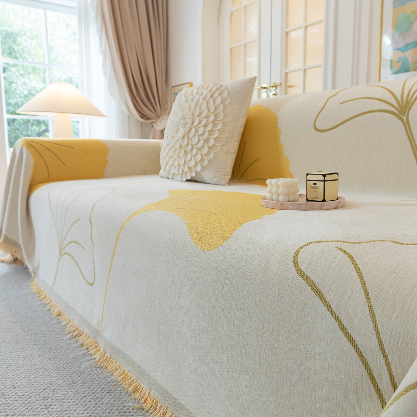 Cozy Couch Throw Blanket with Tassels, Jacquard Leaf Pattern Furniture Protector
