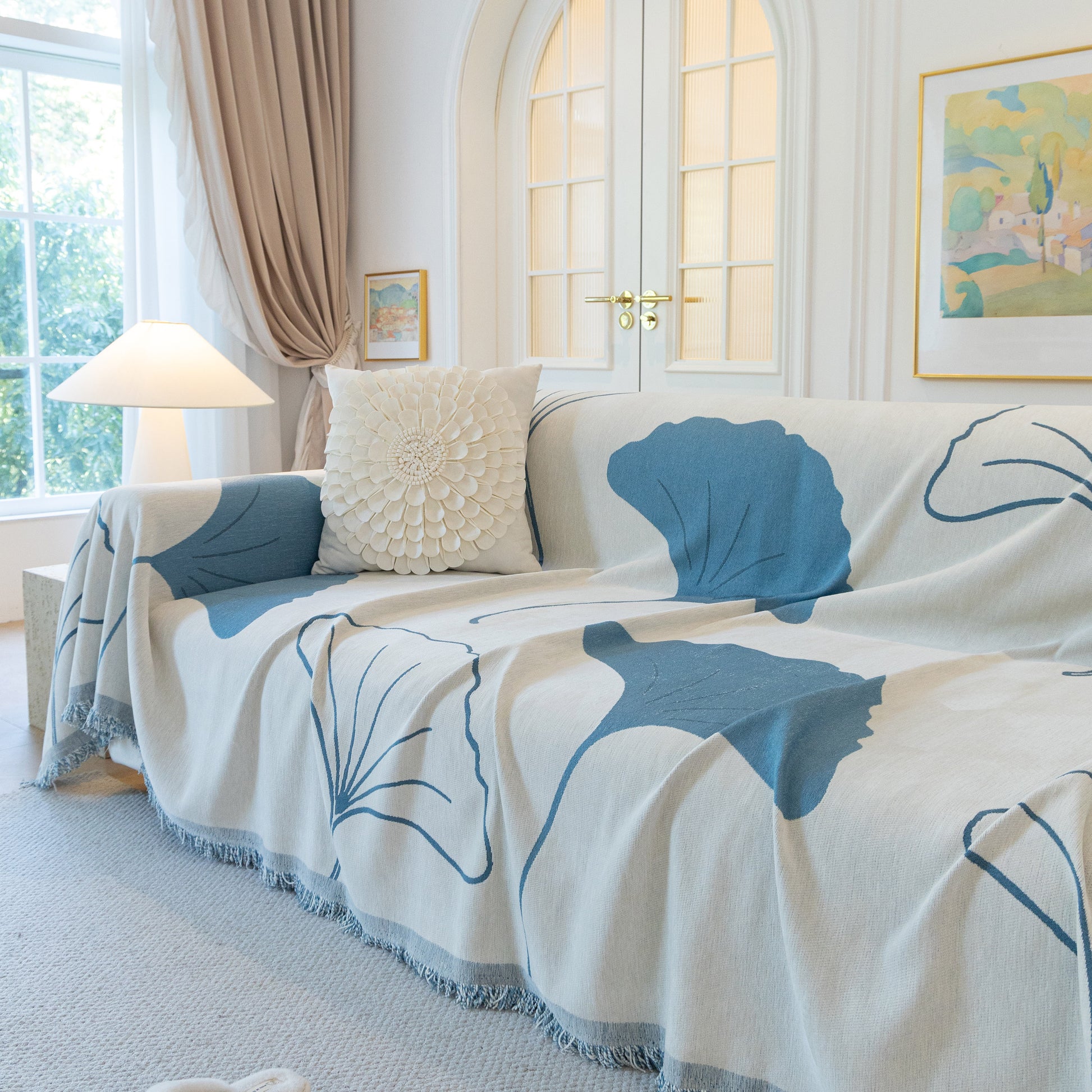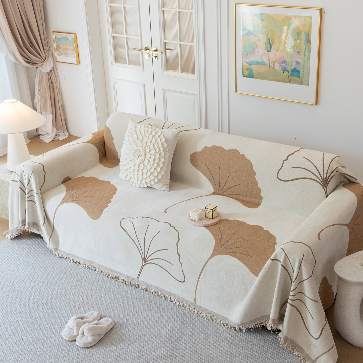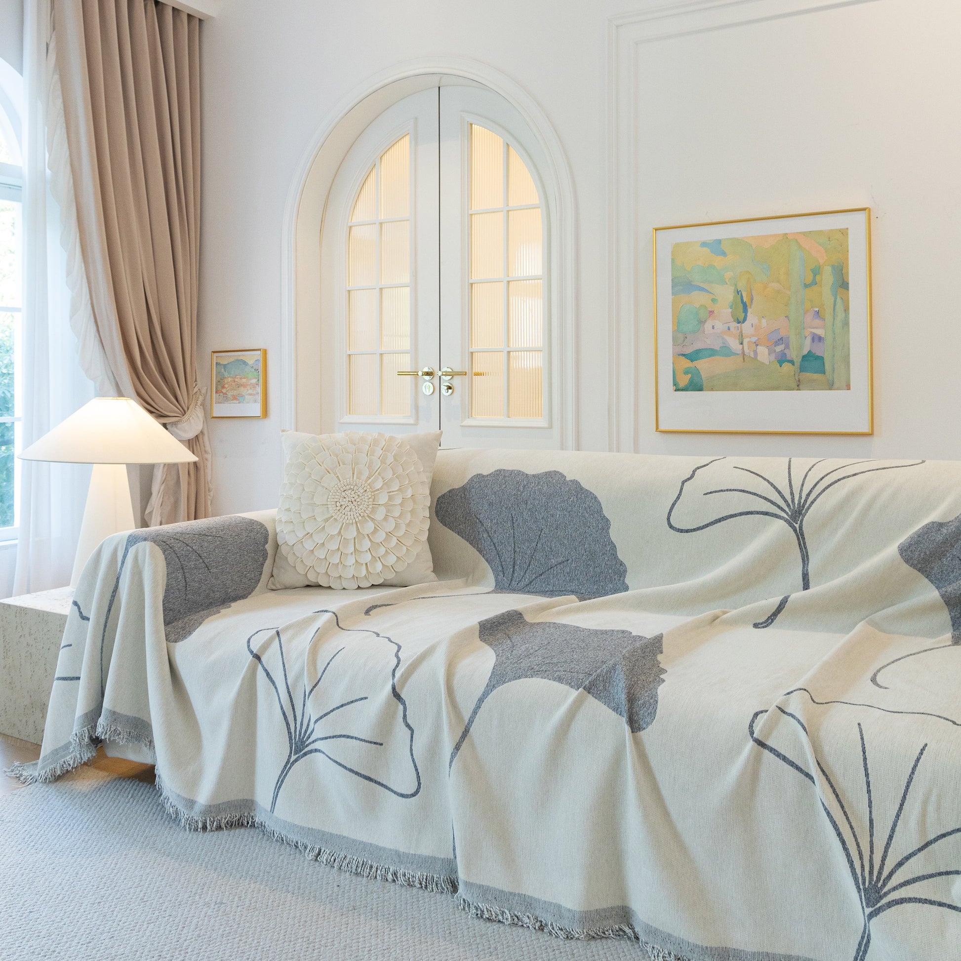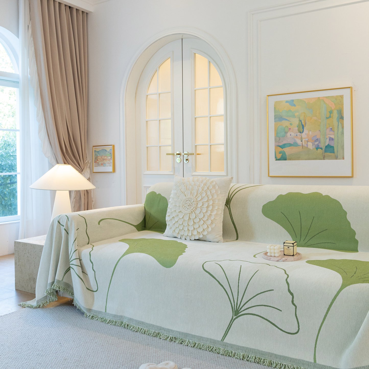 The stylized botanical leaf pattern is created directly in the fabric through a jacquard technique, offering enhanced texture and durability. Finished with decorative fringe, this versatile piece can be used as a full sofa protector, a decorative bedspread, or simply a cozy throw. It effectively guards furniture against daily wear, spills, and pet hair, and is fully machine washable for easy care.