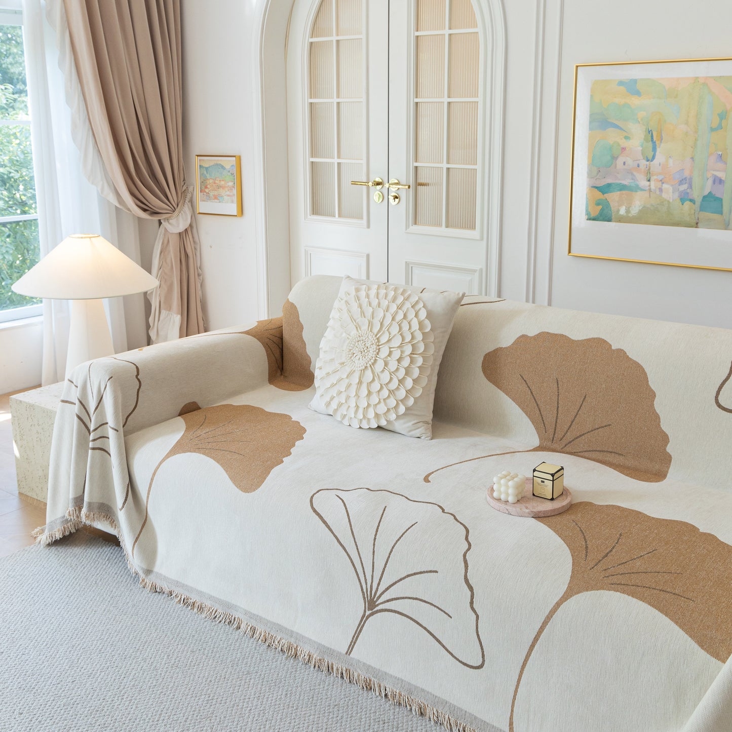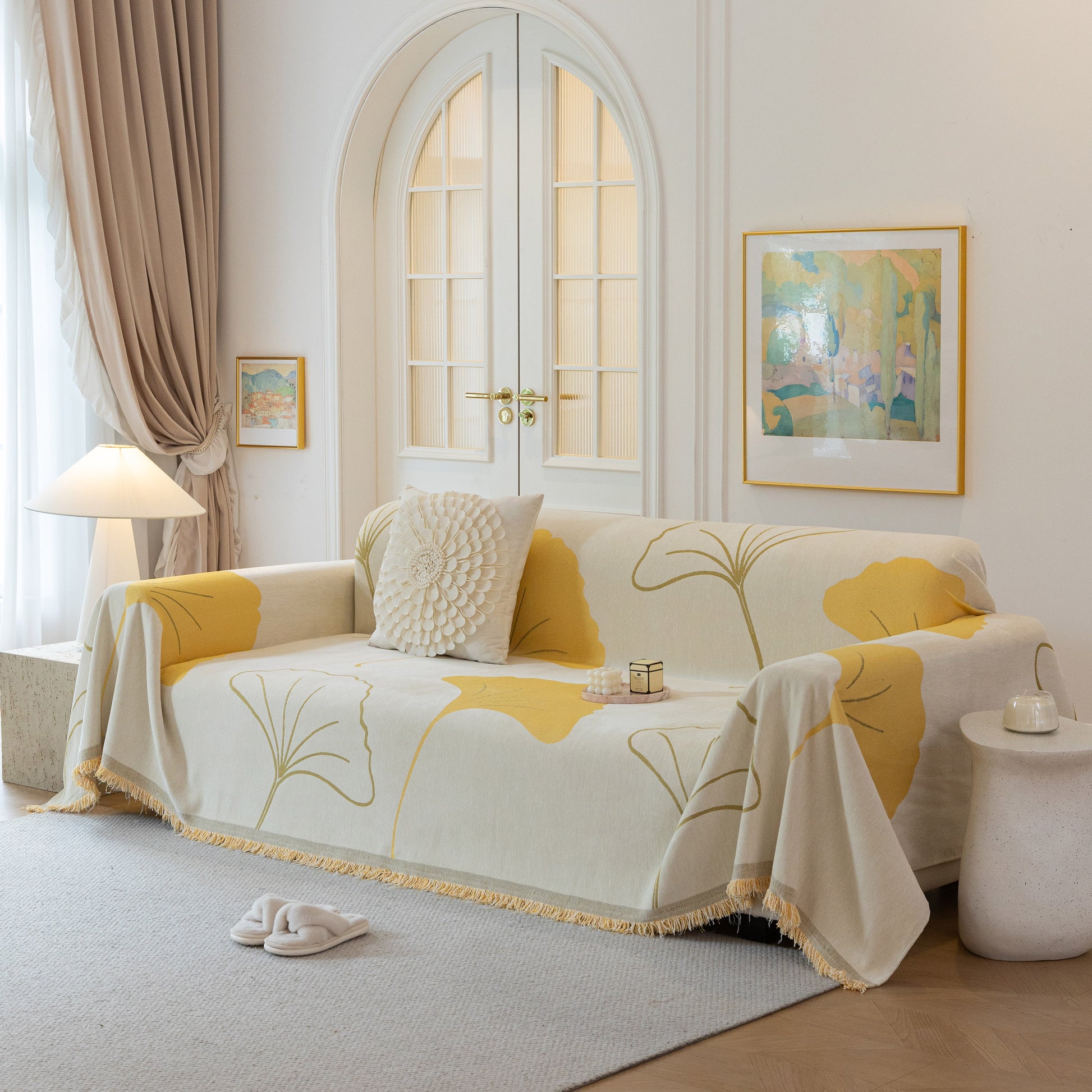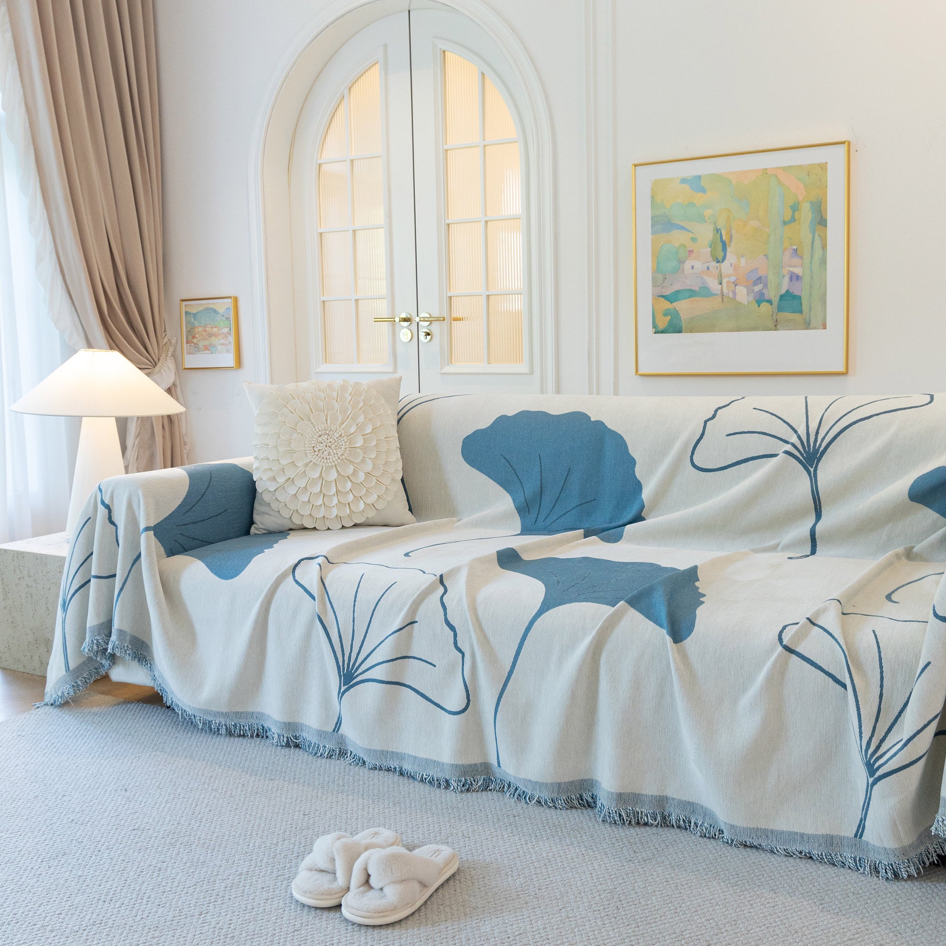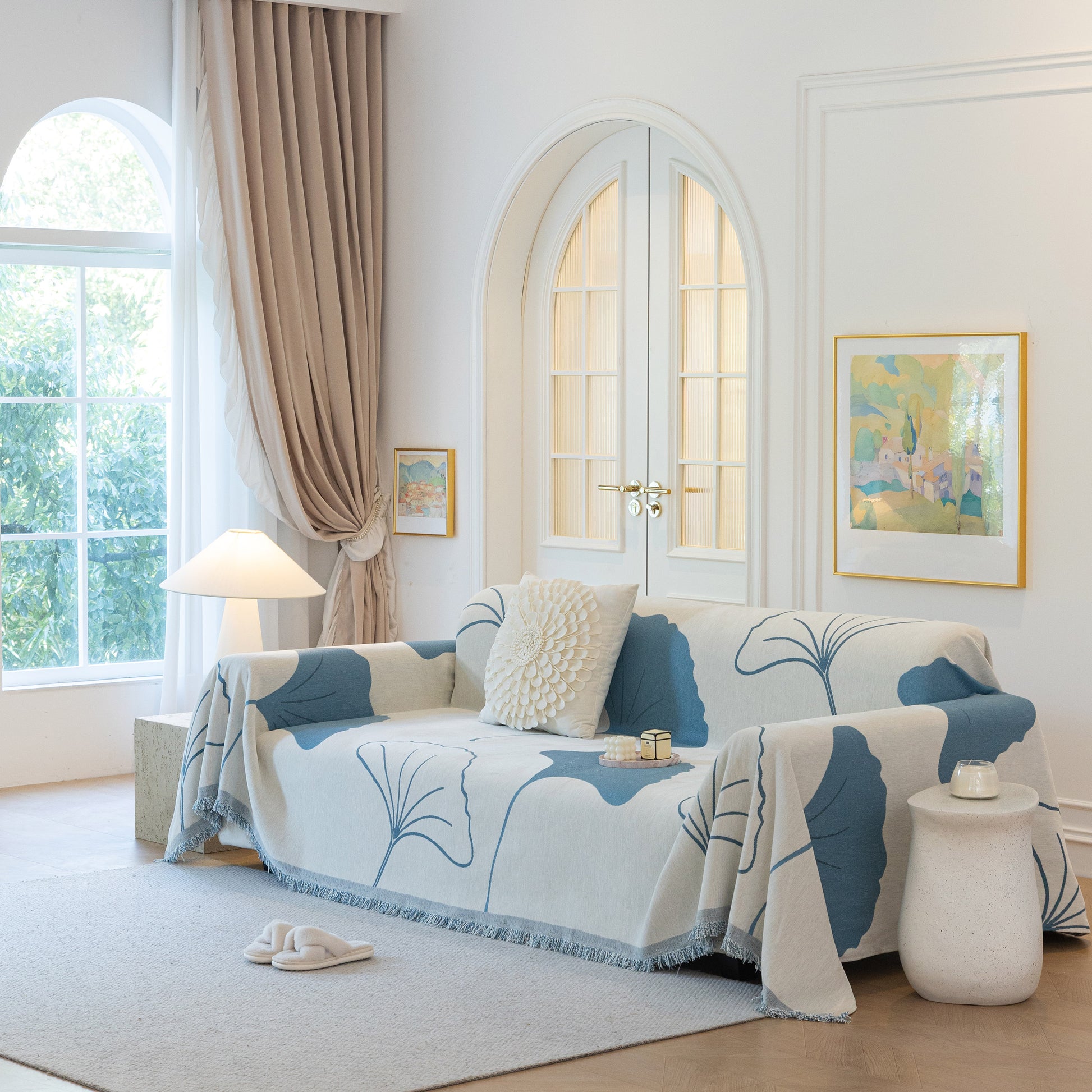 The stylized botanical leaf pattern is created directly in the fabric through a jacquard technique, offering enhanced texture and durability. Finished with decorative fringe, this versatile piece can be used as a full sofa protector, a decorative bedspread, or simply a cozy throw. It effectively guards furniture against daily wear, spills, and pet hair, and is fully machine washable for easy care.