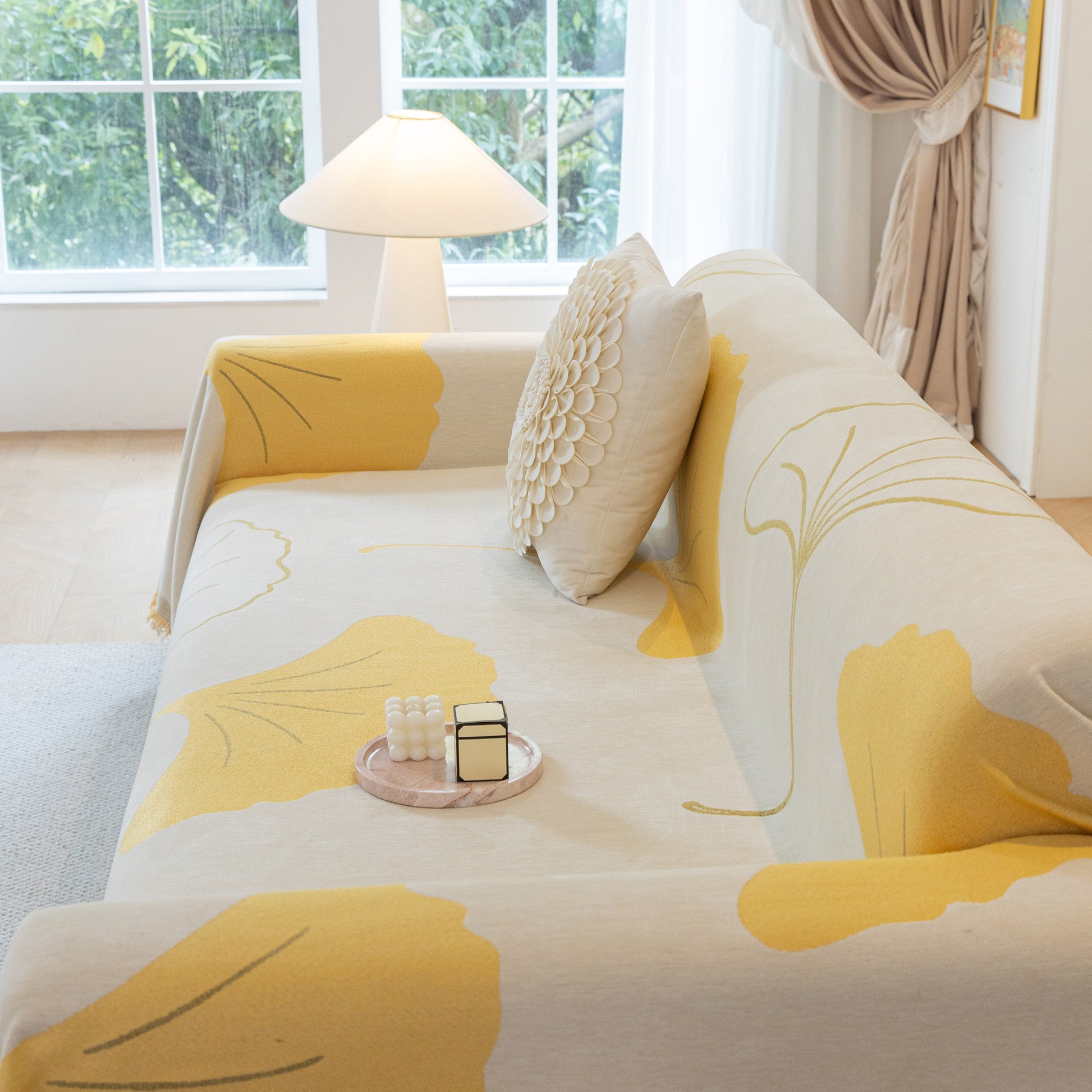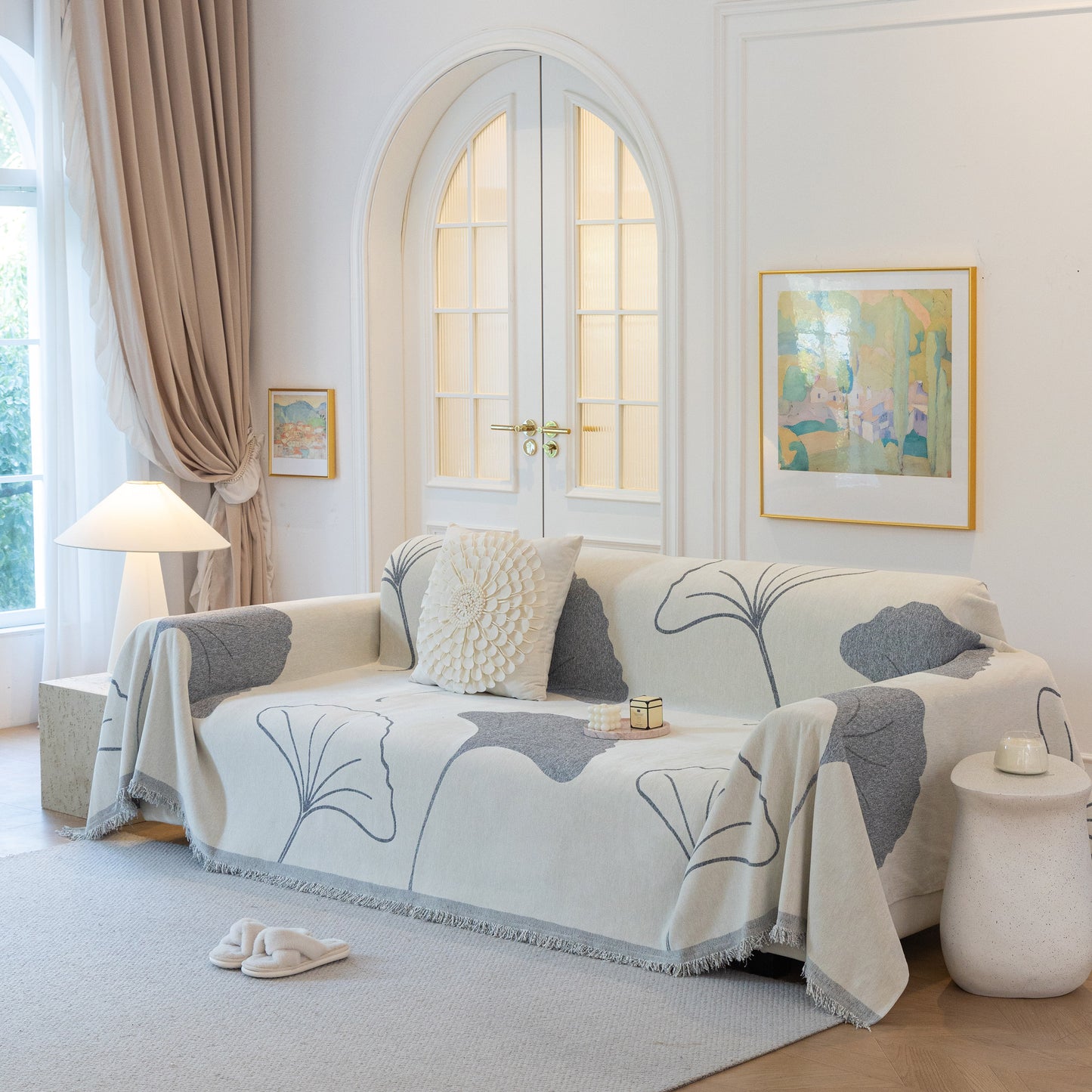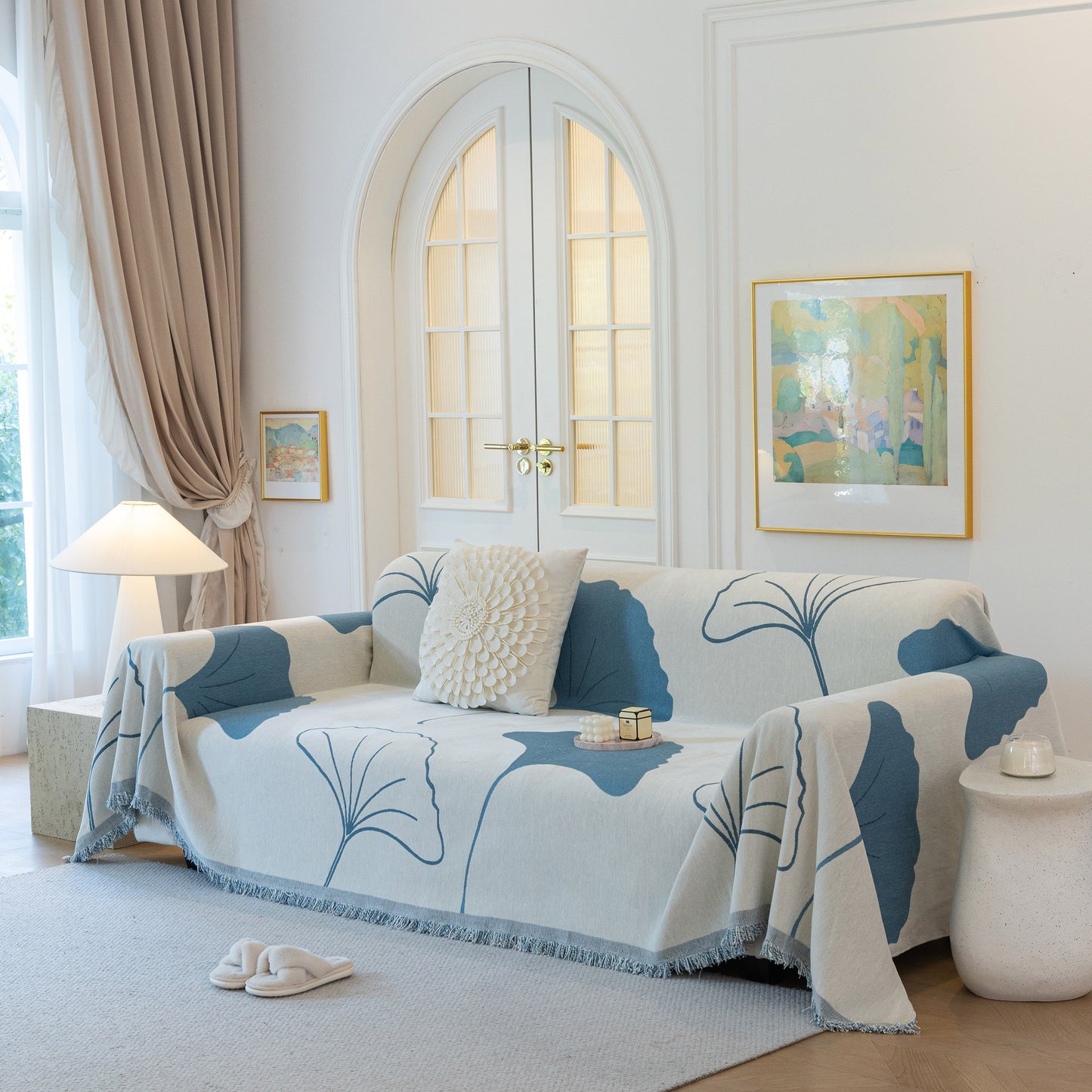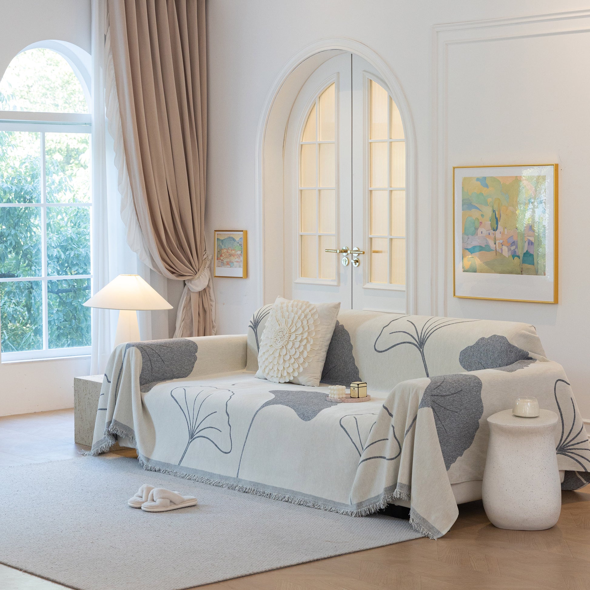The stylized botanical leaf pattern is created directly in the fabric through a jacquard technique, offering enhanced texture and durability. Finished with decorative fringe, this versatile piece can be used as a full sofa protector, a decorative bedspread, or simply a cozy throw. It effectively guards furniture against daily wear, spills, and pet hair, and is fully machine washable for easy care.