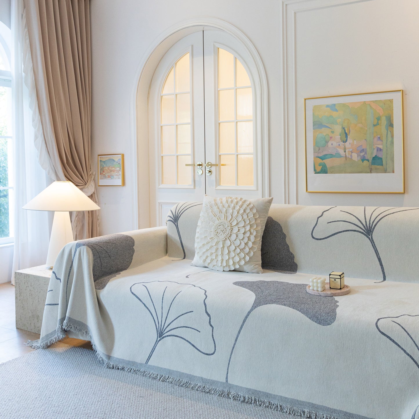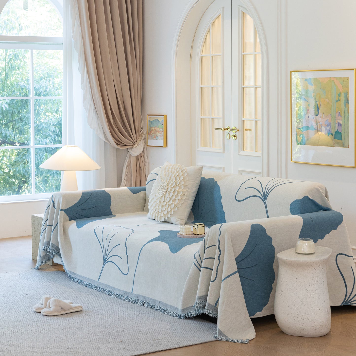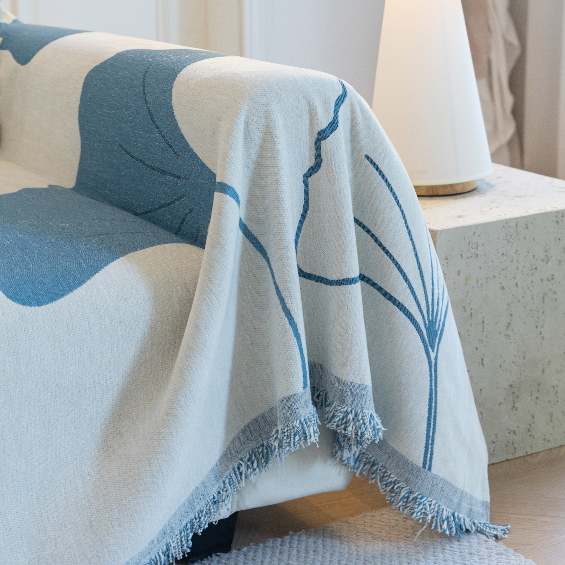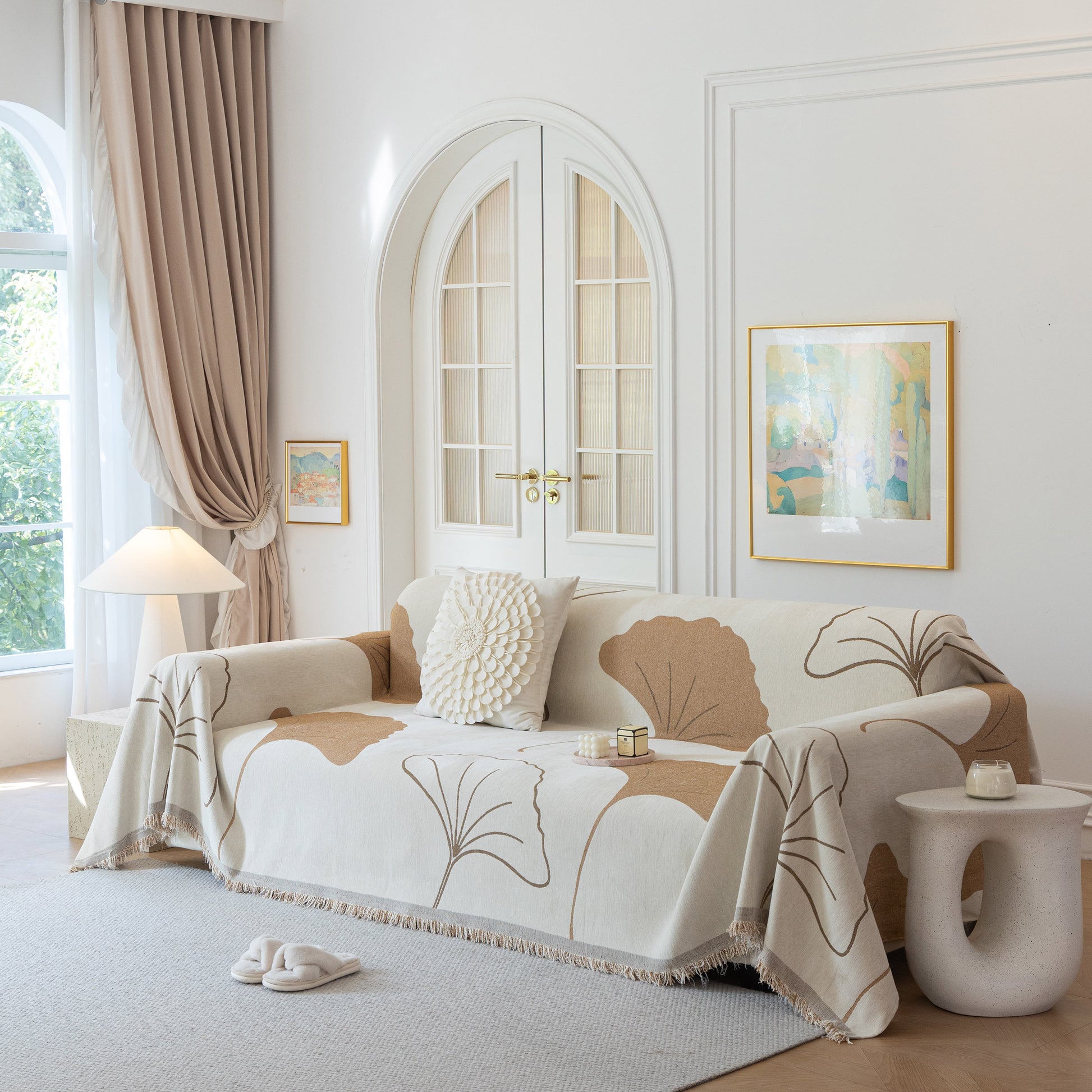 The stylized botanical leaf pattern is created directly in the fabric through a jacquard technique, offering enhanced texture and durability. Finished with decorative fringe, this versatile piece can be used as a full sofa protector, a decorative bedspread, or simply a cozy throw. It effectively guards furniture against daily wear, spills, and pet hair, and is fully machine washable for easy care.