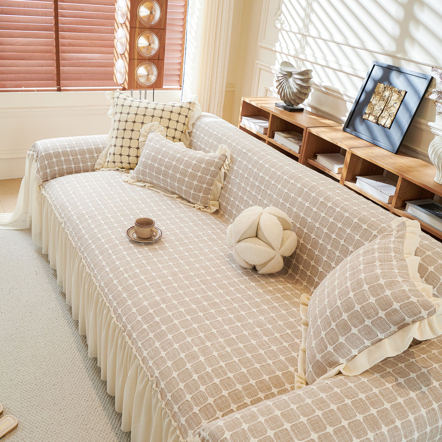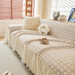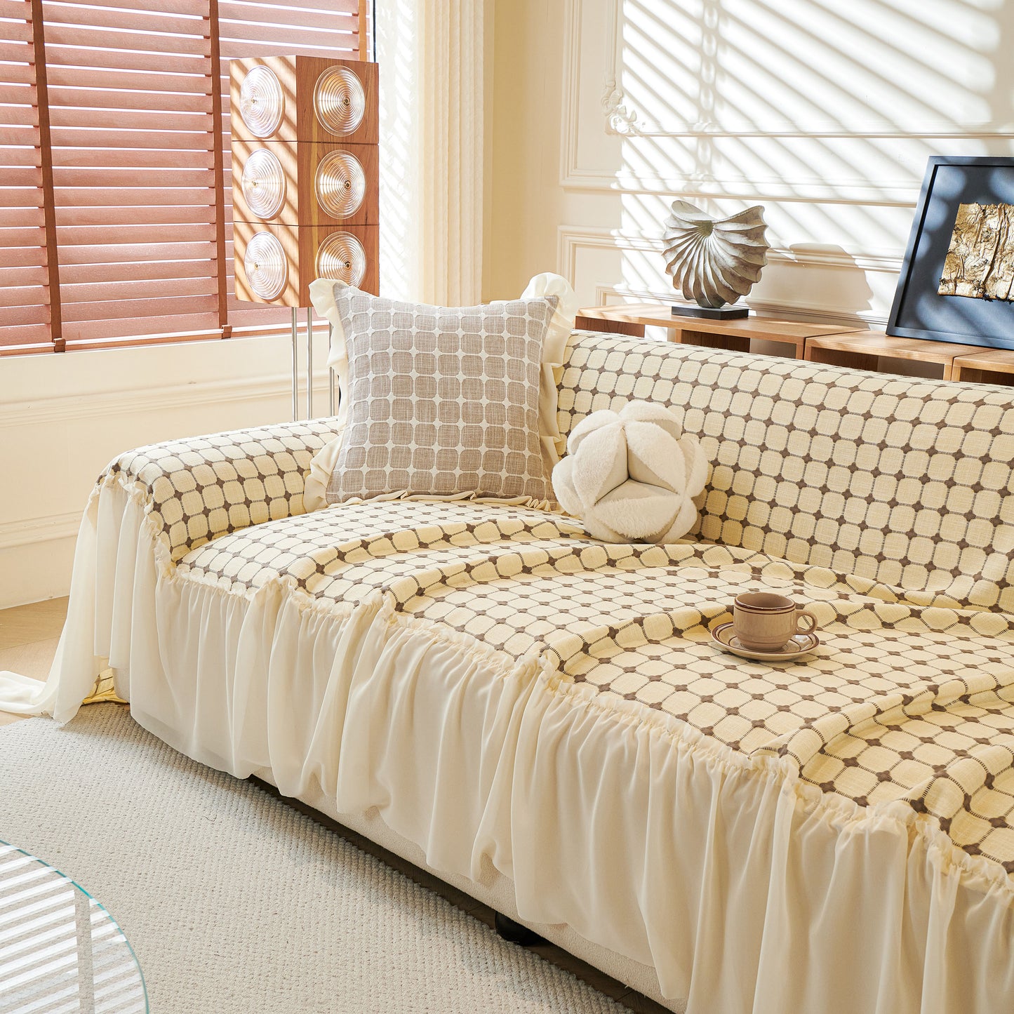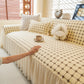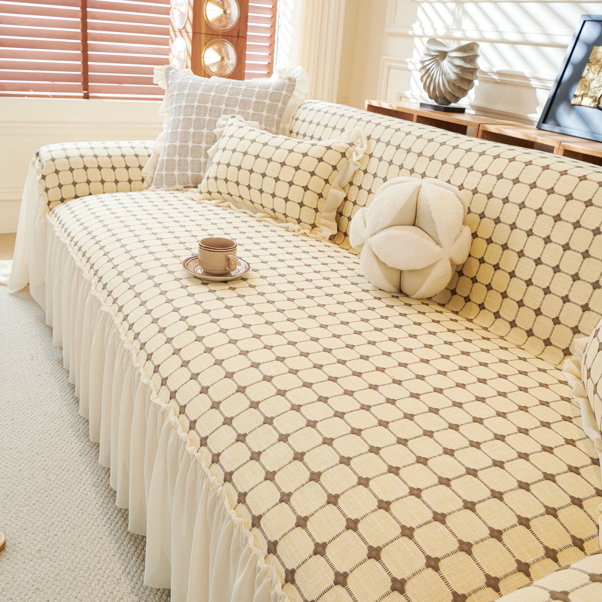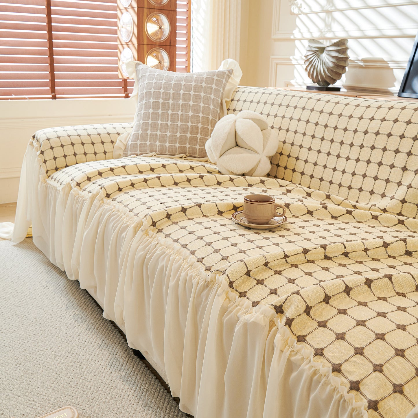 This sofa cover is made from a chenille woven fabric with a grid-textured surface, offering a soft yet structured feel. The lower edge is finished with a lightweight sheer ruffle skirt, adding a layered look without adding weight. The overall construction balances decorative texture with breathable comfort.