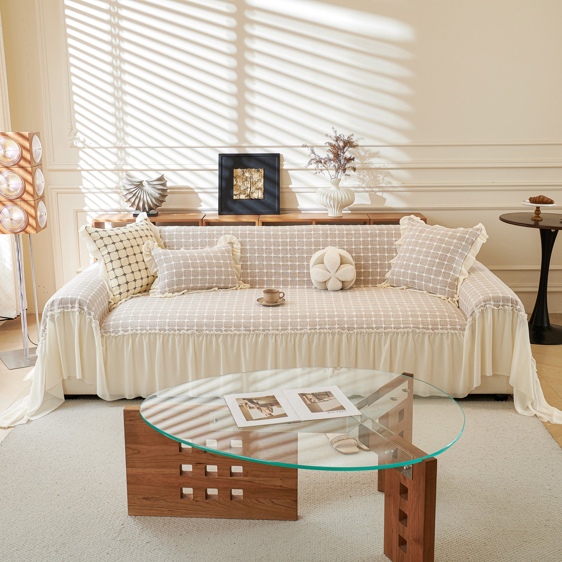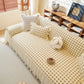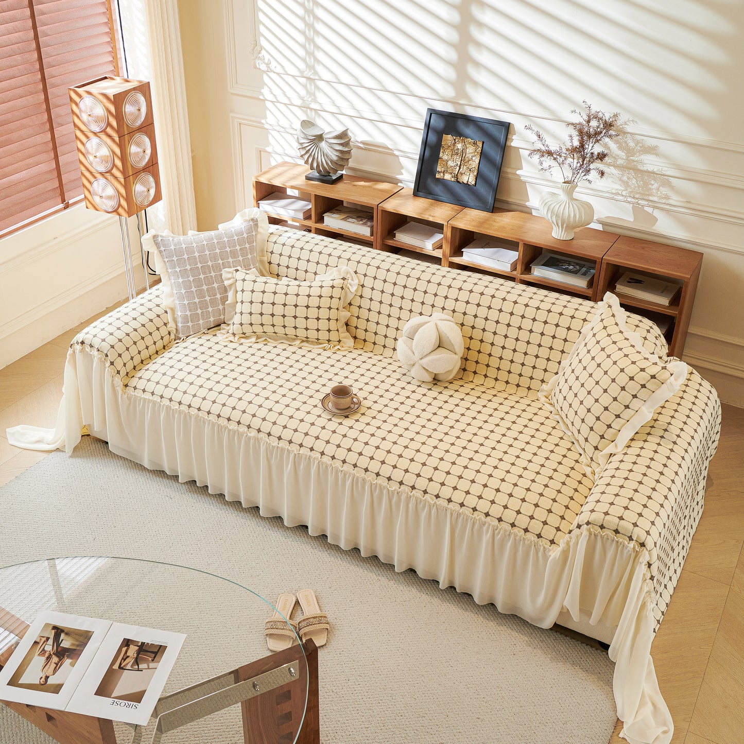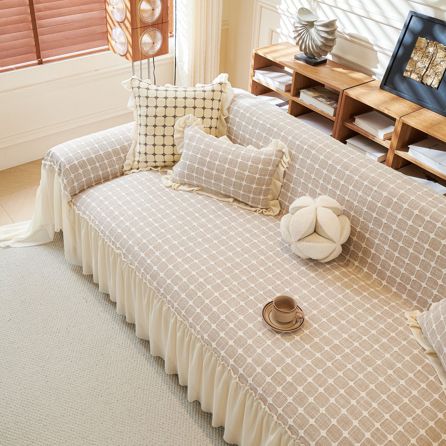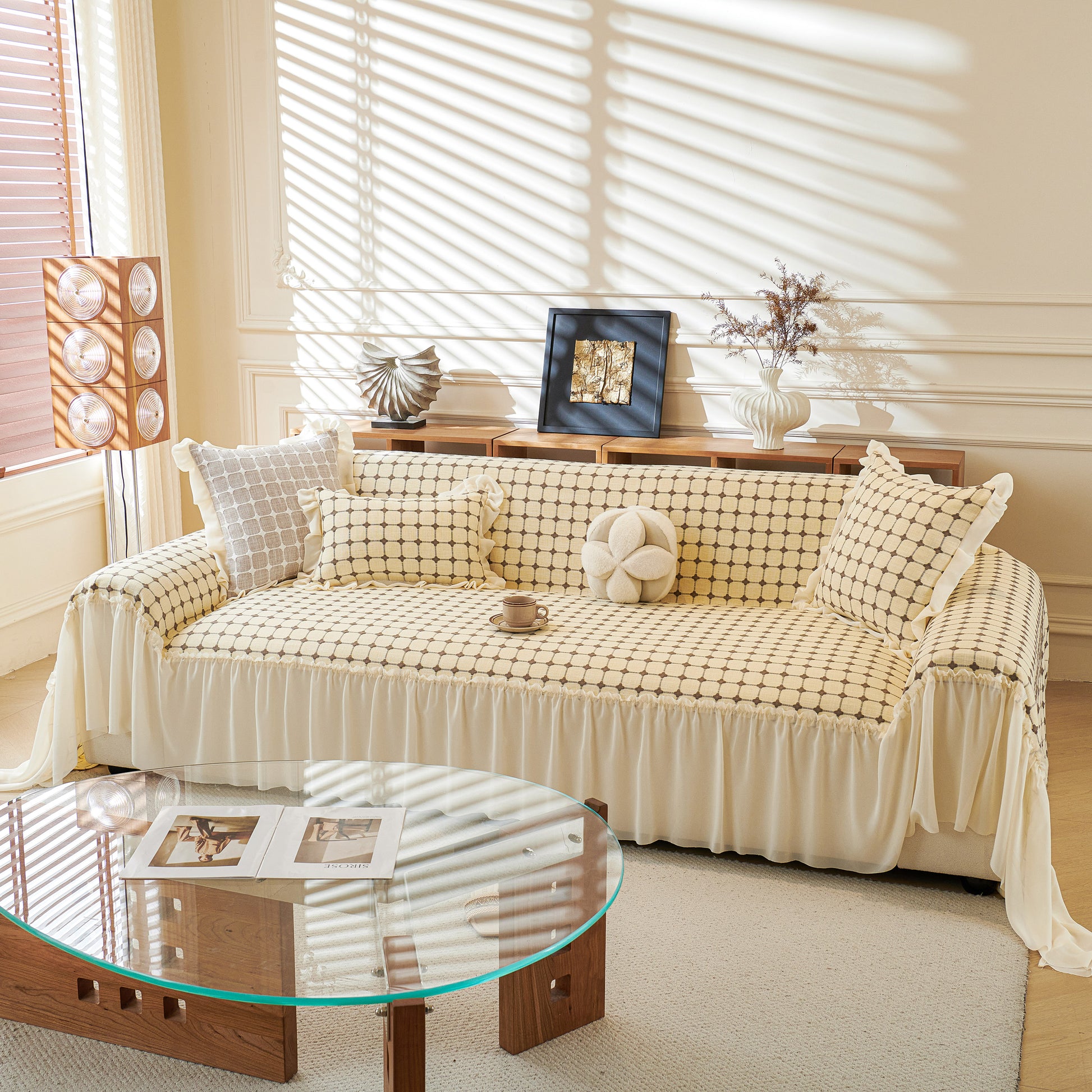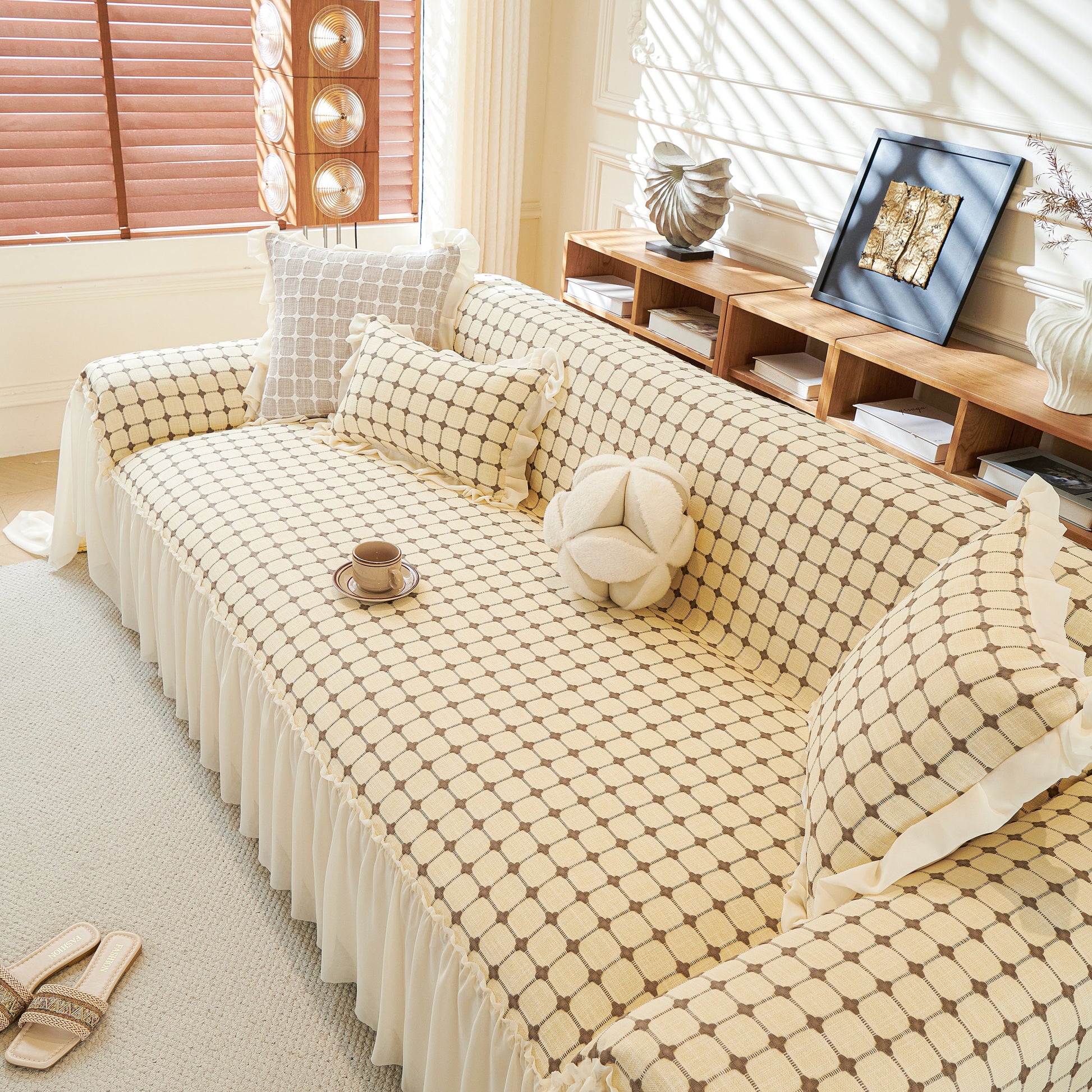 This sofa cover is made from a chenille woven fabric with a grid-textured surface, offering a soft yet structured feel. The lower edge is finished with a lightweight sheer ruffle skirt, adding a layered look without adding weight. The overall construction balances decorative texture with breathable comfort.