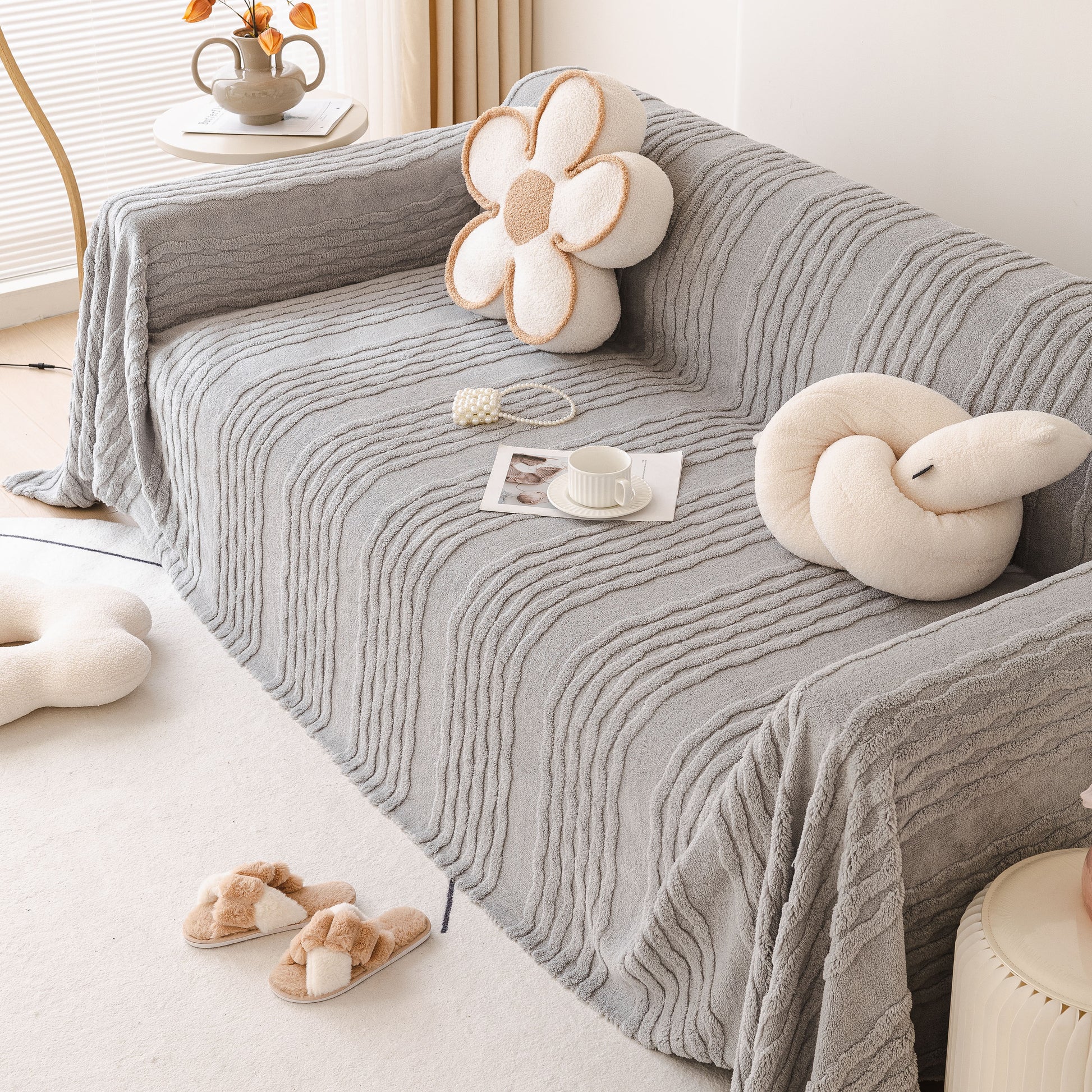 Transform your living space into a sanctuary of relaxation with our 3D Water Ripple Plush Sofa Cover. Inspired by the organic lines of flowing water and wind-swept sand dunes, this throw blanket features a sophisticated textured design that brings visual depth and a sense of calm to any room. The edges are finished with a delicate short fringe (raw hem), adding a touch of casual, "wabi-sabi" charm that softens the look of modern furniture.