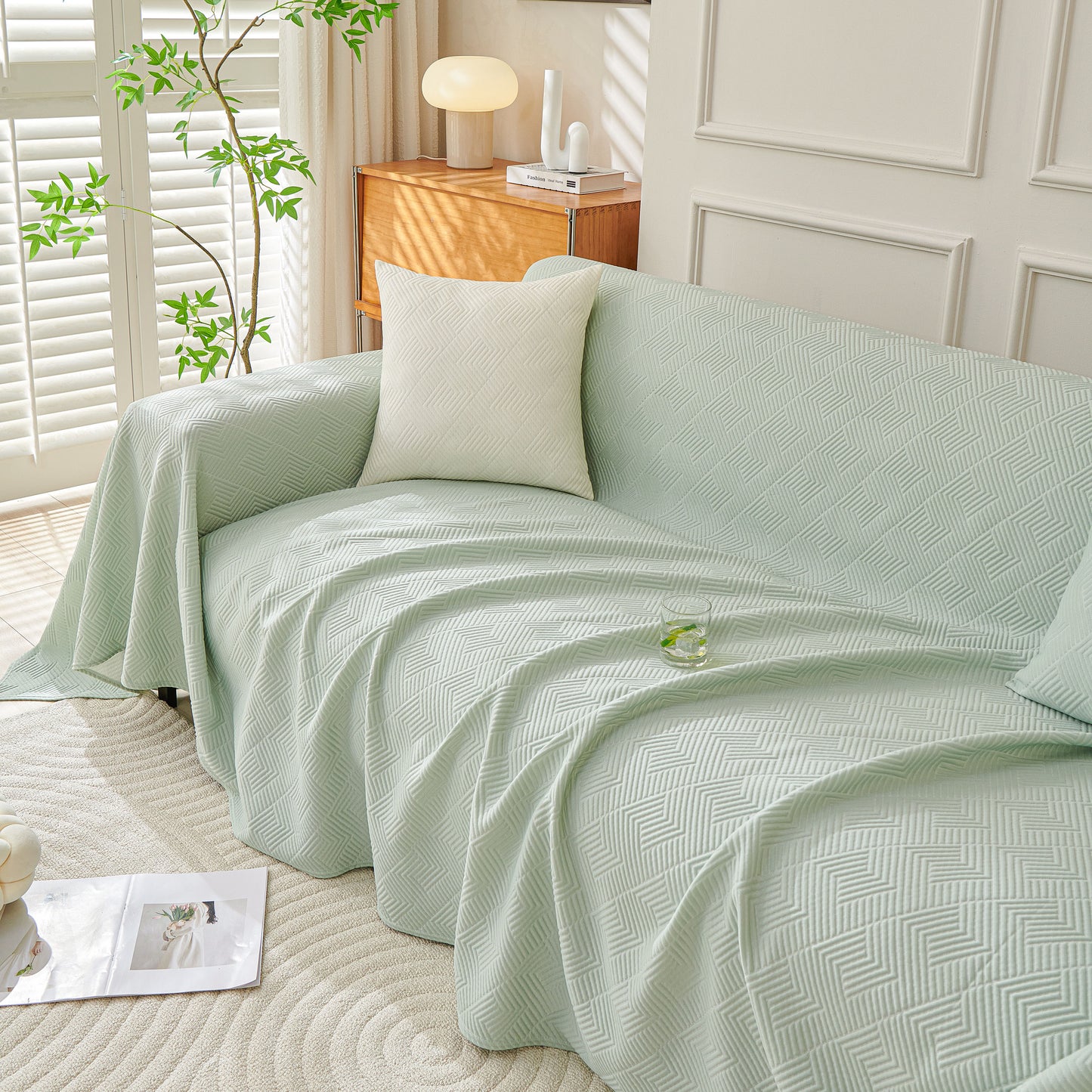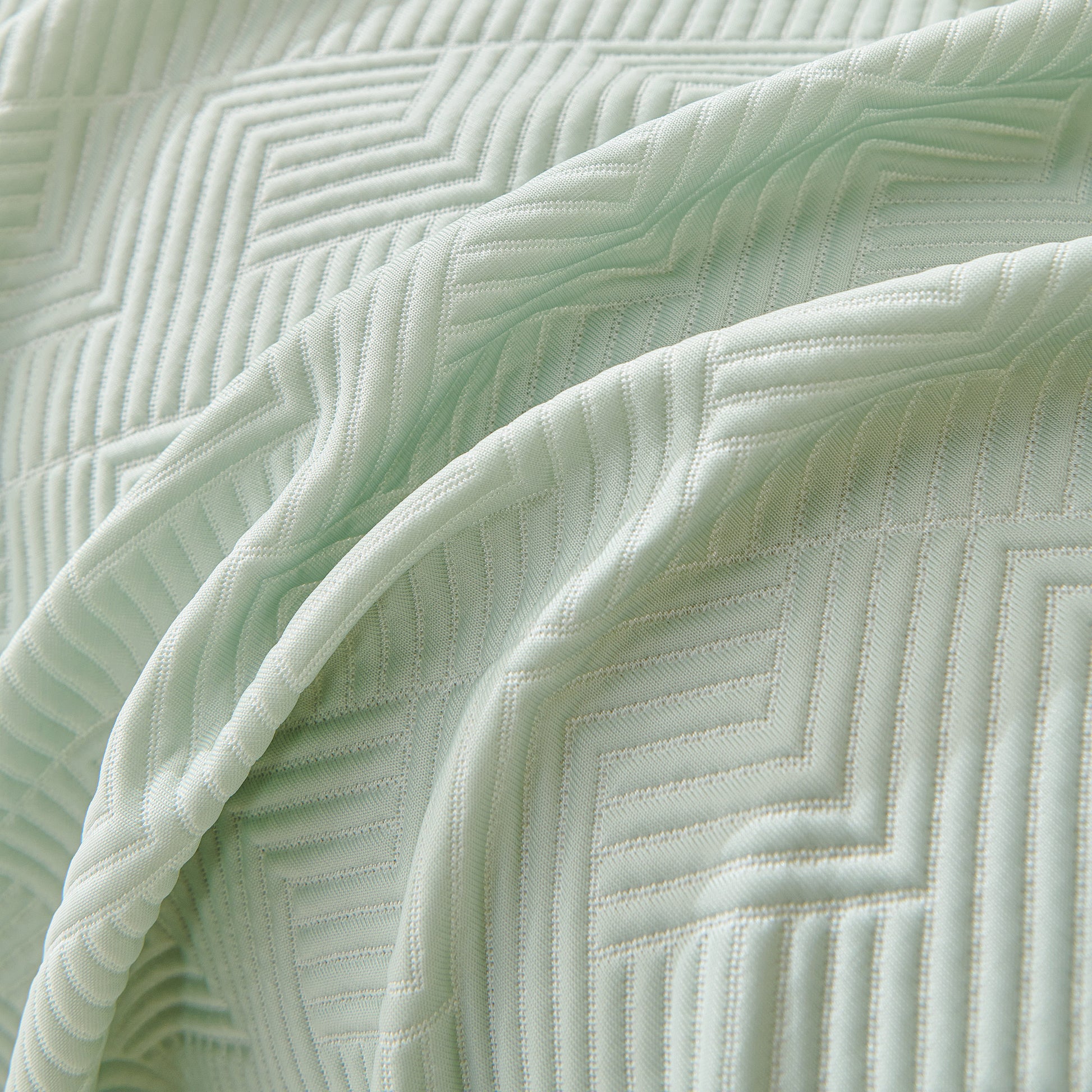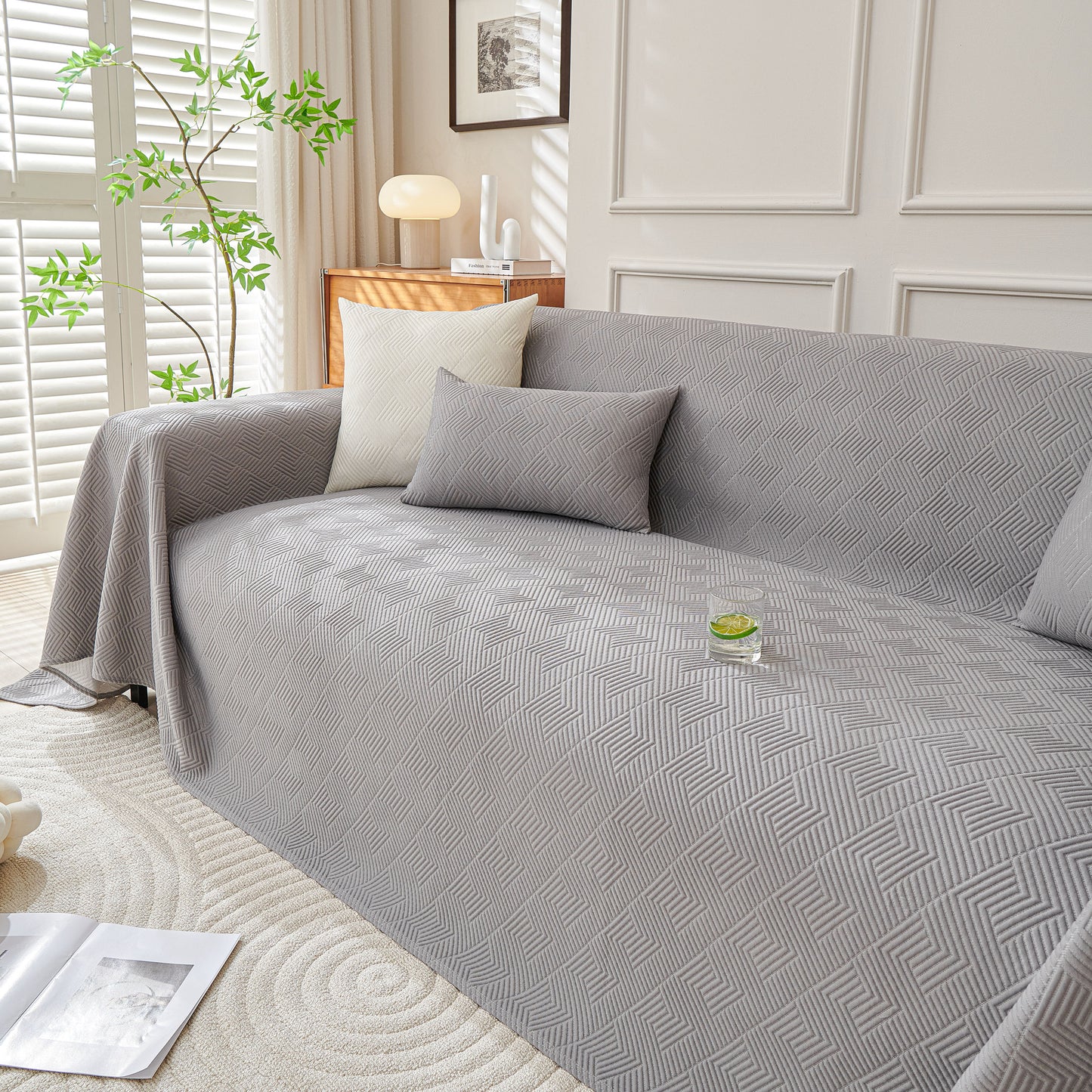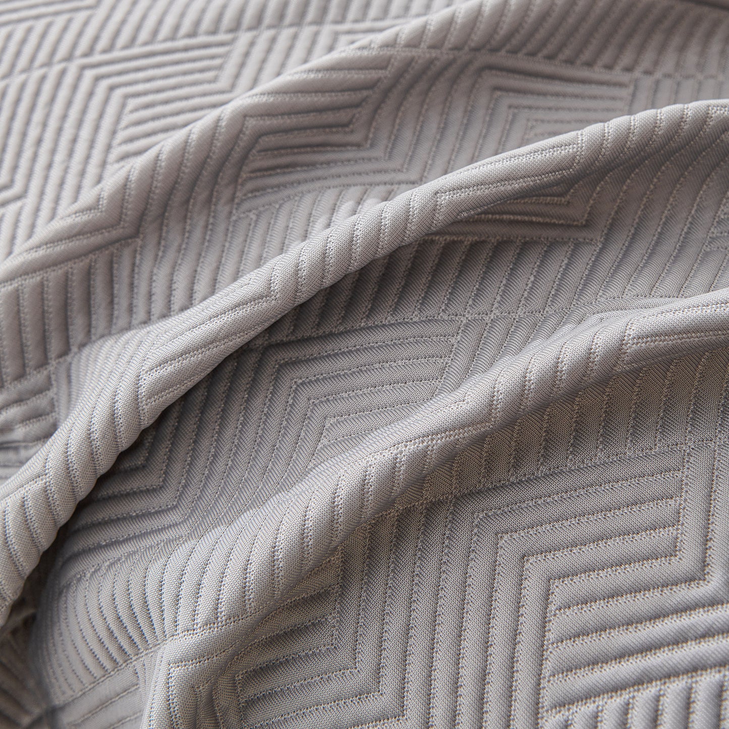 Esta capa de sofá é feita de tecido de seda de gelo, projetada para uso sazonal em ambientes mais quentes. O material tem uma estrutura densa e bem entrelaçada e uma superfície de toque suave com um padrão geométrico em relevo composto por formas quadradas e trapezoidais.
