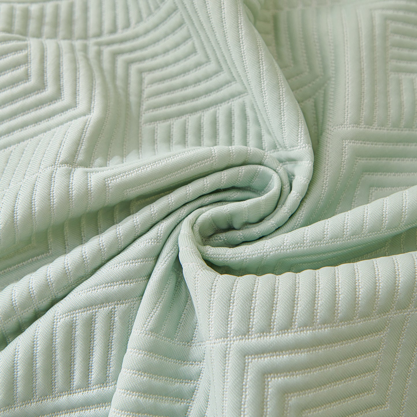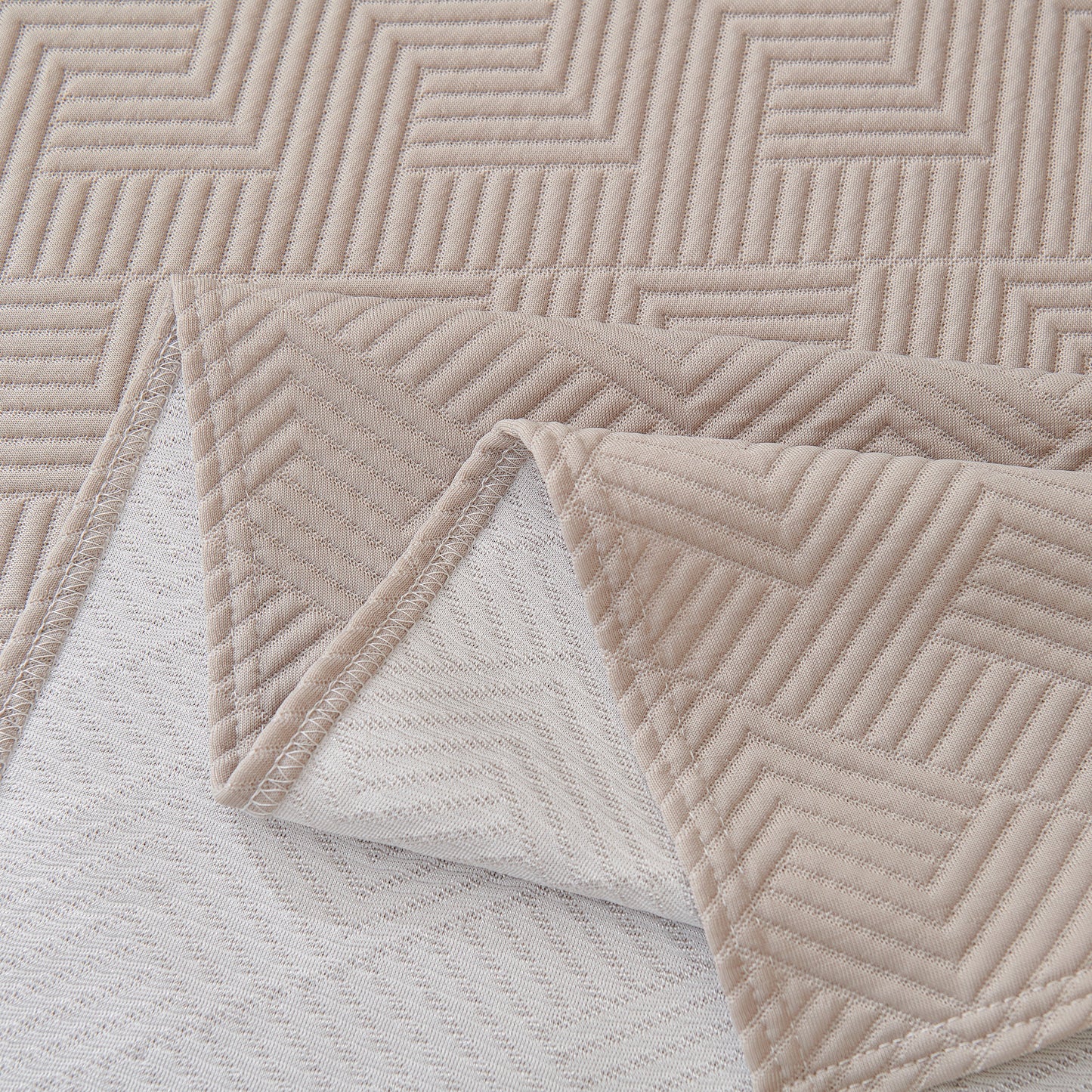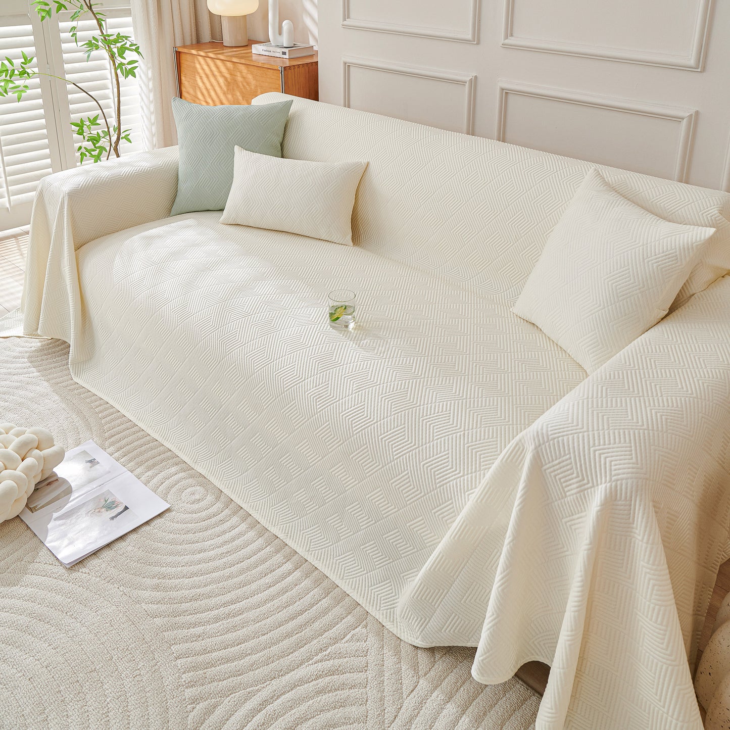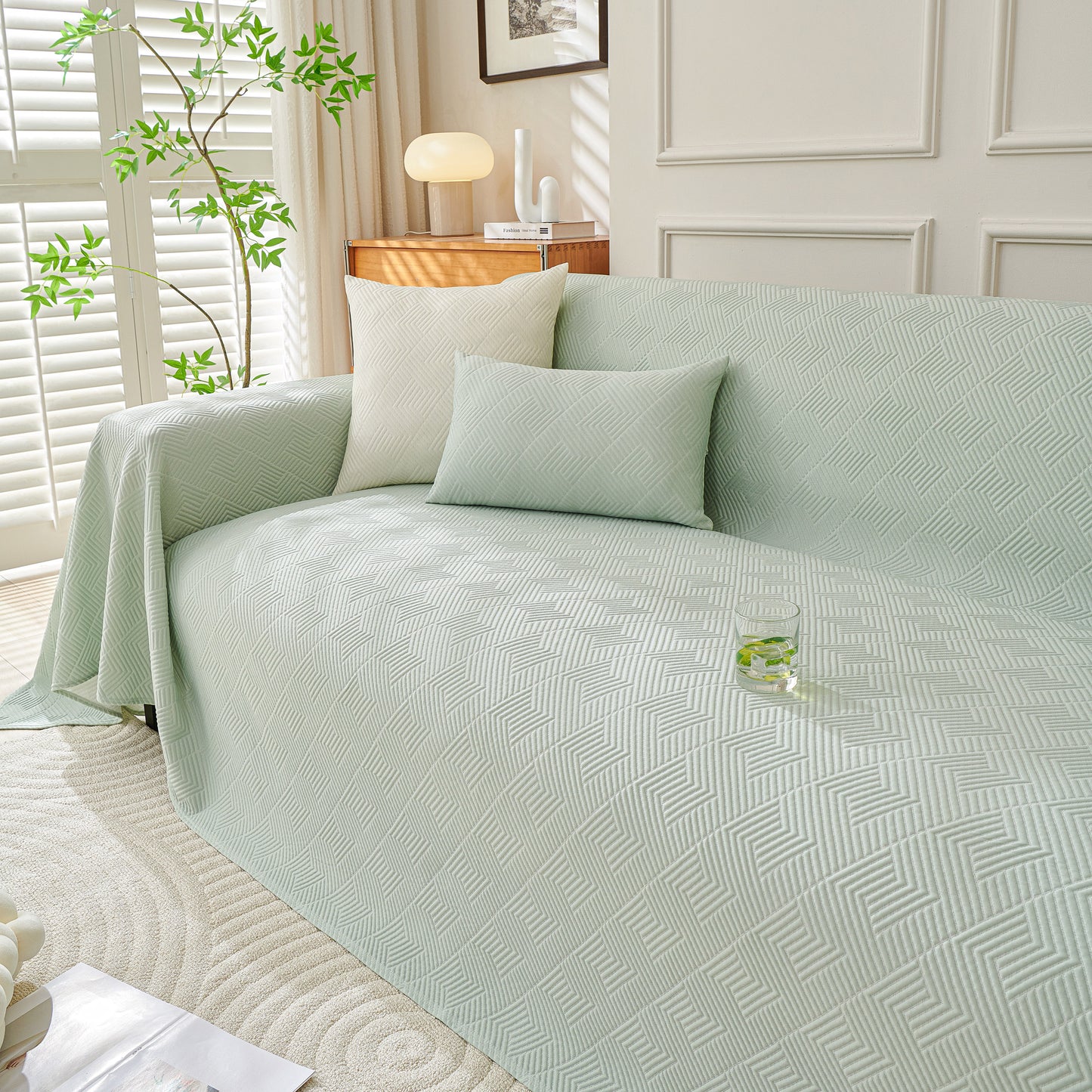 Esta capa de sofá é feita de tecido de seda de gelo, projetada para uso sazonal em ambientes mais quentes. O material tem uma estrutura densa e bem entrelaçada e uma superfície de toque suave com um padrão geométrico em relevo composto por formas quadradas e trapezoidais.