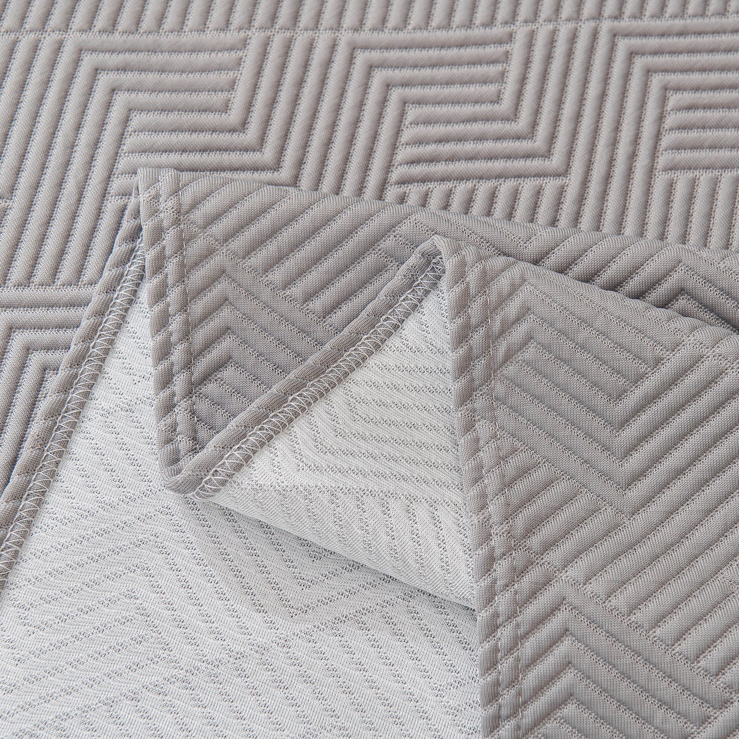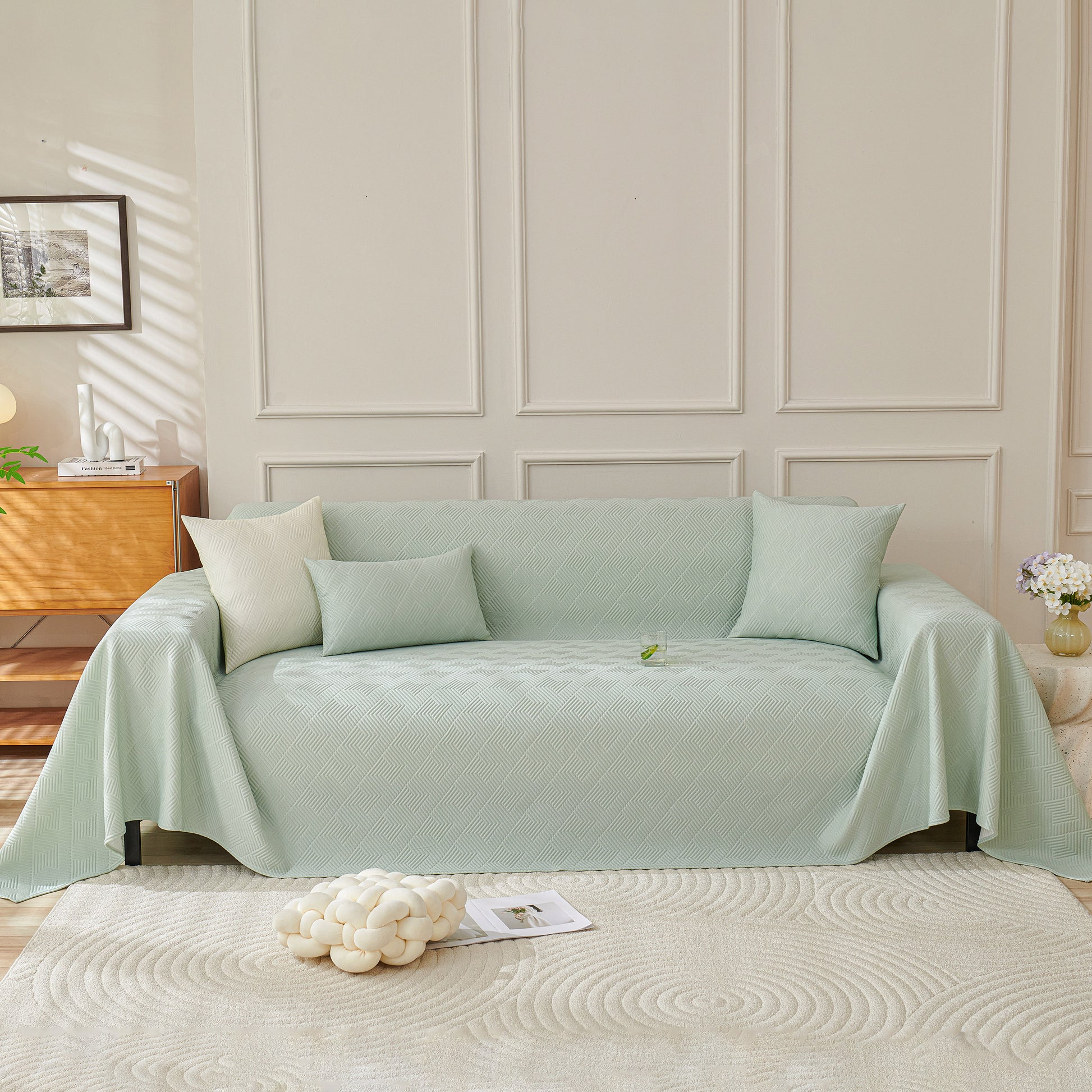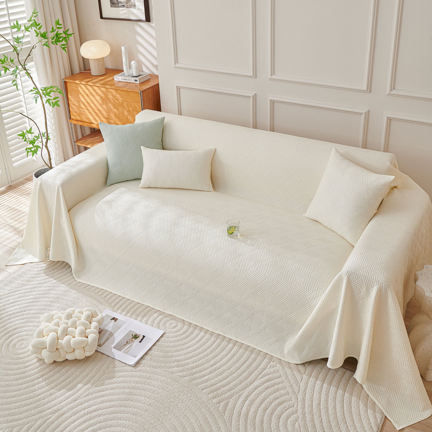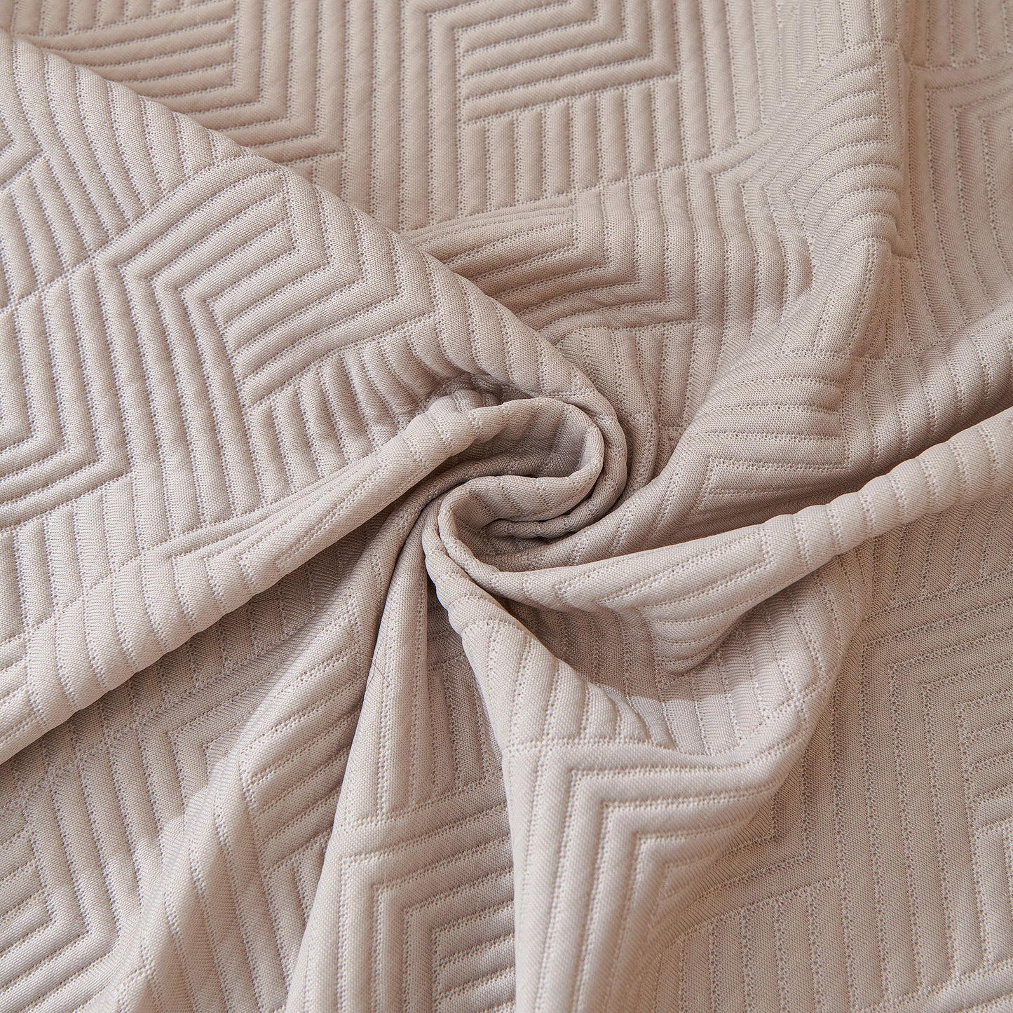 Esta capa de sofá é feita de tecido de seda de gelo, projetada para uso sazonal em ambientes mais quentes. O material tem uma estrutura densa e bem entrelaçada e uma superfície de toque suave com um padrão geométrico em relevo composto por formas quadradas e trapezoidais.