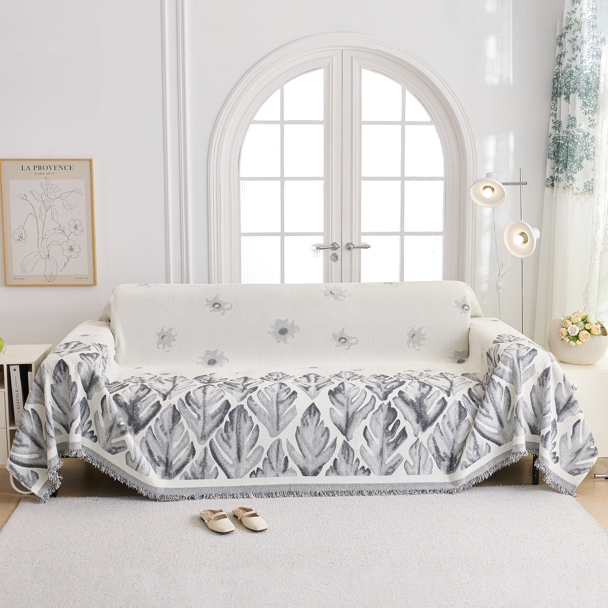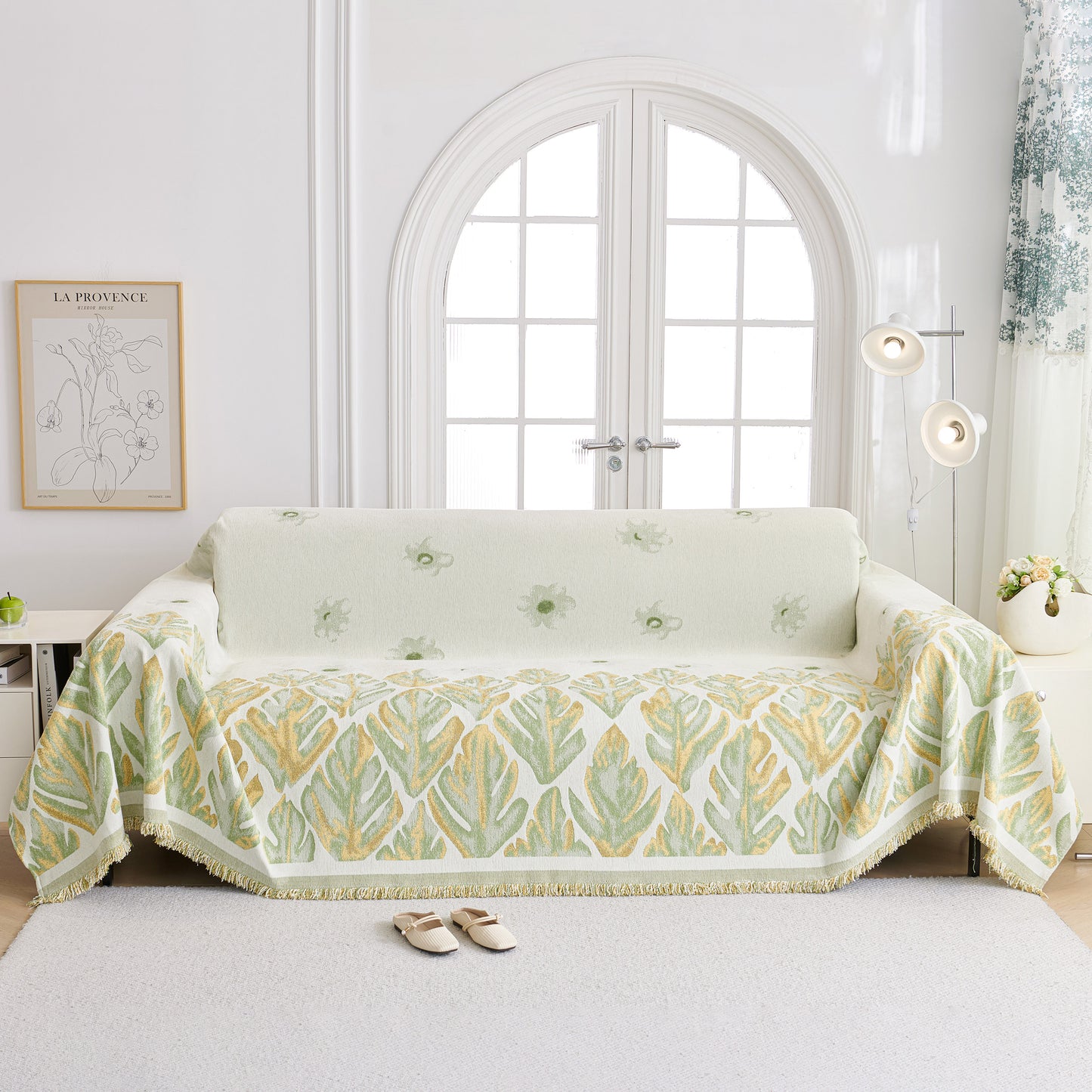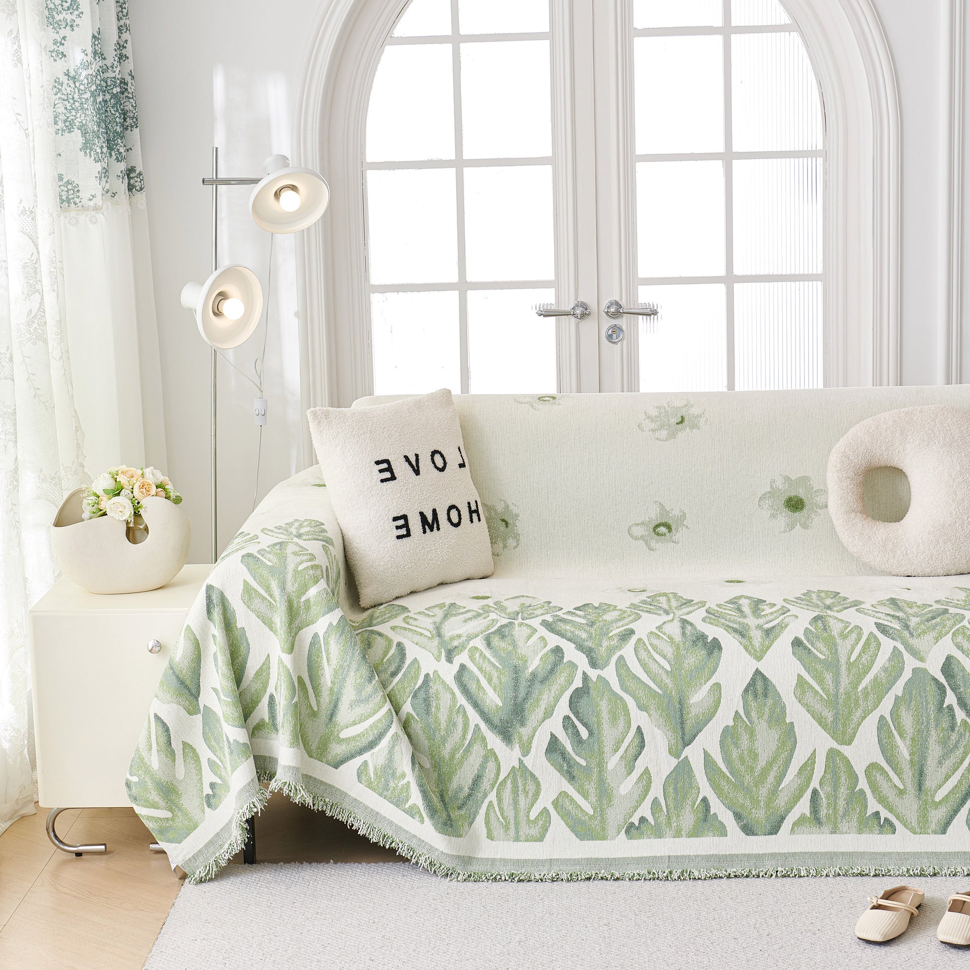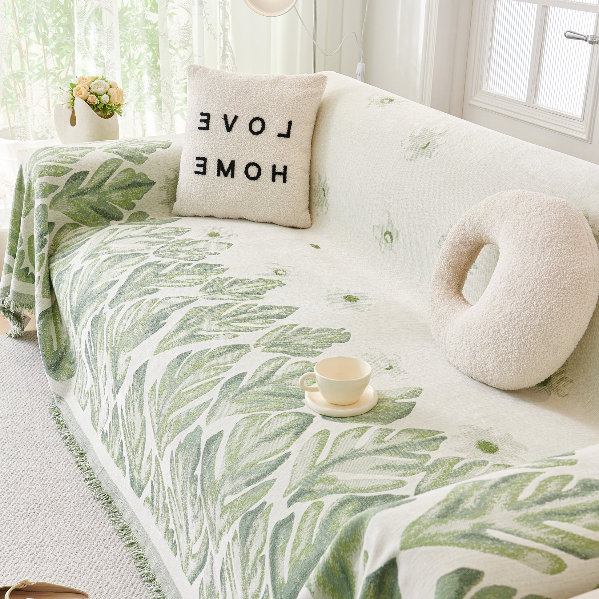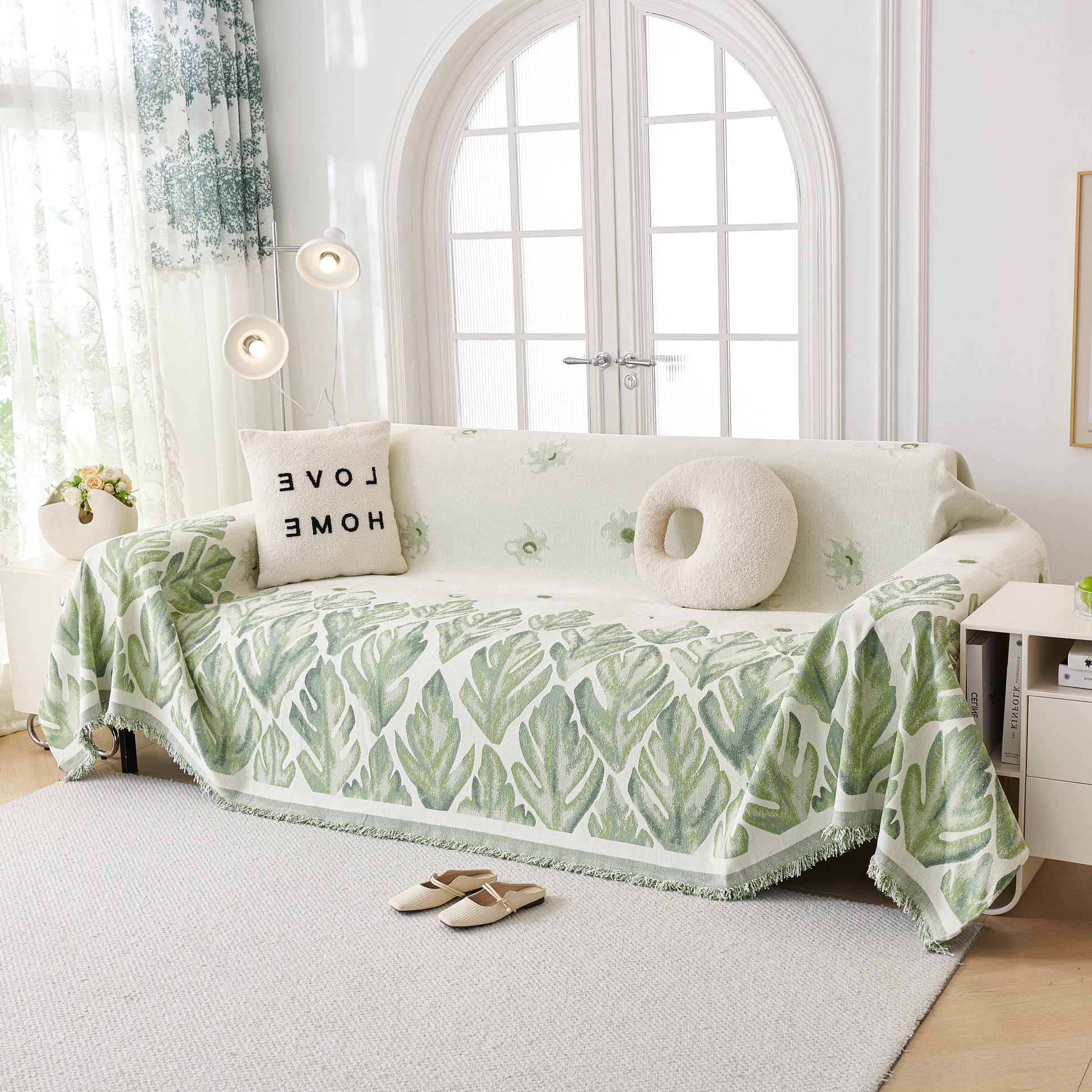 A parte da frente exibe um padrão de folhas em grande escala com uma estética pintada à mão, adicionando um toque de charme natural ao seu espaço. Projetado para cobrir a maioria das superfícies de sofás, ajuda a proteger contra poeira, manchas e marcas de garras. Versátil no uso, também funciona bem como um corredor de cama, manta para sesta ou tapete decorativo.