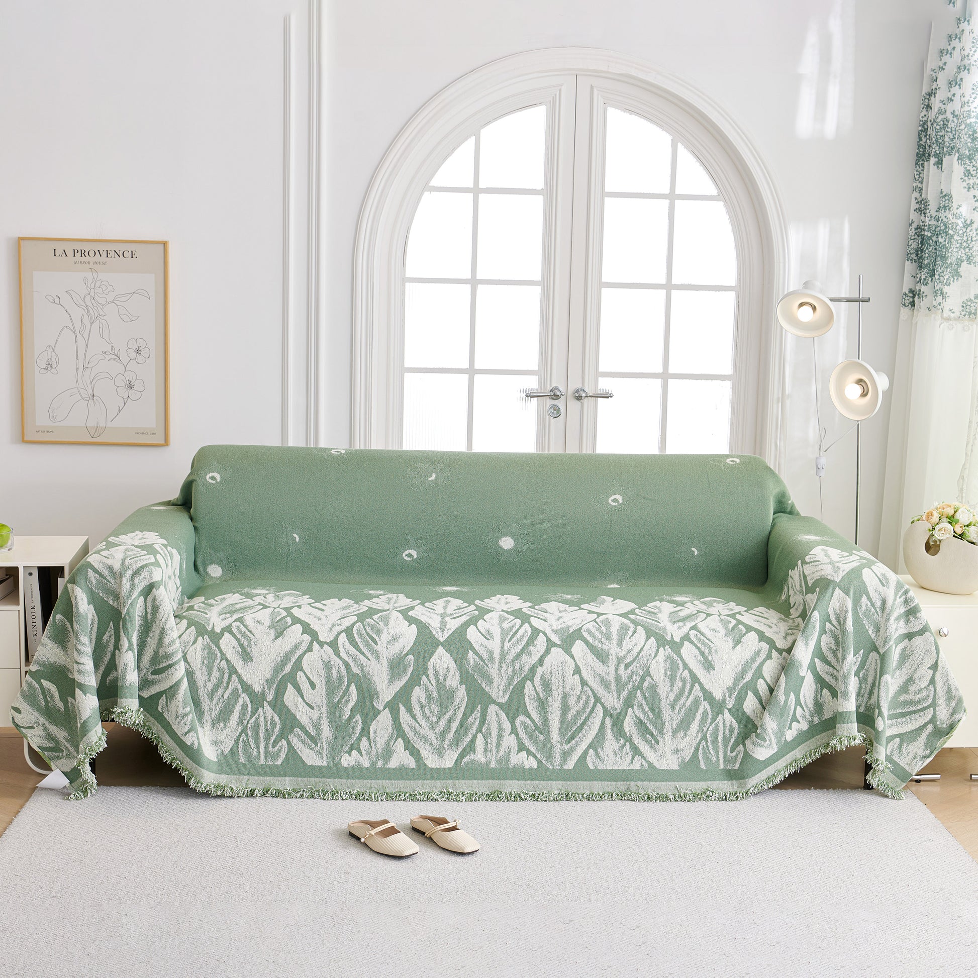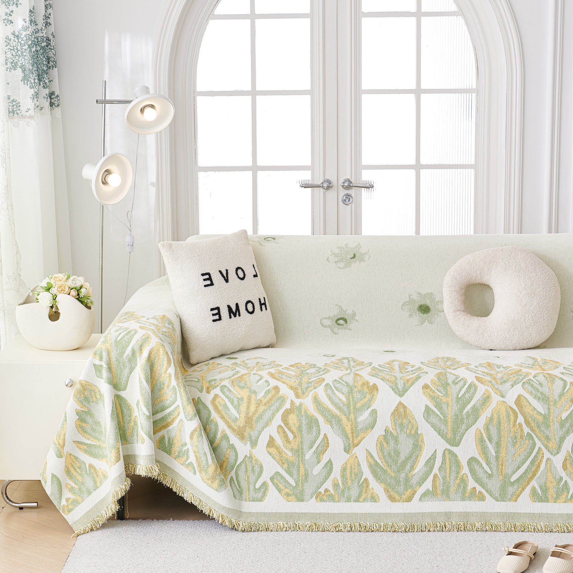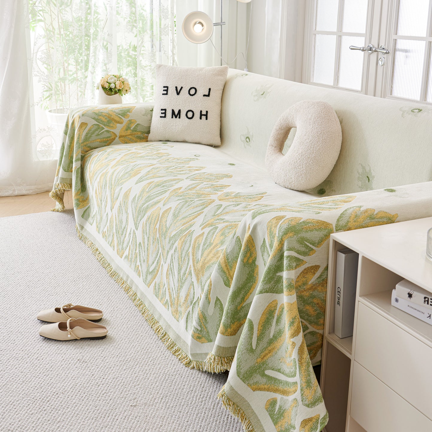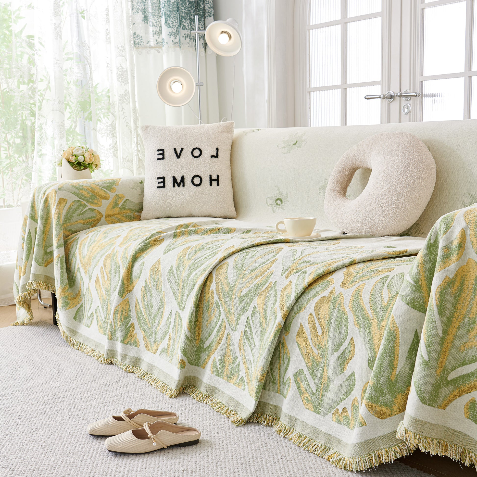 A parte da frente exibe um padrão de folhas em grande escala com uma estética pintada à mão, adicionando um toque de charme natural ao seu espaço. Projetado para cobrir a maioria das superfícies de sofás, ajuda a proteger contra poeira, manchas e marcas de garras. Versátil no uso, também funciona bem como um corredor de cama, manta para sesta ou tapete decorativo.