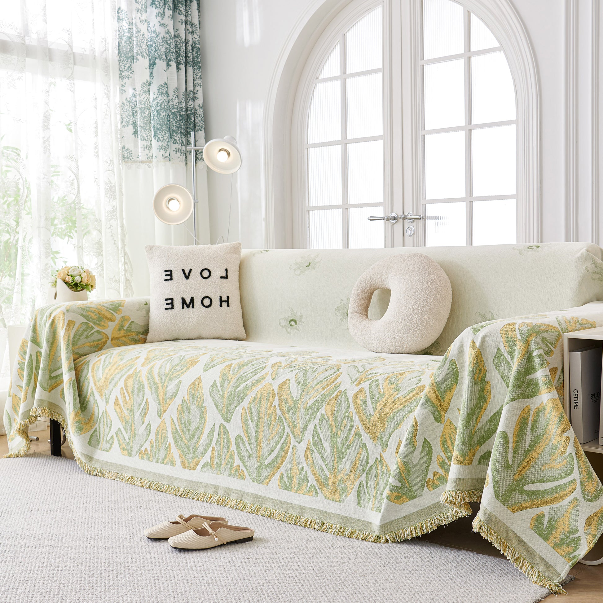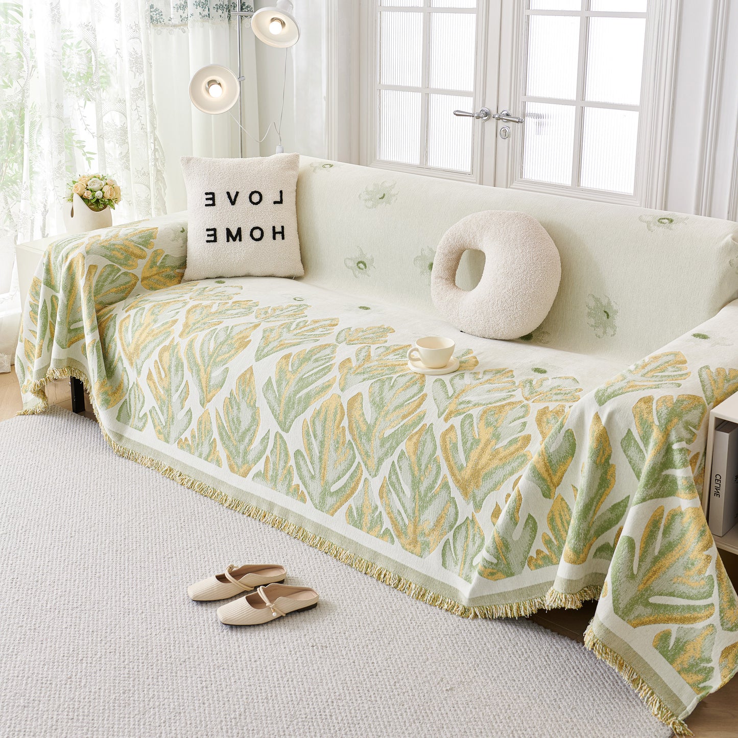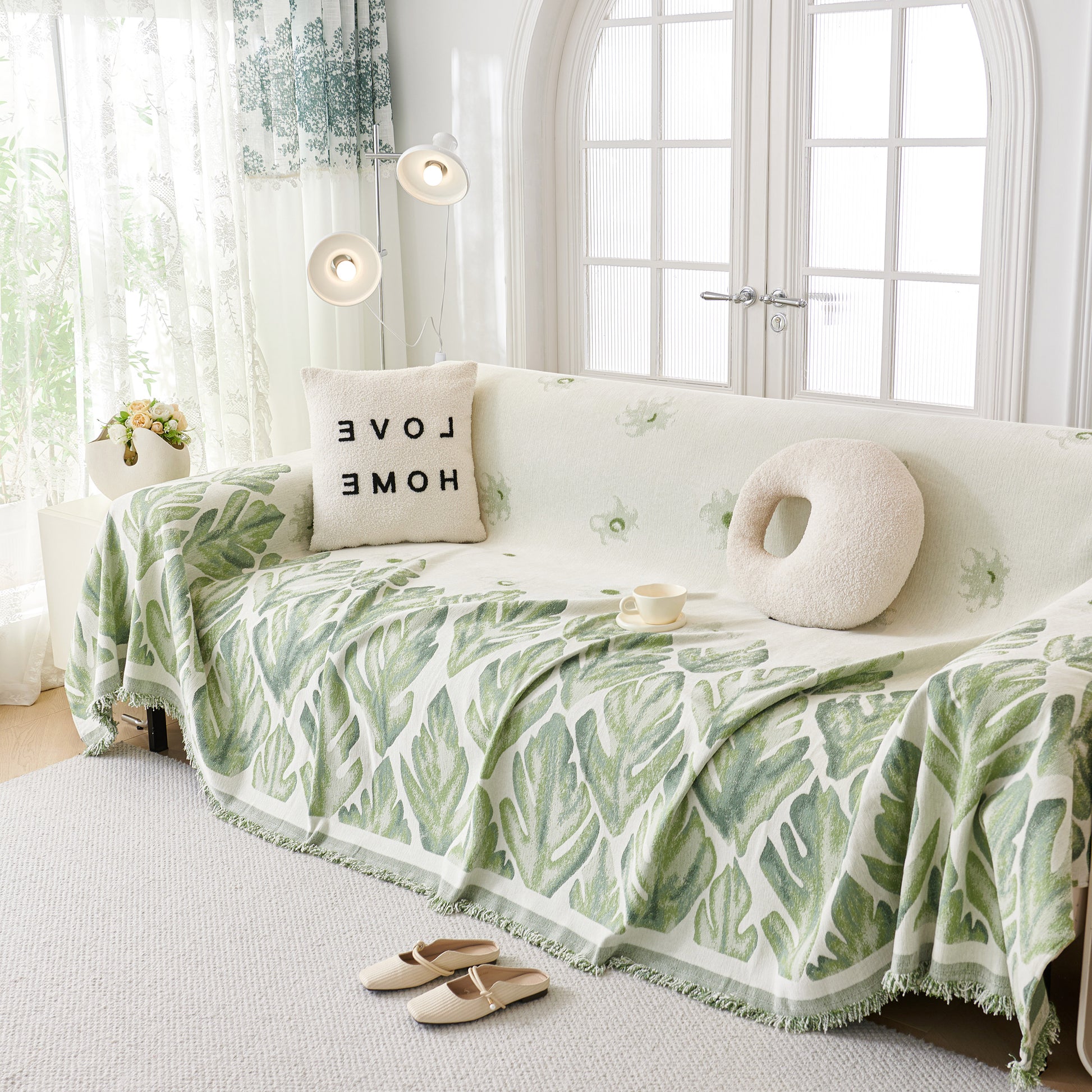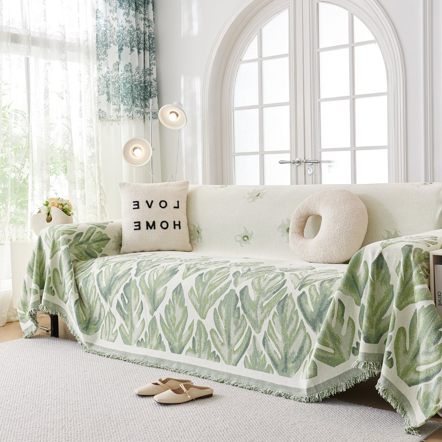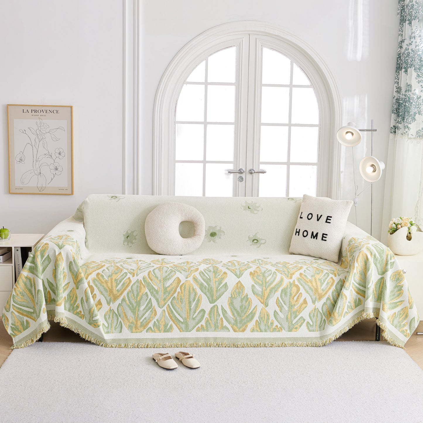 A parte da frente exibe um padrão de folhas em grande escala com uma estética pintada à mão, adicionando um toque de charme natural ao seu espaço. Projetado para cobrir a maioria das superfícies de sofás, ajuda a proteger contra poeira, manchas e marcas de garras. Versátil no uso, também funciona bem como um corredor de cama, manta para sesta ou tapete decorativo.