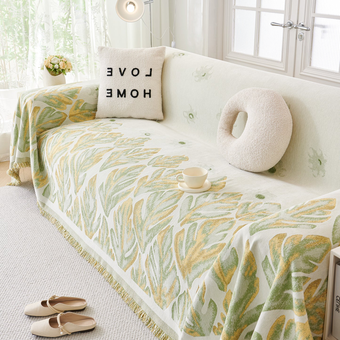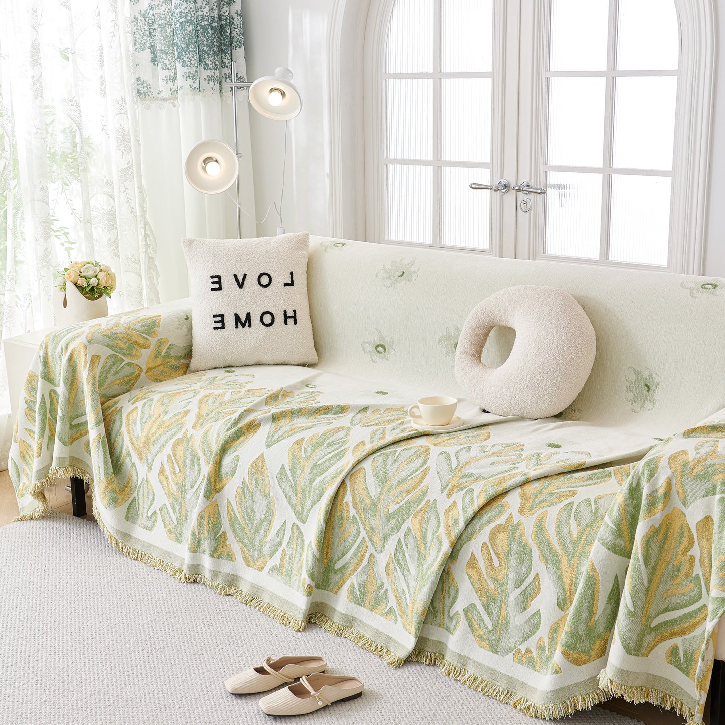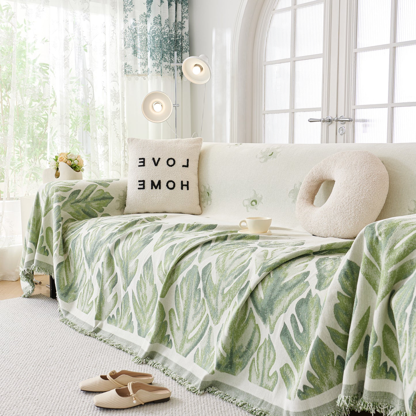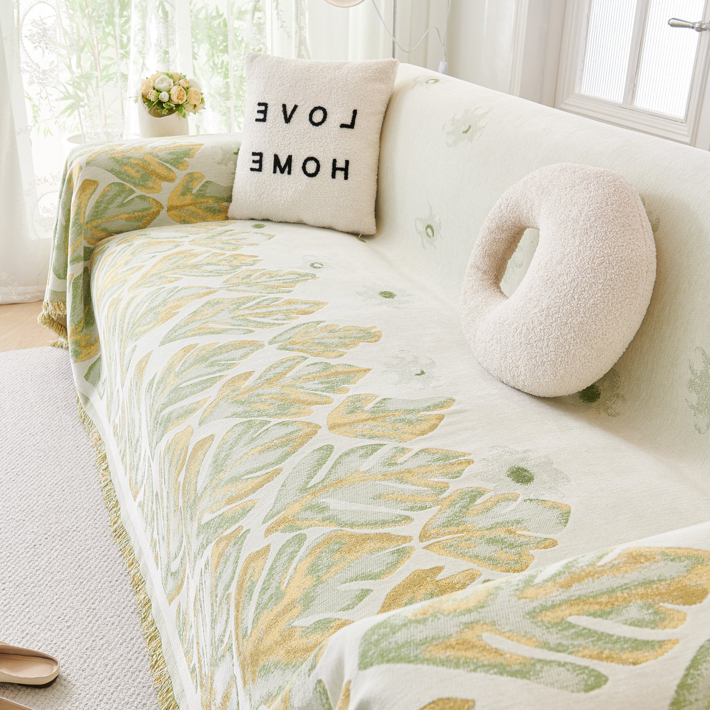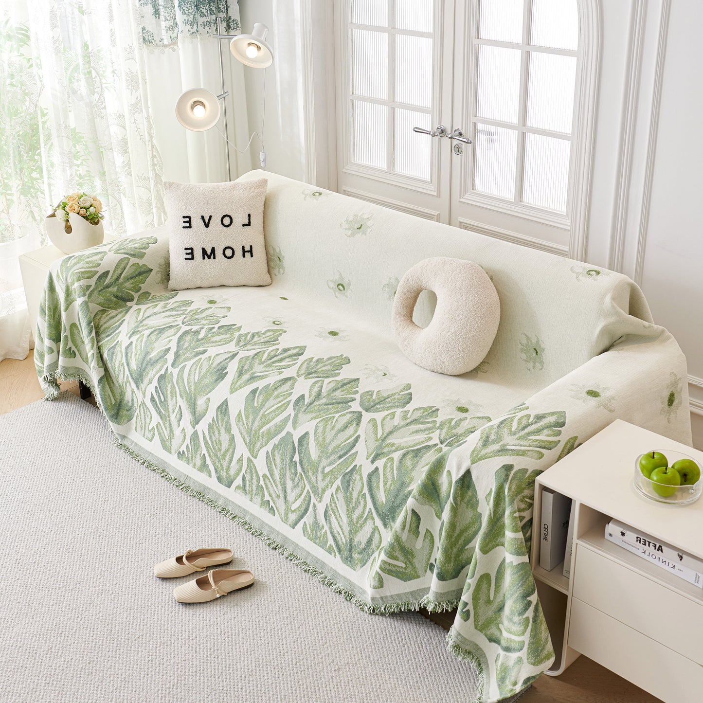 A parte da frente exibe um padrão de folhas em grande escala com uma estética pintada à mão, adicionando um toque de charme natural ao seu espaço. Projetado para cobrir a maioria das superfícies de sofás, ajuda a proteger contra poeira, manchas e marcas de garras. Versátil no uso, também funciona bem como um corredor de cama, manta para sesta ou tapete decorativo.