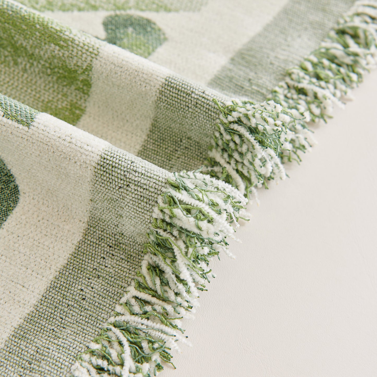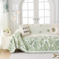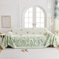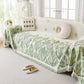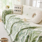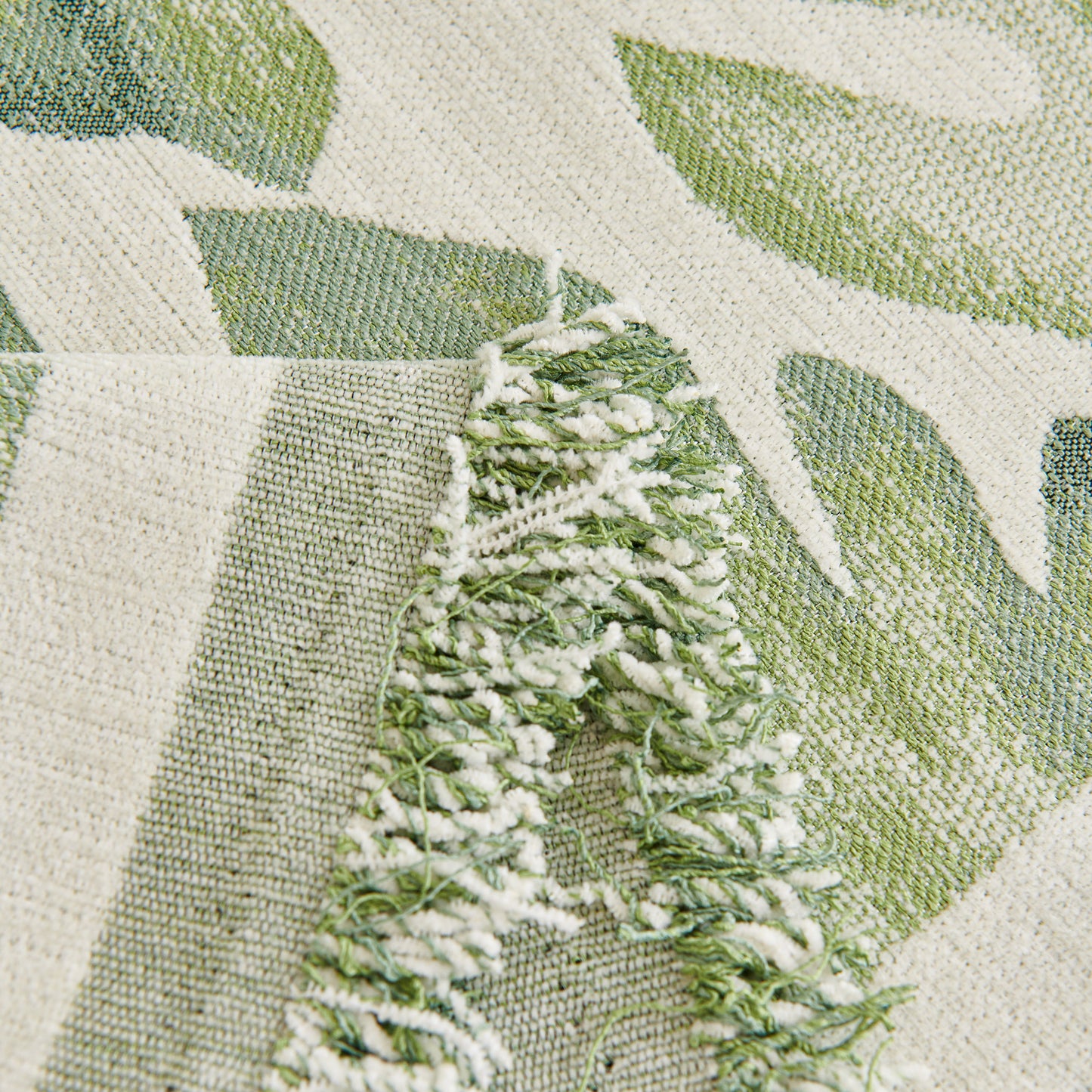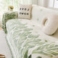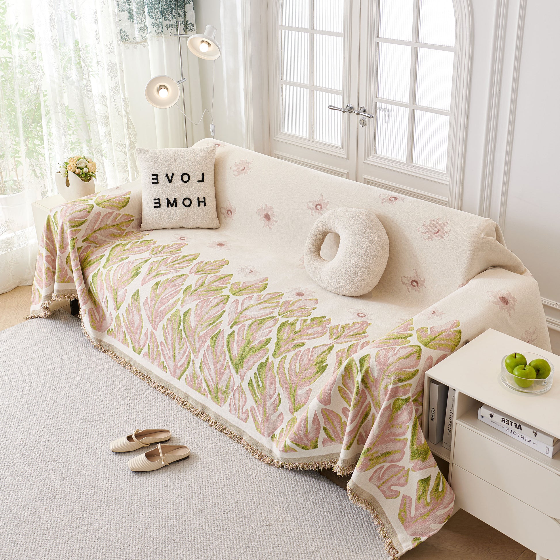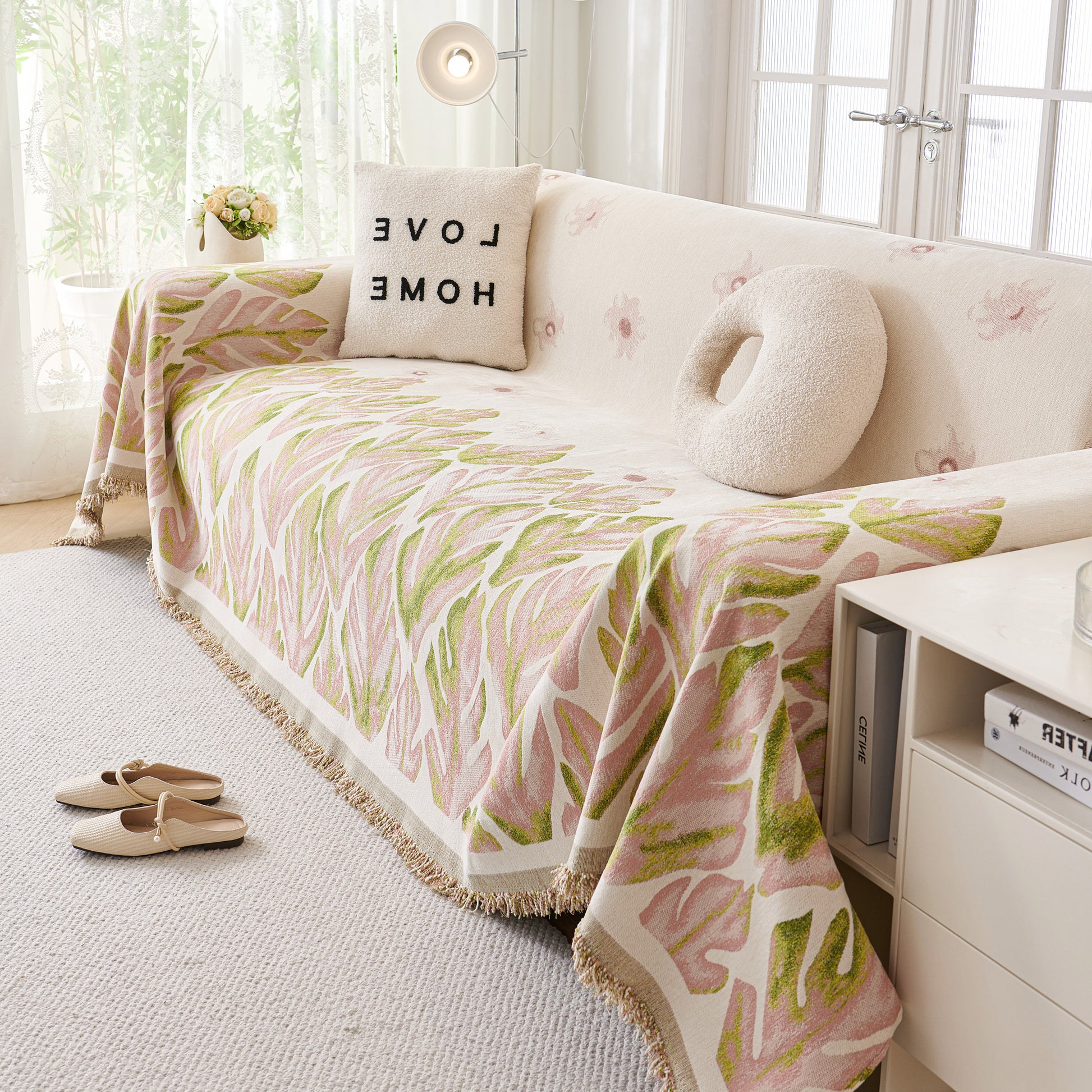 A parte da frente exibe um padrão de folhas em grande escala com uma estética pintada à mão, adicionando um toque de charme natural ao seu espaço. Projetado para cobrir a maioria das superfícies de sofás, ajuda a proteger contra poeira, manchas e marcas de garras. Versátil no uso, também funciona bem como um corredor de cama, manta para sesta ou tapete decorativo.